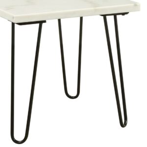 Marble Top End Table with Hairpin Style Metal Legs, White and Black- Saltoro Sherpi Add great style and functionality to your home dcor with the inclusion of this industrial design end table. Constructed sturdily from engineered wood with square marbleized top in a white finish and supported on black finish hairpin style legs which adds stability to the overall construction. This end table is stylish yet durable and can easily blend in with your existing furniture to enrich the appeal of your loving abode.