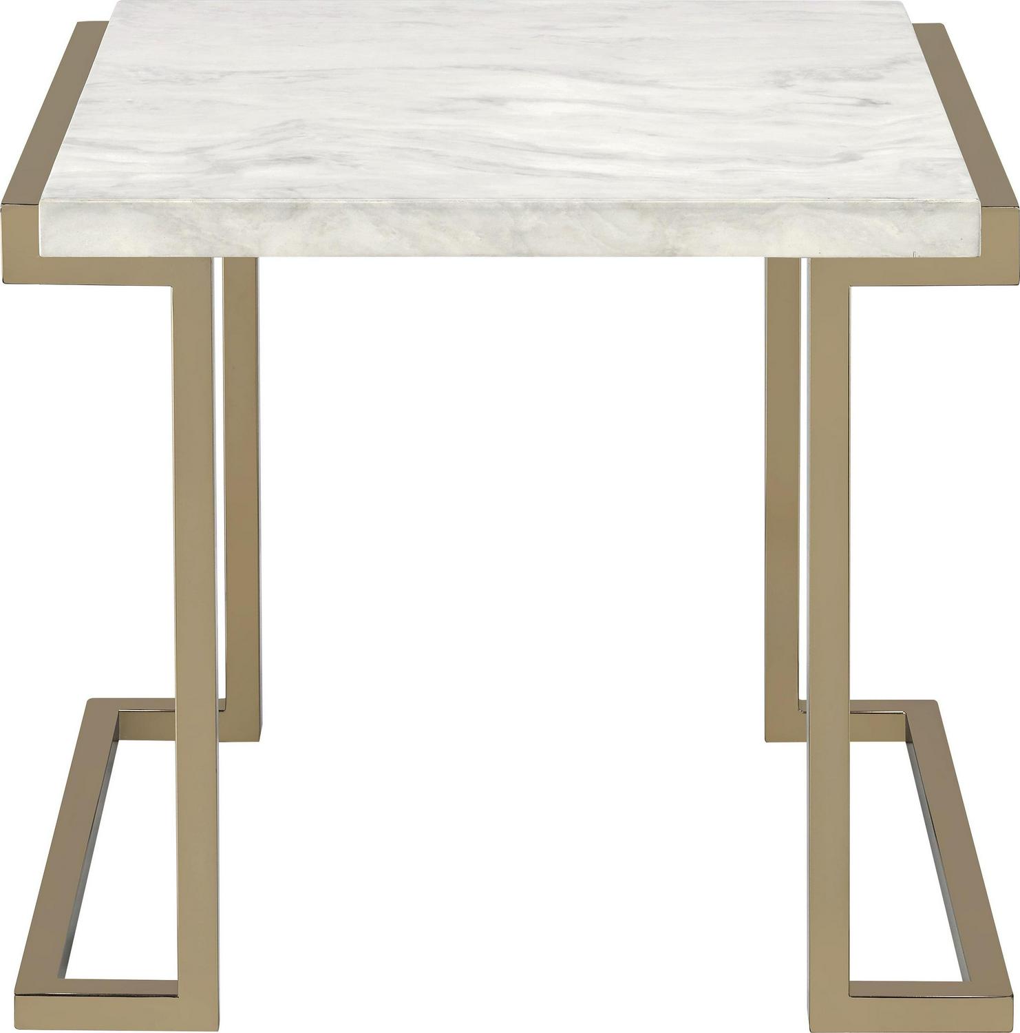 Marble Top End Table With Metal Base, White And Gold- Saltoro Sherpi This end table will become the most stimulating element of your living room. Crafted with marble and metal, this is accentuated with white finish top with gold finish sturdy metal legs that influences its look. Put this end table in your living room and this will not go unnoticed. This contrast color table can be used with any furniture style. Does not include any featured product other than one end table.