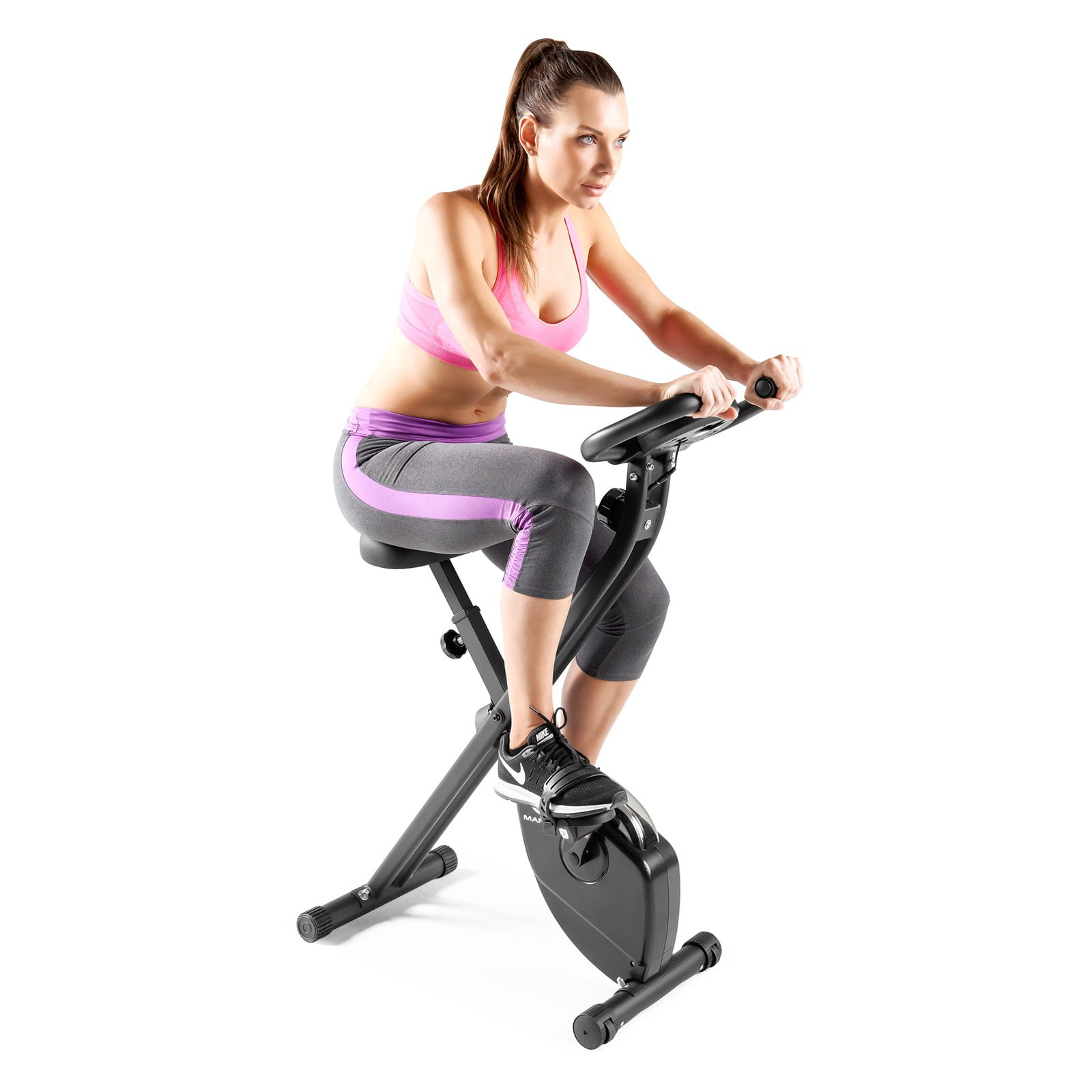 Bring the challenges and benefits of biking into your own home with the Marcy foldable 44. Get the toned calves and thighs you’ve always wanted! This exercise bike features manual control for resistance to match your fitness level. You will always be comfortable on the large, foam-padded seat which is also adjustable to suit your height. Track your stats on the LCD monitor that allows you to see time, distance, calories, and speed. This bike is foldable, so you can stow it away when you’re finished with your workout. Folded dimensions 52L x 16W x 14H in. Innovative frame design folds up for easy storage durable, powder-coated finish counterweighted pedals with adjustable foot straps eight resistance levels requires 2 AA batteries (not included)
