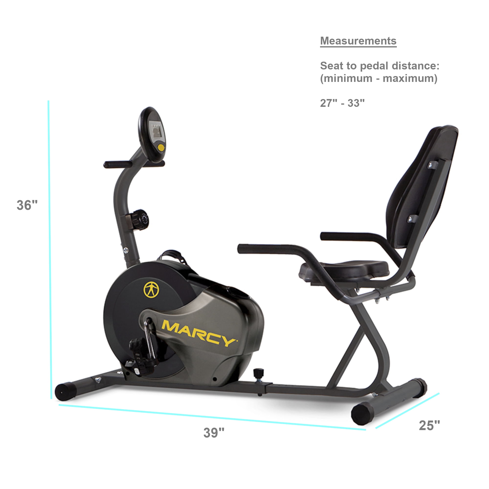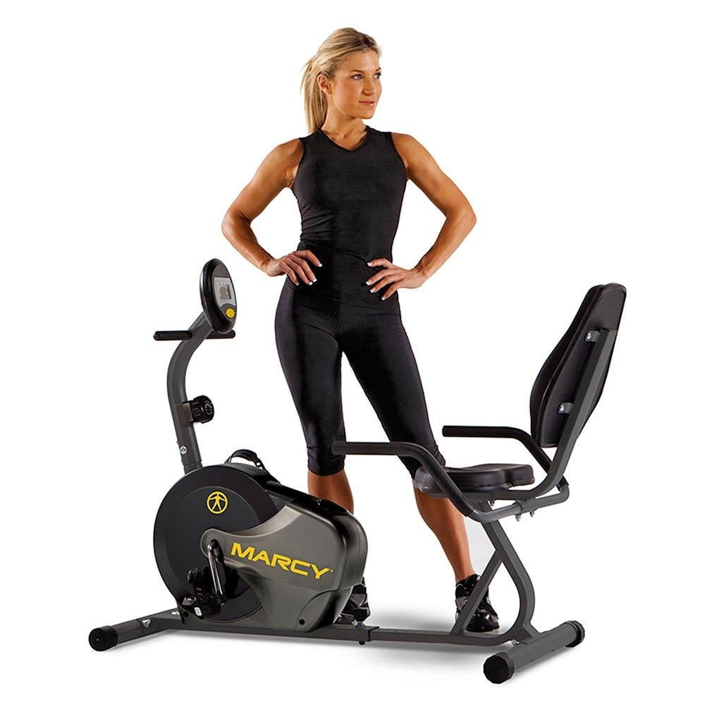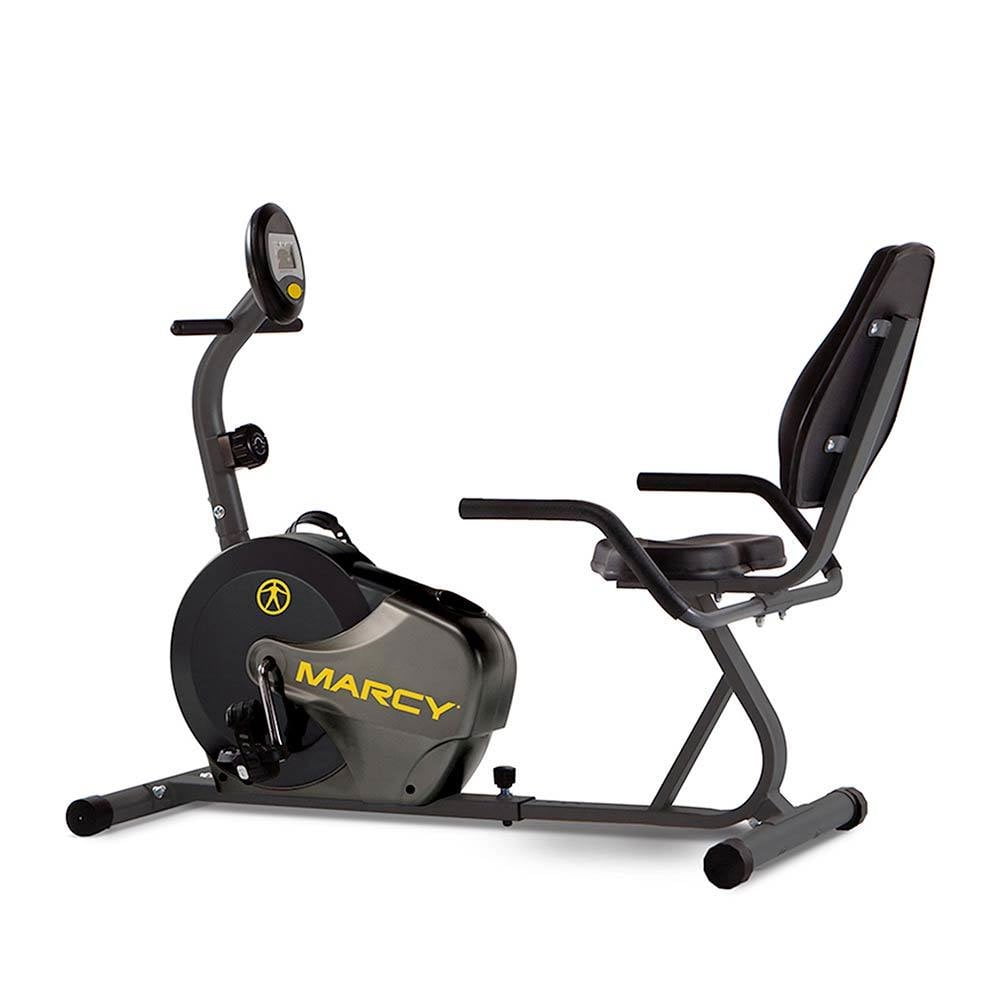 Get ready to kick your fitness into gear with the Marcy Pro Magnetic Resistance Recumbent Bike. This recumbent bike is just the thing you need to amp up your cardio. With 8 resistance levels to choose from, this bike is perfect for both the beginning biker and pedaling pro. You’ll be able to start and stop your workout with ease, thanks to the step-through frame that makes getting on and off hassle free. Ride comfy with foam-covered handlebars, adjustable stride length, and an ergonomically designed seat that encourages proper posture and supports your lower back. Track your progress and reach your fitness goals with the LCD screen that displays speed, distance, calories, time, and more. You’re supposed to break a sweat during your workout, not while putting your workout equipment away, which is why this stationary cardio bike features wheels for easy transportation and storage.