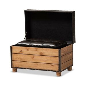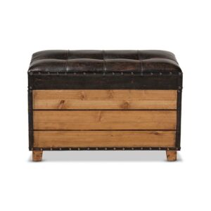 Marelli Rustic Dark Brown Faux Leather Upholstered 2-Piece Wood Storage Trunk Ottoman Set Rustic flair and versatility make the Marelli storage ottoman set a cool addition to any space. Featuring one large ottoman and one small ottoman, each piece in this set is constructed from vertical, natural finished wood panels that evoke a charming cabin feel. The top of each ottoman, upholstered in distressed dark brown faux leather, can be flipped up to reveal a spacious inner storage compartment. Combining elements of both rustic and refined style, the Marelli pieces display biscuit tufting on the seat, as well as antique bronze nailhead trim. Tapered legs complete the look. The Marelli storage ottoman set is made in China and will arrive fully assembled.