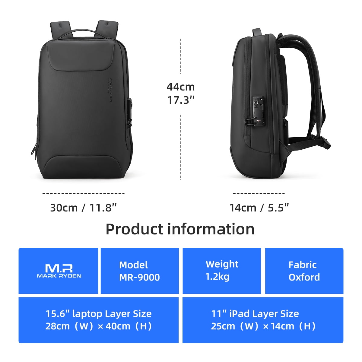SPECIFICATION: 1.Slim hard shell stylish technical backpack 2.TSA lock 3.USB charging plug(Notice: With built in USB charger outside and built in charging cable inside,but powerbank is not included). 4.Slim technical safty backpack with high quality YKK zipper.(This backpacks use the world-famous YKK zipper, and the zipper surround is Repeat reinforcement, strong and durable) 5.Up to 15.6 inch Laptop pocket and 11 inch ipad pocket 6.Invisible anti-theft back pocket ▶ [Specifications] The size is 44cm * 30cm * 14cm. It weighs only 1.2kg . One separate laptop compartment hold 15.6 Inch Laptop&11 inch ipad.The front pocket can easily store your daily items, keeping your things organized and easy to find. ▶ [High-quality accessories]★The surface of this backpack is made of waterproof nylon material, waterproof and easy to care. When it gets dirty, it can be wiped off with a wet wipe.★This backpacks use the world-famous YKK zipper, and the zipper surround is Repeat reinforcement, strong and durable. ▶ [USB Plug] The USB port allows you charge your phone at anytime and anywhere without take the powerbank out.(Notice: With built in USB charger outside and built in charging cable inside,but powerbank is not included). ▶ [Application ]There is an invisible zipper pocket on the back, because it fits to your waist, you can protect your valuables from thieves.Strap on the backside make it fixed on a trunk when you go on a long journey. ▶ [Product Quality] We are committed to quality and inspection, but if there are any defects or flaws during the transportation and use of the product, please contact us immediately by email. About us: Our shop include Laptop bags, casual backpacks, daypacks, travel bags, outdoor bags, school backpacks, rucksacks, messenger bags, waist packs and so on. The design style of OUR PRODUCT is business, casual and simple, but it can be used for school, commuting, travel, dating and parties. Our bags are upgraded to keep up with global fashion. And we develop our bags by studying the feedback data received from our customers. Product Quality:We are committed to quality and inspection, but if there are any defects or flaws during the transportation and use of the product, please immediately email to us.