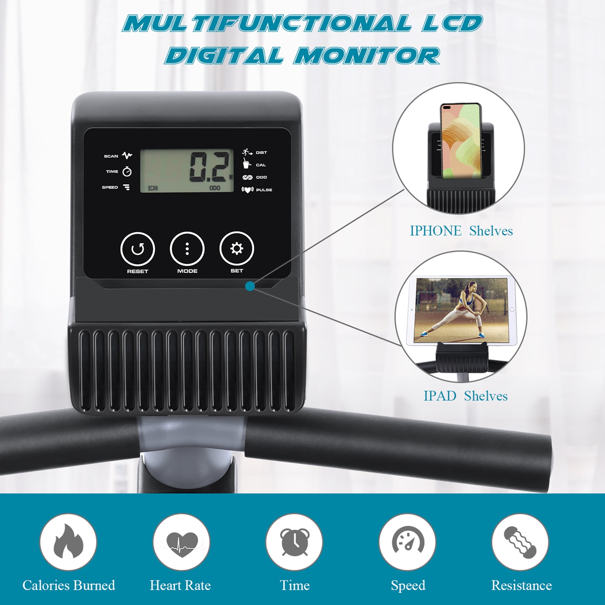 8-LEVEL MAGNETIC RESISTANCE Our recumbent exercise bike with 8-level adjustable resistance which can customize your own exercise difficulty. Silent Magnetic Resistance helps make each adjustment smooth and quiet. Inertia-enhanced flywheel gives you a smooth and more natural-feeling ride. ADJUSTABLE SEAT & PEDAL STRAPS The stationary bike with an oversized easy-to-adjust cushioned seat provides you the flexibility to move the seat forward/backward. Counter-weighted deluxe pedals with adjustable straps can ensure your comfortable and safe riding. HEART PULSE DESIGN Our exercise bike equipped with heart rate sensors located in both handlebars helps you to better understand your fitness status during cycling. Easily raise your heart rate on the lower tension settings. LCD DIGITAL MONITOR & IPAD HOLDER The multi-functional LCD monitor tracks time, speed, distance, calories, odometer, pulse, and scan mode. The tablet support can keep you entertained while working out hard. PORTABLE & SPACE SAVING Front-mounted transport wheels make it easy to move the machine to a room or store it out of sight. And the stabilizers help keep your Balance and Stability Exercises. Compact size gets the workout you need without sacrificing precious space.