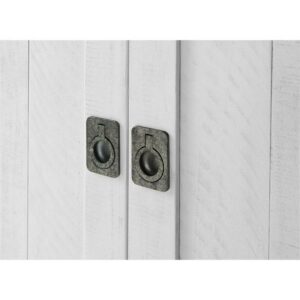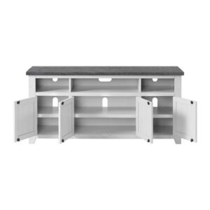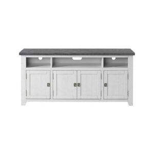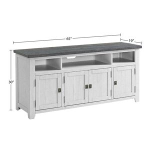 Lend some lodge-style casual charm to your living room design with the Coffee Plantation 65 in. TV Stand. This wide stand is rendered from solid pine hardwood and engineered wood, complemented by scratches and scuffs. For storage, three open shelves let you easily install cable boxes, game consoles, and more. The base has two single-door cabinets and a wide double-door cabinet, each featuring adjustable shelves and vented backing. Your choice of availalbe finish options.