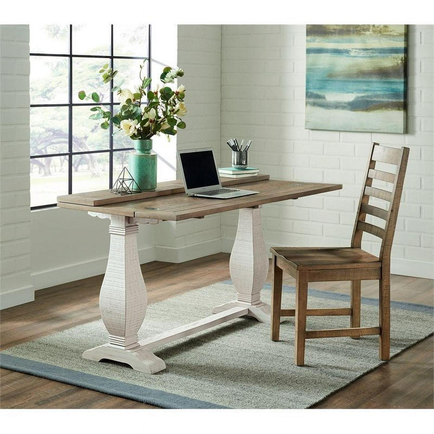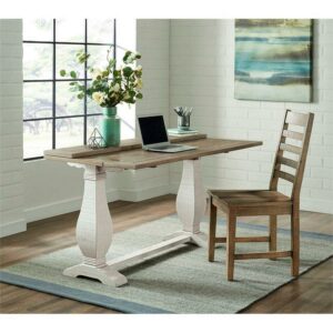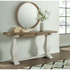 Finish: Reclaimed Natural Top and White Stain base with wormwood and purposeful distress marked details Versatile design which allows for the table to be used three different ways: standard sofa table, desk or dining table Table leaves easily flip down to turn the table into a writing desk or into a nicely sized, space saving dining table Classic farmhouse baluster style leg with additional carved details 2 thick tops are detailed with a plank design Easy assembly; Assembled product dimensions: 60″ W x 18″ D x 30″ H. Fully opened dimensions: 60″ W x 36″ D x 30″ H