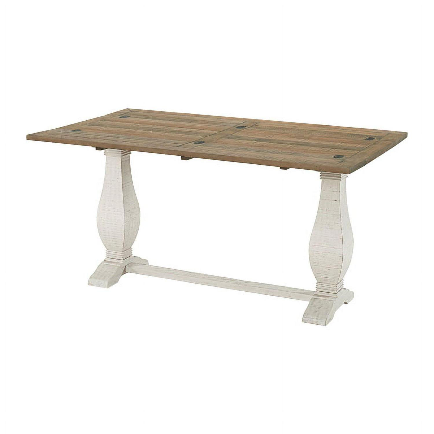 The Napa Flip Top Console Table offers a casual farmhouse style with a pedestal base. This table features a versatile design which allows for the table to be used three different ways: standard sofa table, desk or dining table. Two leaves run length wise on the table and when one leaf is flipped down the table is the perfect size for writing desk. When both leaves are opened, the table turns into a nicely sized dining table. This is the perfect space saving farmhouse style table. The table is constructed of reclaimed or salvaged style New Zealand Pine and finished in a Reclaimed Natural finish on the top and White Stain on the base. The eye-catching legs feature a classic baluster style leg with additional carved details. The 2 thick tops are detailed with a plank design and natural wormwood and purposeful distress marked details. Assembled product dimensions: 60″ W x 18″ D x 30″ H. Fully opened dimensions: 60″ W x 36″ D x 30″ H. Product materials: New Zealand Pine. Easy to assemble. Made in Vietnam.