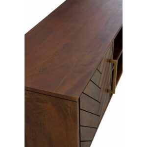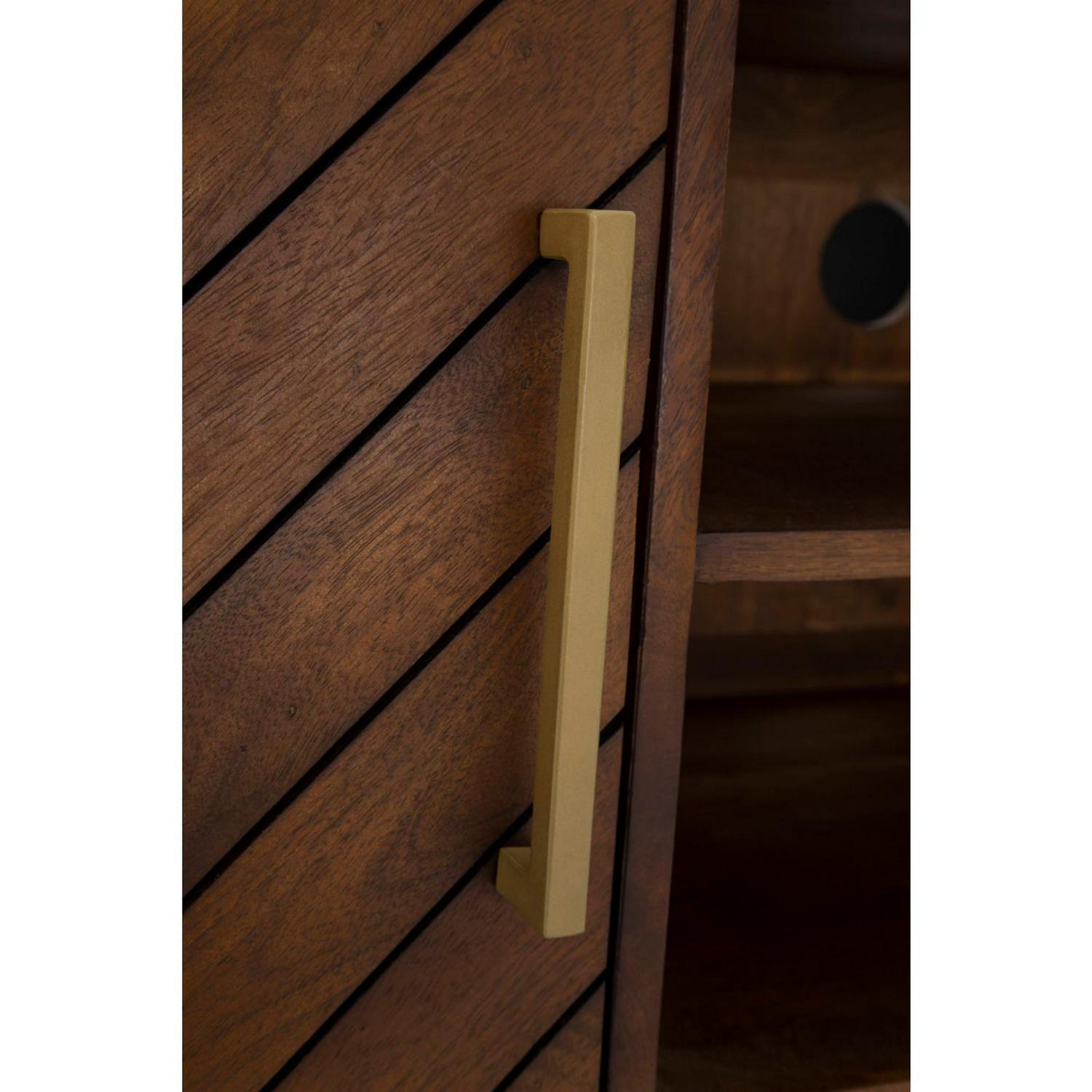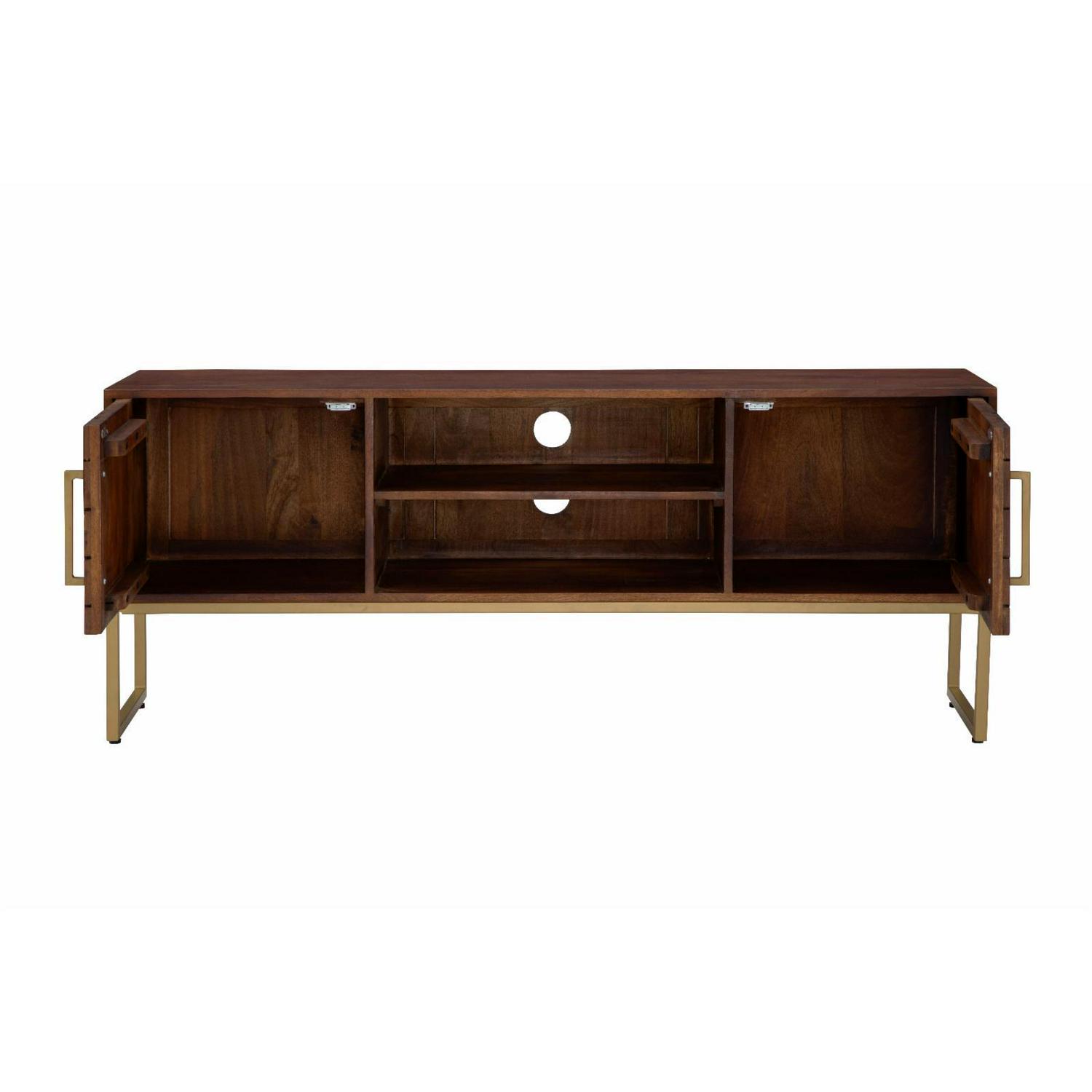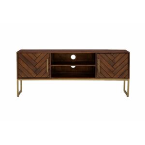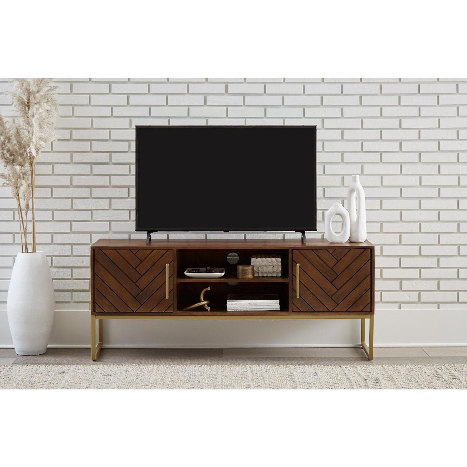 Introduce a mid-century modern style into your den or living room with the stunning San Marino TV stand. Two (2) enclosed side cabinets provide ample space for media accessories, books, and games. A center cubby with one (1) fixed shelf is the perfect spot for a gaming system and decorative accent. At 58-inches wide, this console is ideal for most 60-inch flat panel TVs. A herringbone pattern on the door fronts adds distinction, depth, and texture, conveying a sense of vintage elegance. Crafted of solid acacia wood, this TV console is built for durability and longevity. Gold hardware and metal powder coated legs pop against a warm fruitwood finish with subtle amber hues, providing a classic and timeless look that will complement a wide range of interior design styles, from traditional to vintage. Assembled dimensions: 59 W x 15 D x 24 H