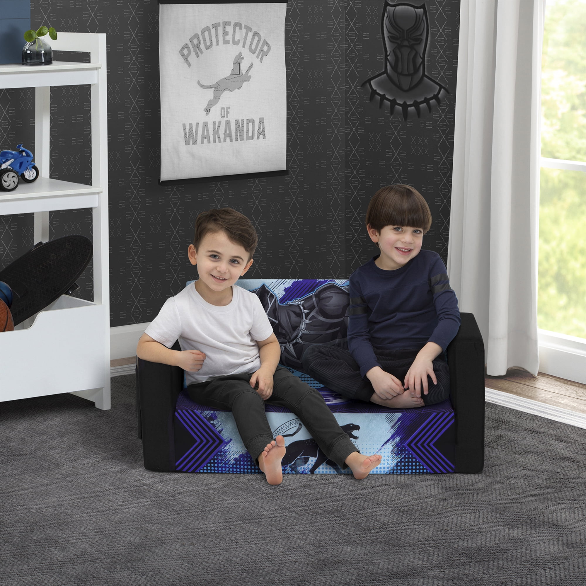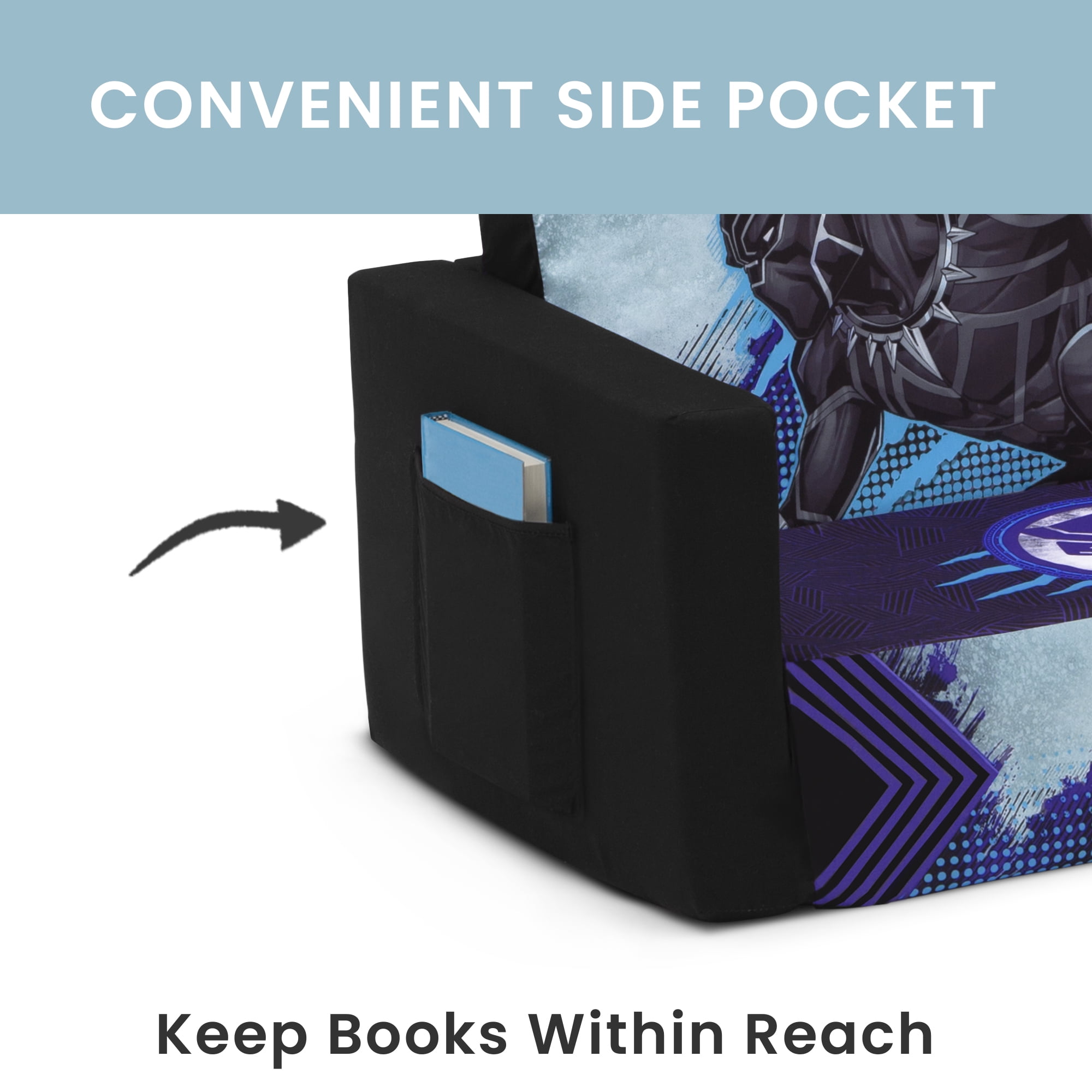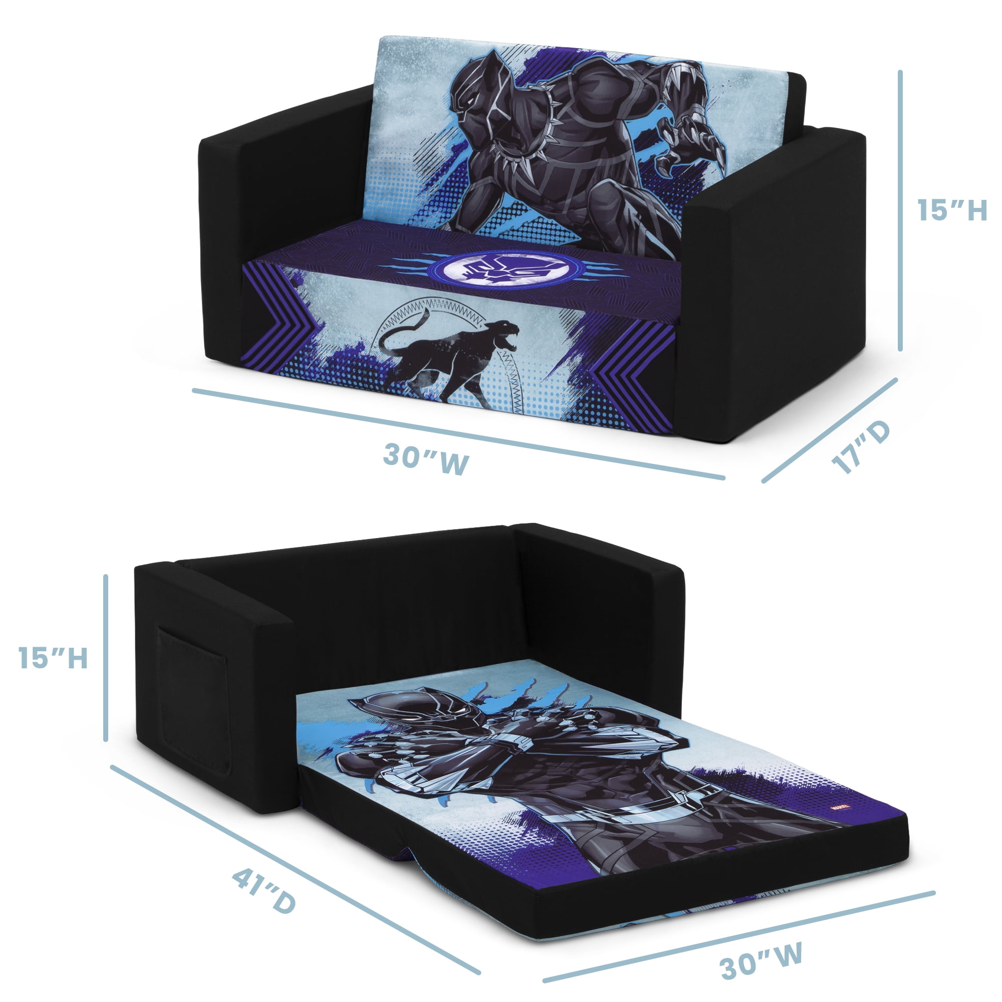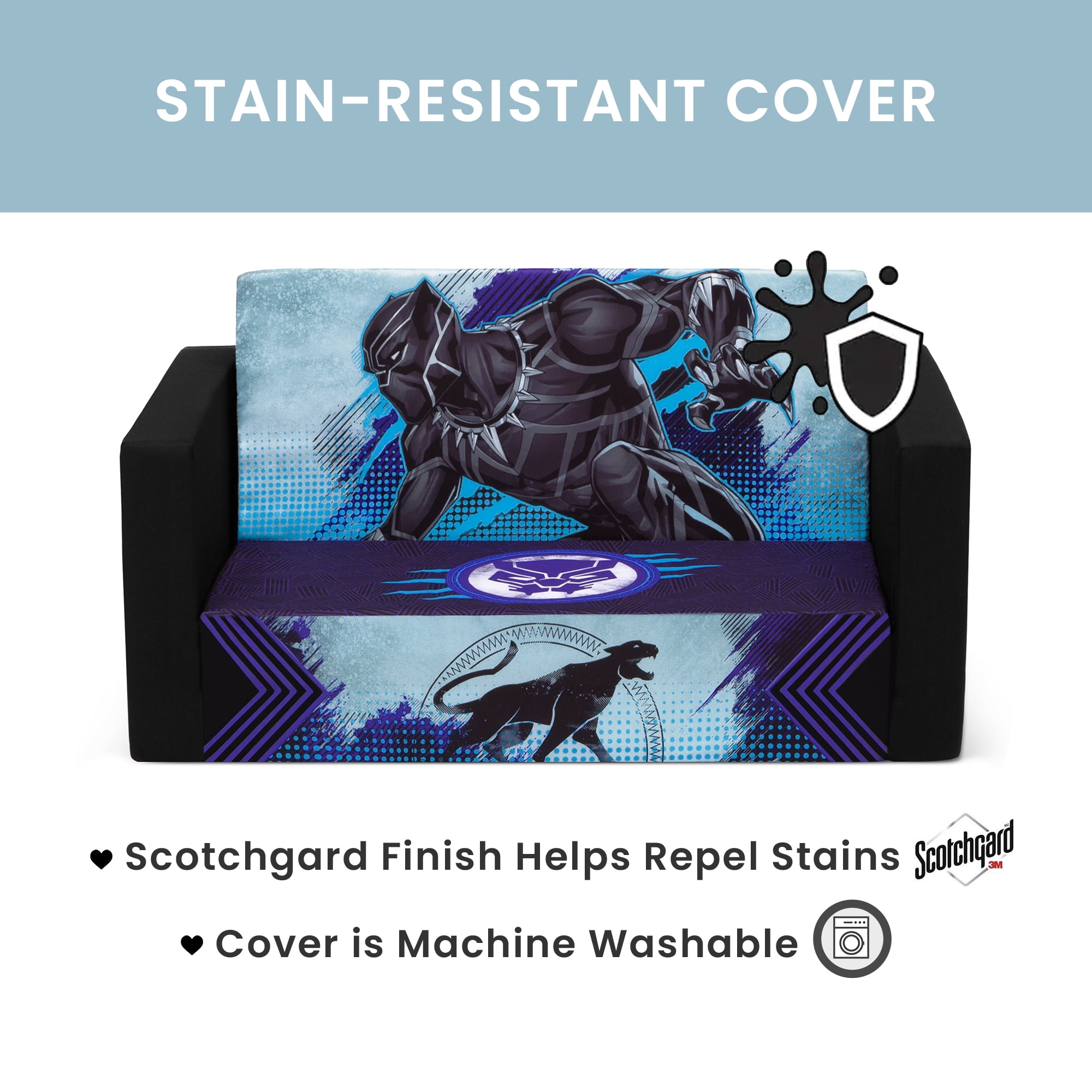 Wakanda forever! Rule the kingdom while sitting on this Black Panther Cozee Flip-Out Sofa by Delta Children. A cozy sofa by day, laid-back lounger by night, this convertible seat easily flips open for multiple ways for your child to relax. Kids will love to sit and read or watch their favorite movies on the sofa but when it’s time for a nap, this seat folds out into a comfy sleeper bed. The supportive memory foam seat ensures all-day comfort. Plus, when the chair is flipped open it magically showcases the strength and agility of the Black Panther. Big enough to 2 to 3 small kids comfortably in sofa mode, it’s light enough to move around the house and is ideal for your children to share during playtime or sleepovers. The super-soft slipcover with easy-to-reach side pocket is treated with a Scotchgard stain release finish to resist stains, ensuring the chair looks beautiful for years to come! Designed to ship in a super-small box, this lightweight foam kids’ sofa and lounger comes fully assembled and may take up to 24-48 hours to fully expand once unboxed. Machine-washable slipcover zips off for easy cleaning. Recommended for ages 18 months+. About Black Panther: With the fate of Wakanda and the entire world at risk, T’Challa, the young king must rally his allies and release the full power of Black Panther to defeat his foes and secure the safety of his people.