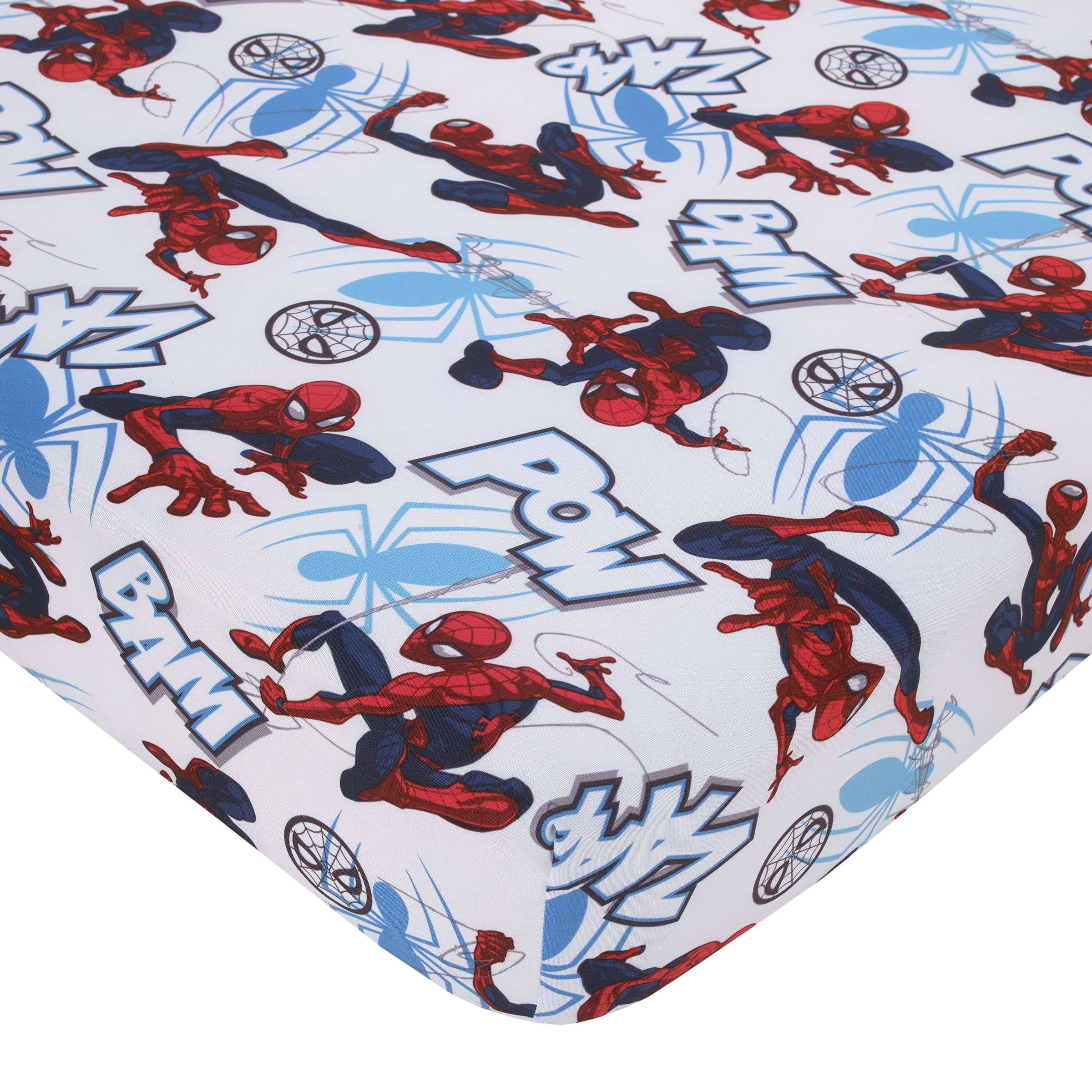 This 4-piece toddler set Includes a comforter, fitted bottom sheet, flat top sheet, and reversible pillowcase Features Spiderman ready for action in bold colors of blue, red, yellow, and white Includes everything you’ll need for a coordinated look