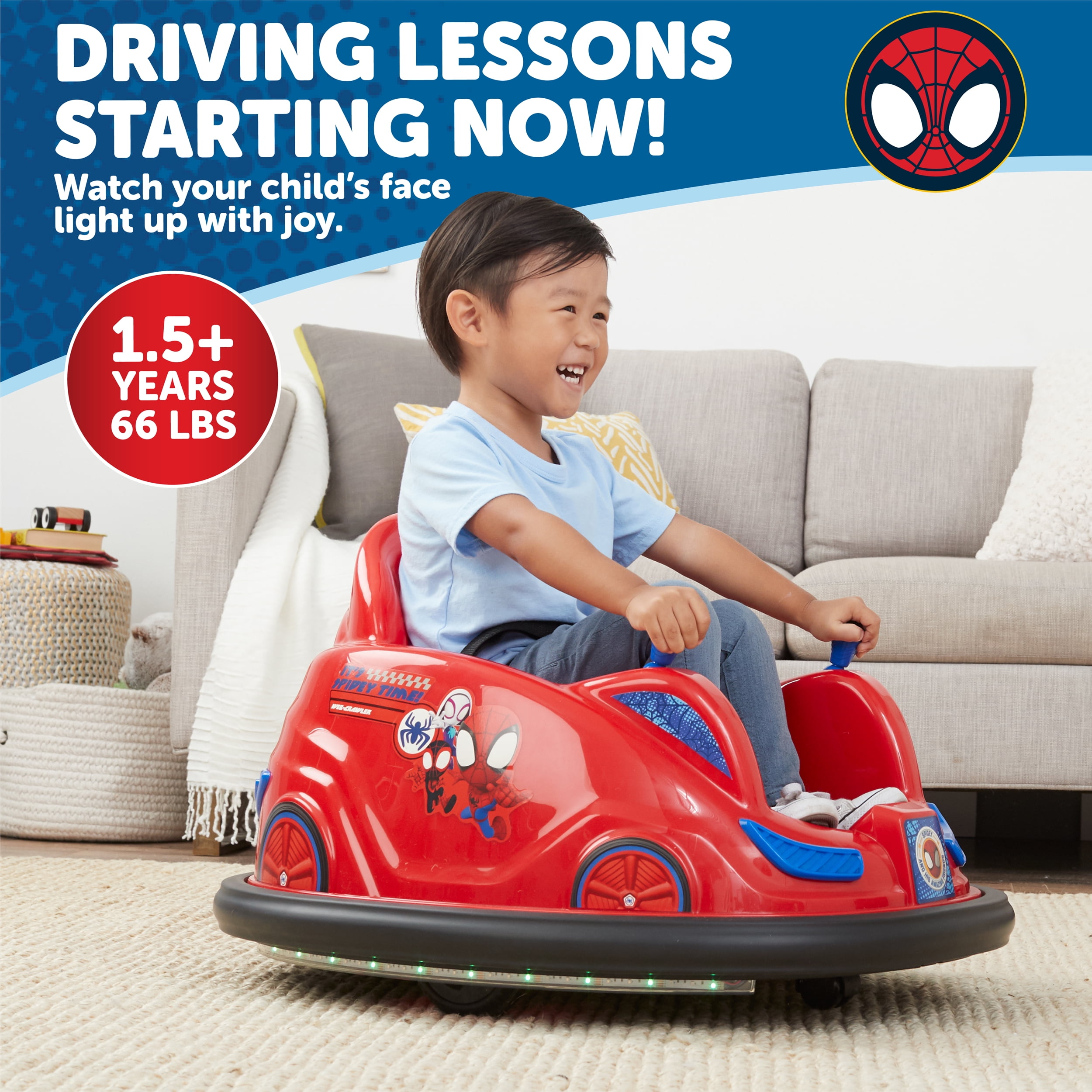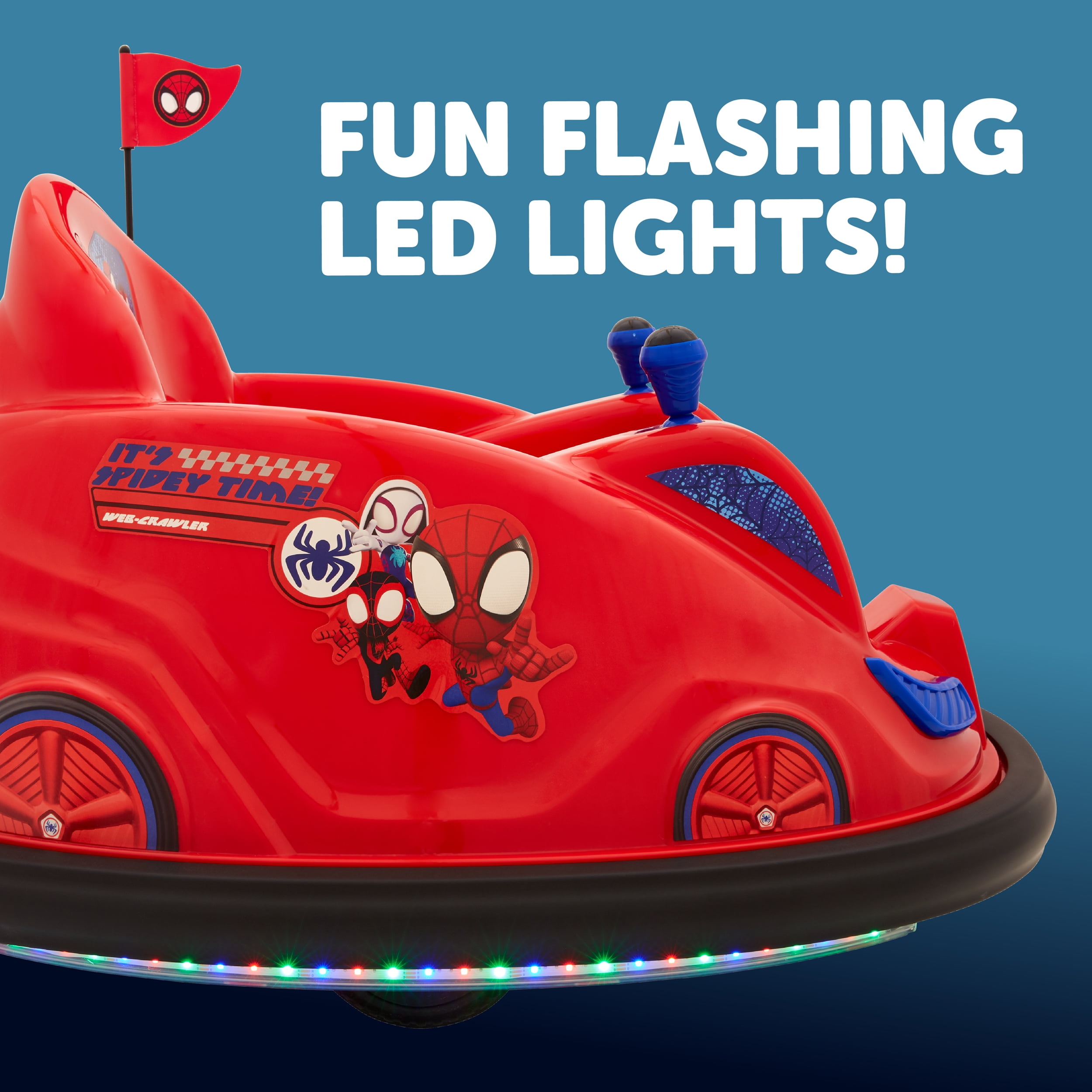 Marvel Spidey 6V Bumper Car Ride on Toy, 1 Count Marvel’s Spidey and His Amazing Friends 6V Bumper Car, Battery Powered, Electric Ride On by Flybar, Includes Charger, Battery Powered, Electric Ride On by Flybar, With Charger Age: 18 months – 4 years Weight: Up to 66 lbs Lights & Action: Fun, exciting flashing LED lights glow bright. Watch your child’s face light up as they drive and bump their way all around the hous Bump & Play: Car spins 360 degrees and provides screen-free, exciting entertainment. Your child will giggle and smile as they spin and bump Lights & Action: Fun, exciting flashing LED lights glow bright. Watch your child’s face light up as they drive and bump their way all around the hous uality & Durability: Built with a tough plastic shell and a soft rubber bumper to protect walls and furniture Made For Safety: Features an adjustable seat belt, 1 MPH max speed, and anti flat tires Dual Joystick Controls: Easy-to-use dual joysticks for spinning 360 degrees and steering the ride on baby bumper car Design: Decorative stickers, headlights, taillights, and your own racer flag Power: Includes 6V rechargeable battery and 120V wall charger. Power up the fun whenever you want. Charge fully before use. Assembly: Vehicle is fully assembled. Attach the bumper, charge/connect the battery and go Flybar Bumper Cars: Other colors and characters may be available. Look for them today