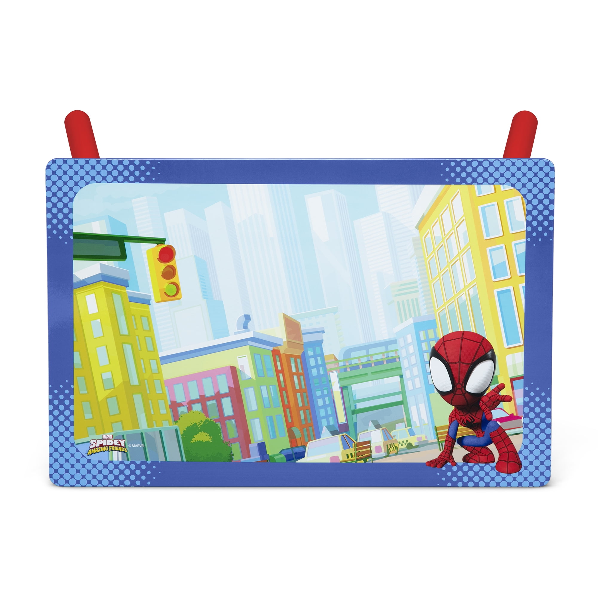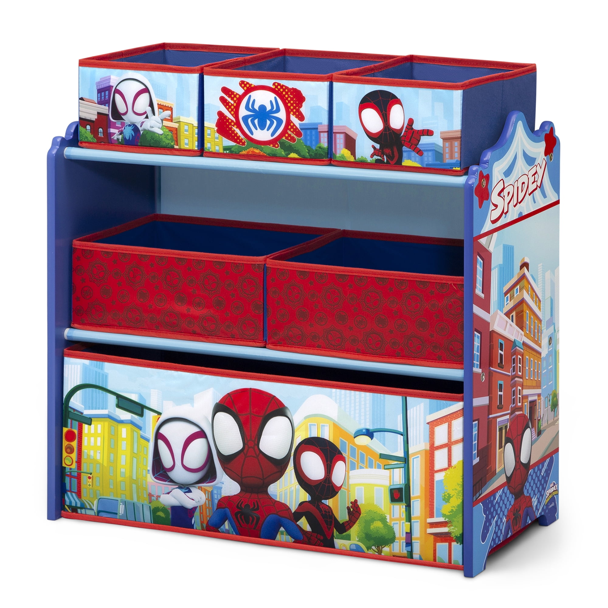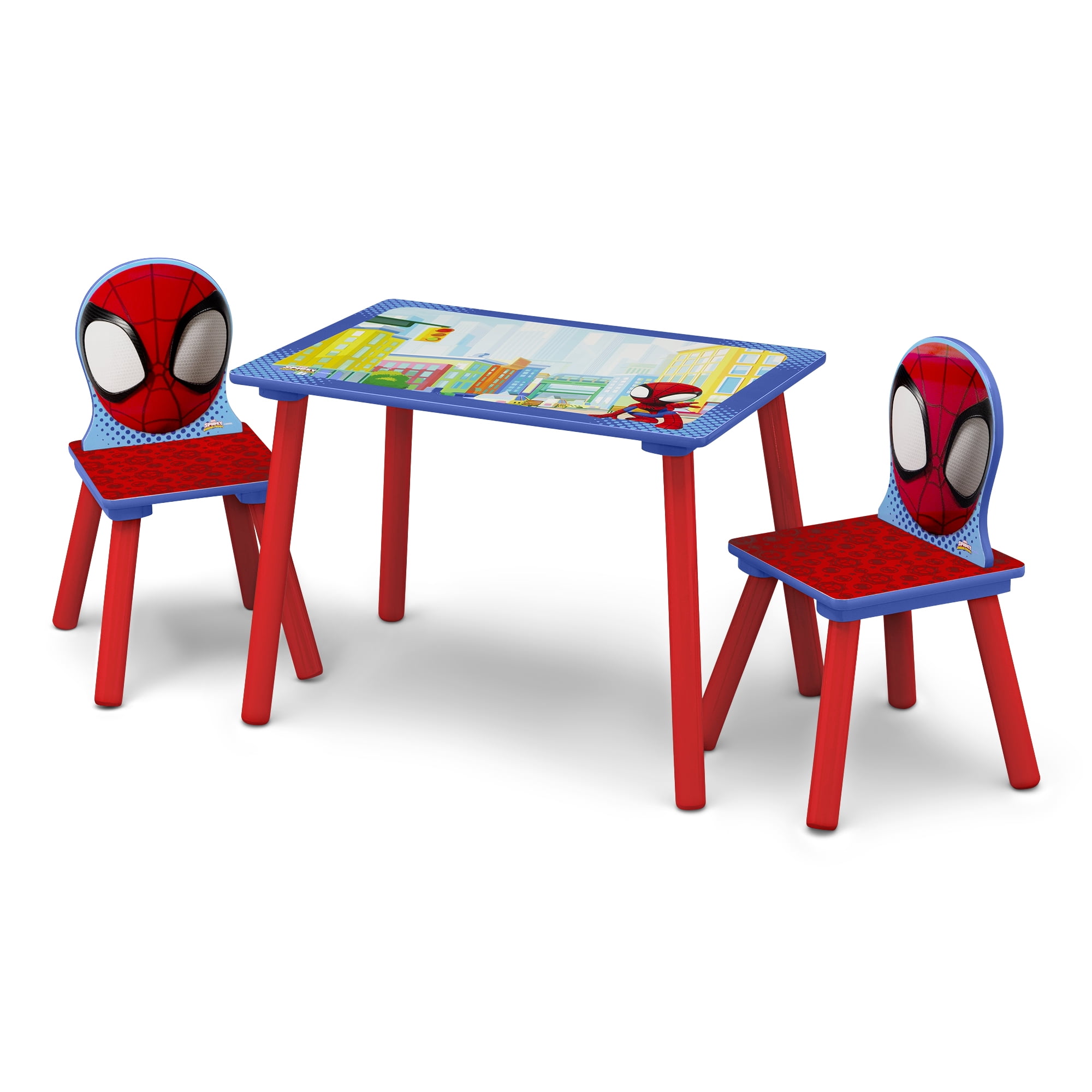TABLE AND 2 CHAIR SET RECOMMENDED USE: For toddlers and kids ages 2+ | Each chair holds up to 50 lbs. DURABLE CONSTRUCTION: Made of engineered wood and solid wood | Scratch-resistant finish protects the table’s colorful graphics | Easy assembly SAFEST OPTION: Meets or exceeds all safety standards set by the CPSC SIZE: Assembled dimensions: 24”W x 20”D x 17.5”H” DESIGN & STORE 6 BIN TOY STORAGE ORGANIZER AGE RANGE: Recommended for ages 3+ | SAFE DESIGN: Bin meets or exceeds all safety standards set by the CPSC FOR SPIDEY FANS: Toy bin features colorful graphics of Spidey and His Amazing Friends | Will encourage your child to keep their space neat and tidy REUSABLE STICKERS: Kids will love arranging the reusable vinyl cling stickers to the sides of this organizer to create a new story every time they play TONS OF STORAGE: Toy Bin has 6 bins in varying sizes to fit a wide variety of toys, from small to large DURABLE CONSTRUCTION: Made of engineered wood, solid wood and fabric SIZE: Assembled dimensions: 24.61”L x 11.81”W x 26.57”H | Three medium bins: 7.75”L x 9.5”W x 5”H, two large bins: 11.6”L x 9.5”W x 5”H, one extra-large bin: 23.5”L x 9.5”W x 9.5”H | Easy assembly