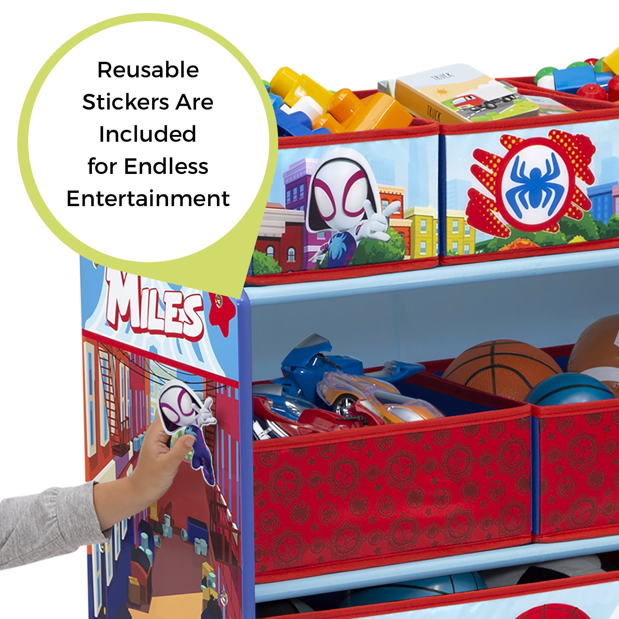 Playtime just got so much cooler with the Spidey and His Amazing Friends 4-Piece Toddler Playroom Set by Delta Children! A versatile set that provides both seating and storage, it includes a wooden play table with 2 chairs and a 6-bin toy organizer. The wooden play table and 2 chairs are the perfect kid-size height and feature bold Spidey graphics. The 6-Bin Toy Organizer features a sturdy wooden frame that holds six fabric bins sized for every type of toy, so you can store books, blocks, and more. The toy bin also comes with reusable vinyl cling stickers that allow your child to decorate the sides themselves. Built from sturdy materials, these pieces will standup to years of playtime.
