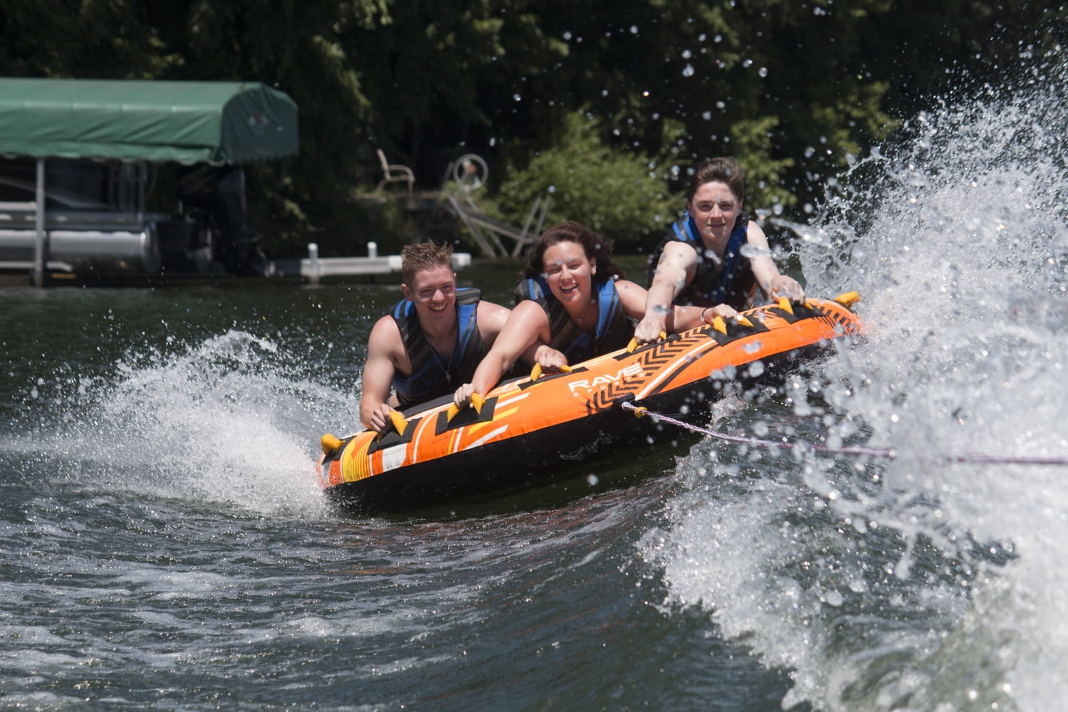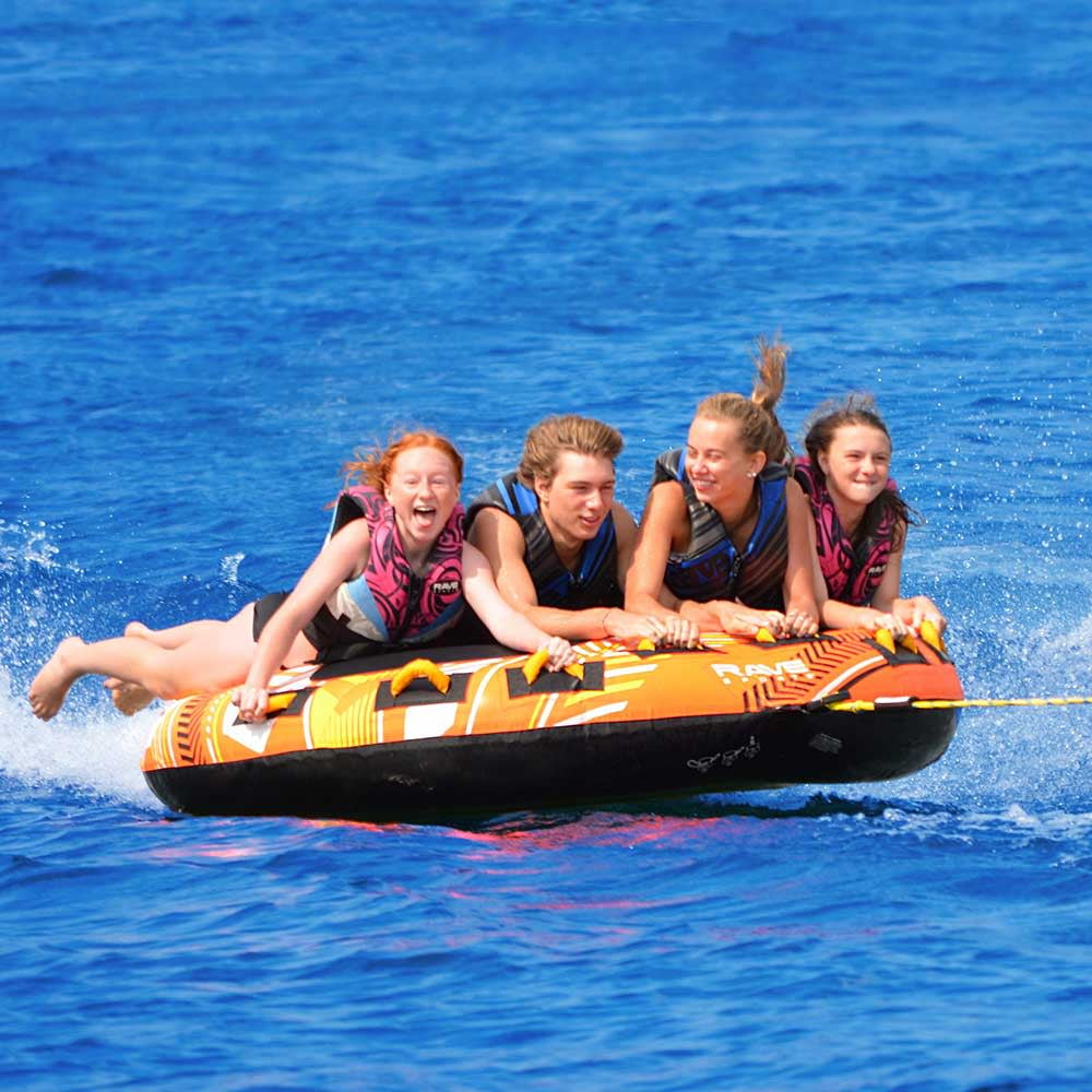 2 Rider: 340 lbs. (154 Kg) max rider weight , 3 Rider: 510 lbs. (231 Kg) max rider weight, 4 Rider: 680 lbs. (308 Kg) max rider weight Foam-filled handles with EVA knuckle guards The Frantic tapered deck tube that throws an exciting, wild ride! Available in 3 sizes! 2 Rider: 56″ x 12″ (142cm x 30cm) inflated2 Rider: 60″ (152cm) deflated3 Rider: 68″ x 14″ (173cm x 36cm) inflated3 Rider: 72″ (183cm) deflated 4 Rider: 76″ x 11″ (193cm x 28cm) inflated4 Rider: 80″ (203cm) deflated Stay-brite Technology repels dirt, water & provides color fastnessSkim-Fast™ Bottom for a slick and fast rideThree rear boarding strapsLarge anti-chafe guard8 foam-filled handles with EVA knuckle guardsQuick connect tow point
