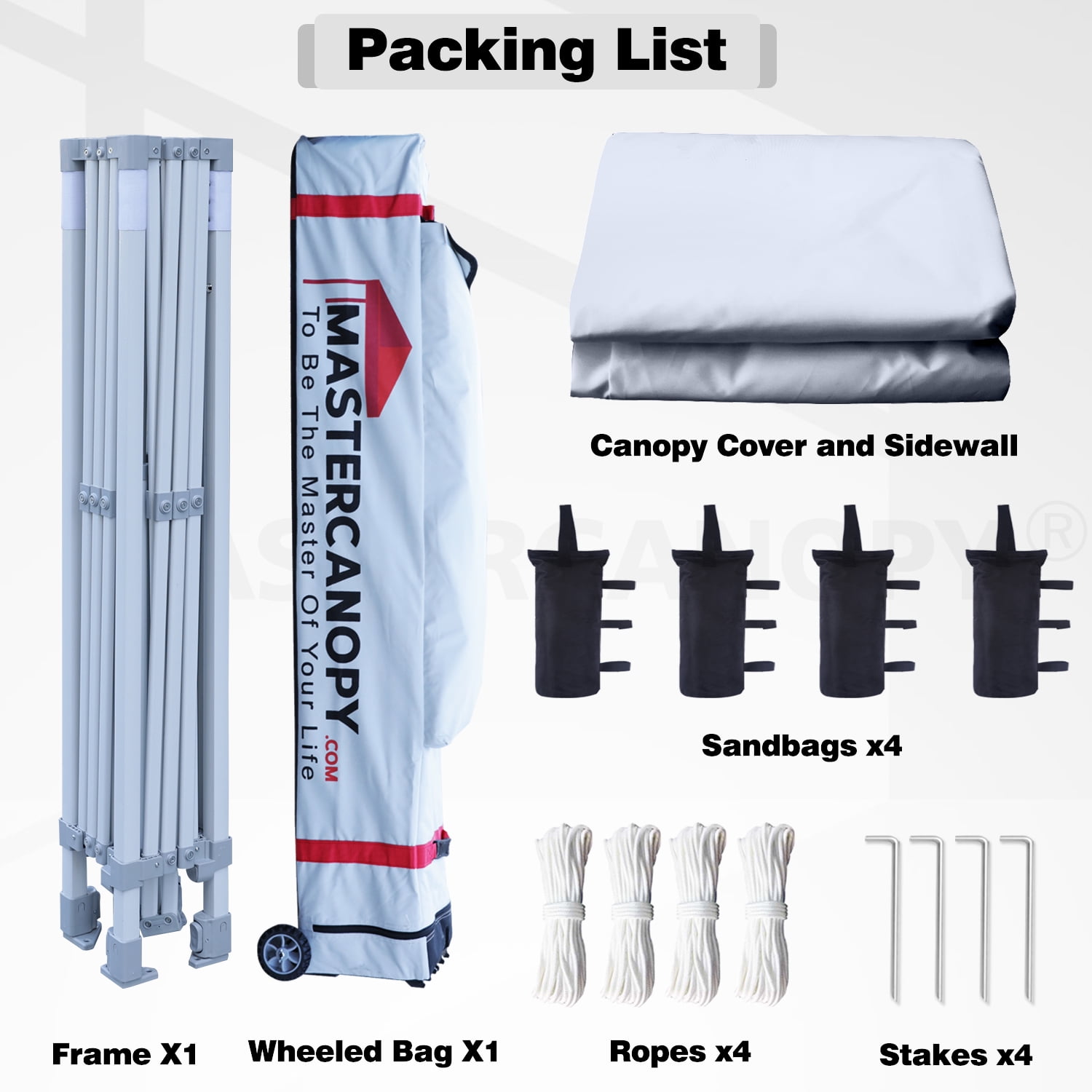 Mastercanopy heavy duty pop-up canopy tent with 4 sidewalls comes with 3 plain sidewalls and 1 door wall with zipper in the middle, which can provide a more comfortable and all-round shade. The PU-coated canopy cover and 4 sidewalls block strong UV rays, protecting you and your family from the elements. And most importantly, each sidewall piece is removable, so you can combine them as you see fit. The detachable sidewalls are designed with velcro straps on top, making it easy to install and remove the sidewalls at will. Every sidewall is zipper ended, zipper up to block the cold wind, also to better protect your personal privacy. Certainly, this tent features a full truss construction with a rust-resistant powder-coated steel frame that is durable enough to last a long time. It must be your best choice for outdoor activities or marketplace.