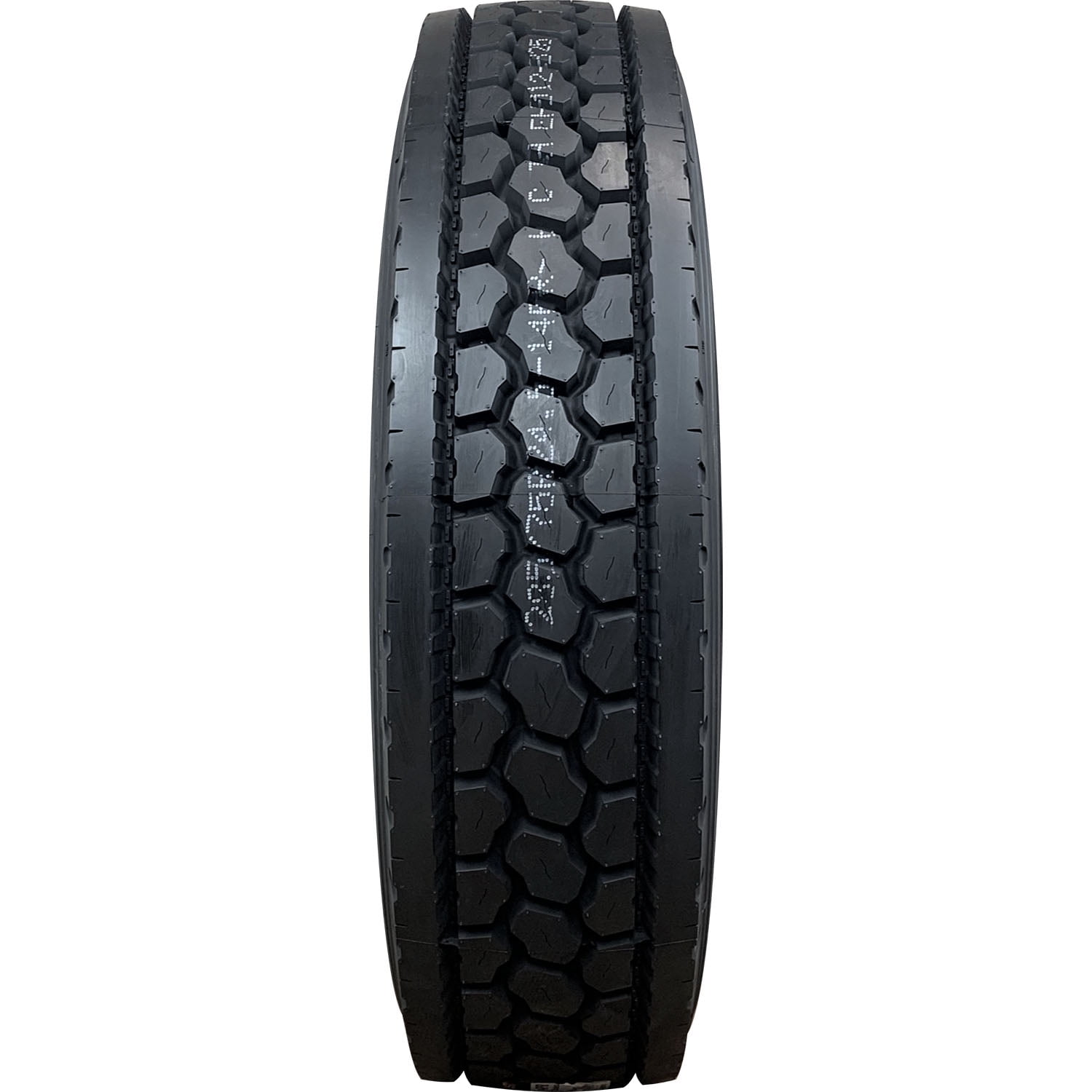 Designed for use on the drive axle of medium-duty commercial trucks and buses Angled tread blocks and zigzag grooves force rocks, stones, mud, dirt, water, slush, and snow out of the tread for consistent traction Built with four steel belts that increase strength and durability for a higher load carrying capacity and longer tread life Wide shoulders put more rubber on the road to enhance stability and fight off uneven wear Engineered with a special rubber compound that lowers rolling resistance to enhance fuel efficiency Size: 285/75R24.5 Load Range: H Product May Vary From Picture Wheel/Rim Not Included