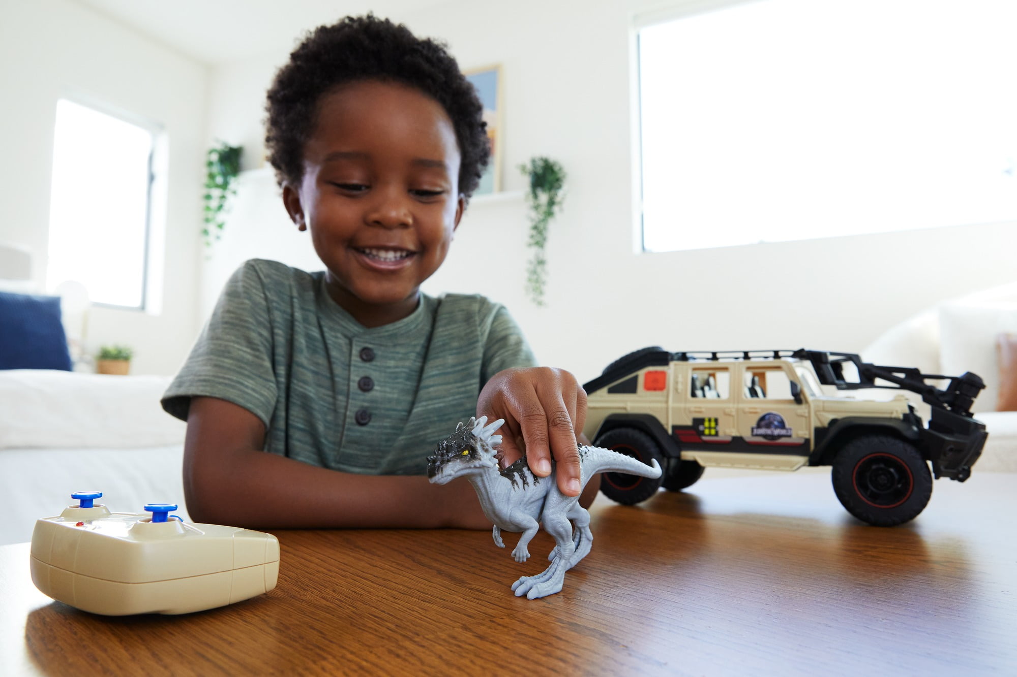 Recreate the thrills and excitement from Jurassic World Dominion with this movie-inspired R/C vehicle! The stylized Jeep Gladiator features true-to-movie details and comes with a remote control, removable auto-capture claw and 6-inch Dracorex Dino figure that encourages kids to recreate their favorite scenes from the film or invent new ones. When the dino touches the spring-triggered bumper, the claw immediately launches and grabs the figure. The 1:18 scale R/C vehicle has full functionality — kids can use the remote control to move backward, forward, left and right as they play out dino chases and captures! The realistic interior has space for kids to put their own action figures to help drive exploration and adventure (action figures sold separately, subject to availability). Colors and decorations may vary.