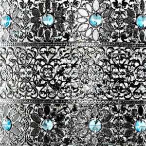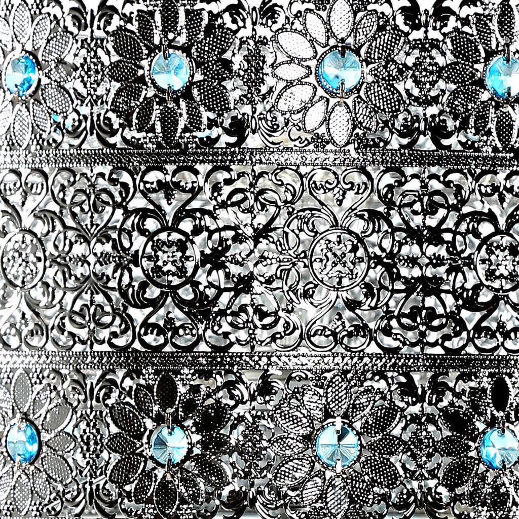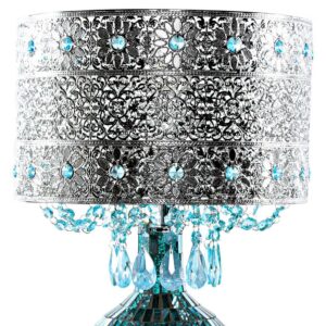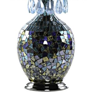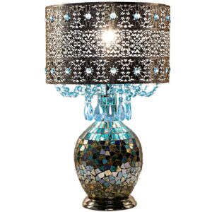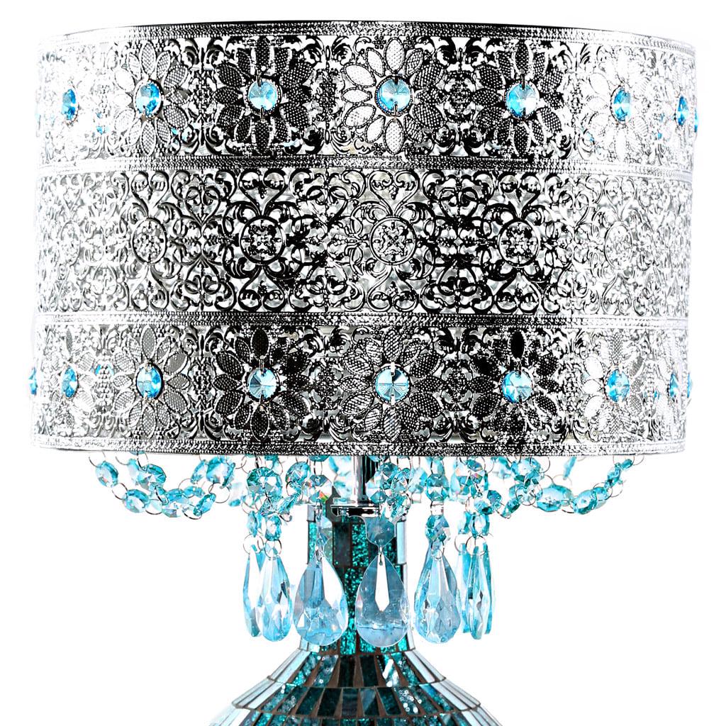 Exotically entrancing, this metal and glass table lamp is a show stopper. The filigree silver metal shade is accented with sky blue glass crystals, and the mosaic glass base shimmers in ombre from bright turquoise to silver. Inspired by the California sky at night, this is a the kind of lamp that can change an entire room!