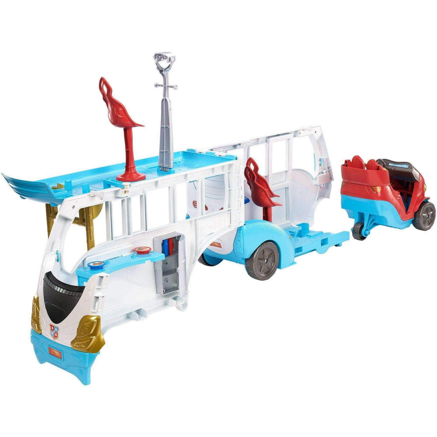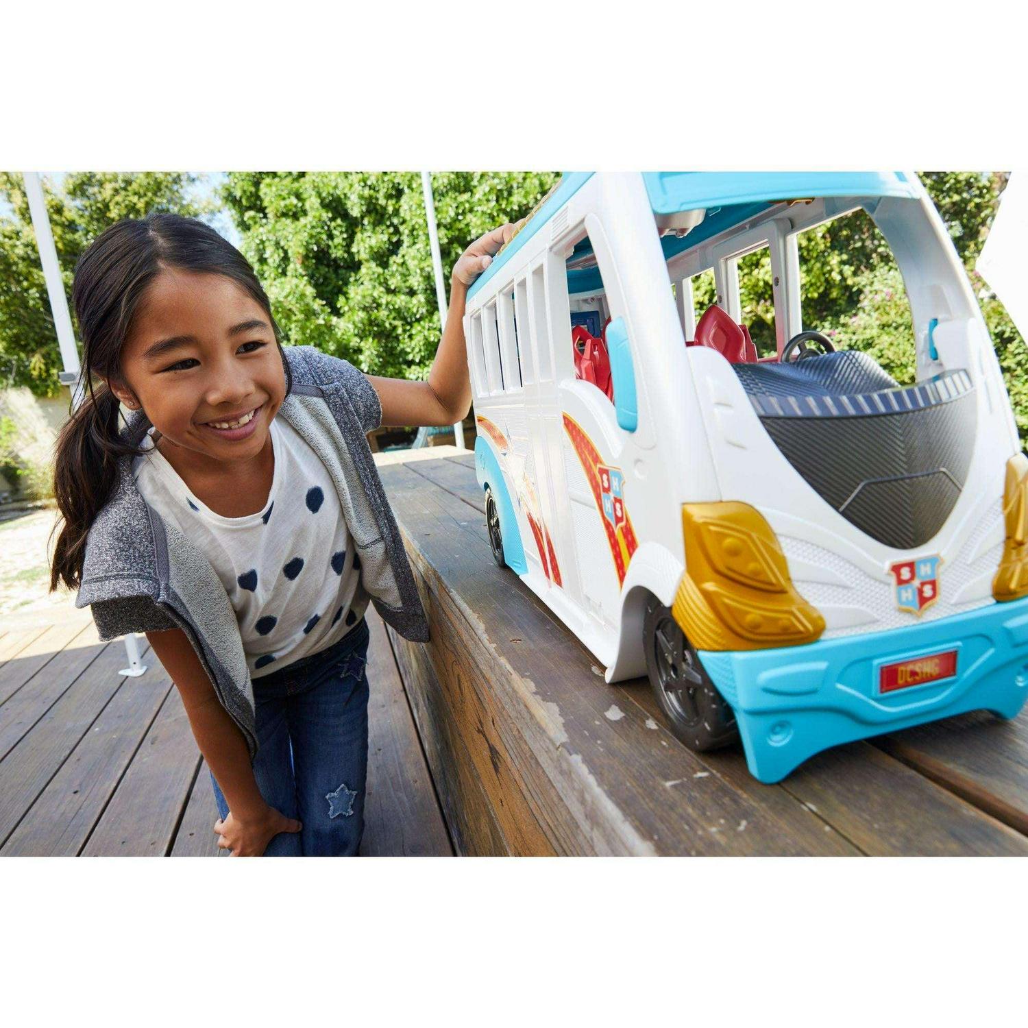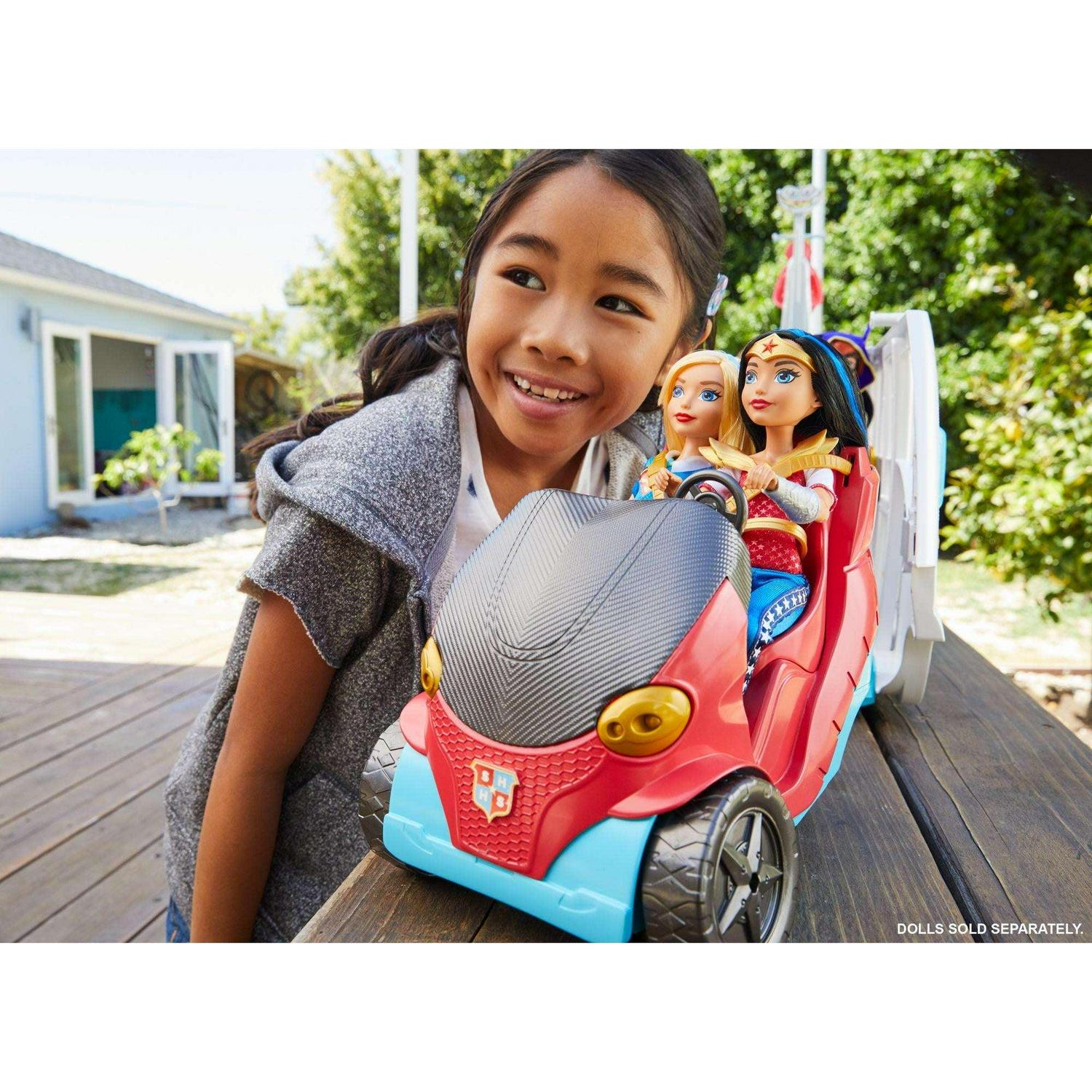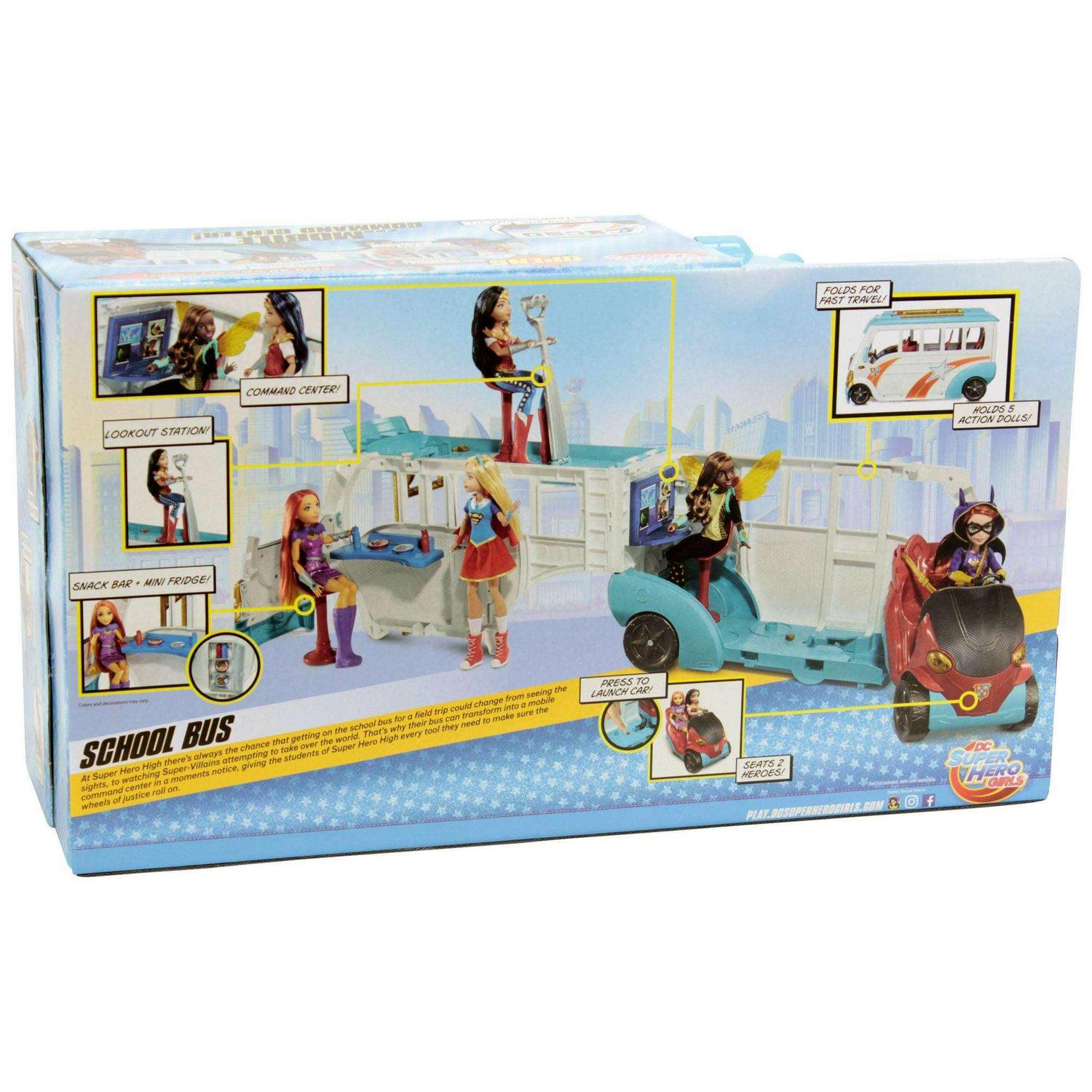 Unleash your inner hero and a team of DC Super Hero Girls with this awesome two-in-one school bus!,The school bus -that can transport five DC Super Hero Girls 12-inch action dolls (sold separately) -opens to create a play set more than 3 feet wide!,The two-in-one vehicle rolls into action with colorful Super Hero graphics, working wheels and a ladder on top that can be lifted up to help with rescues.,Transformation from bus to play set is easy simply flip open the roof and open the side of the bus to reveal the cockpit, a kitchen and a lookout. Reverse to roll back into action!,A removable car is hidden in the front end -take out to create a stealthy ride for two.,The passenger area holds three removable seats that can be turned to view the data screens and comm stations.,The back section has a snack bar with food and drink plus a mini-fridge with working door.,The roof holds a “telescopic viewer” that lifts up to help look out for Super-Villains.,Play out all kinds of stories and inspire your inner hero with these powerful friends from Super Hero High!