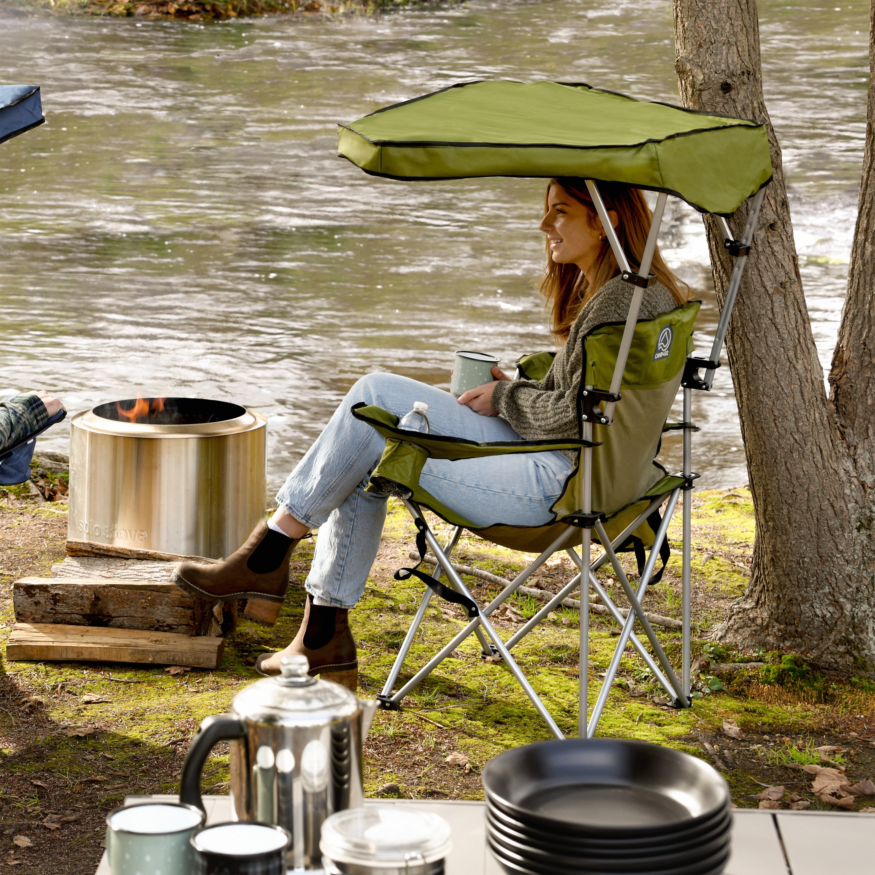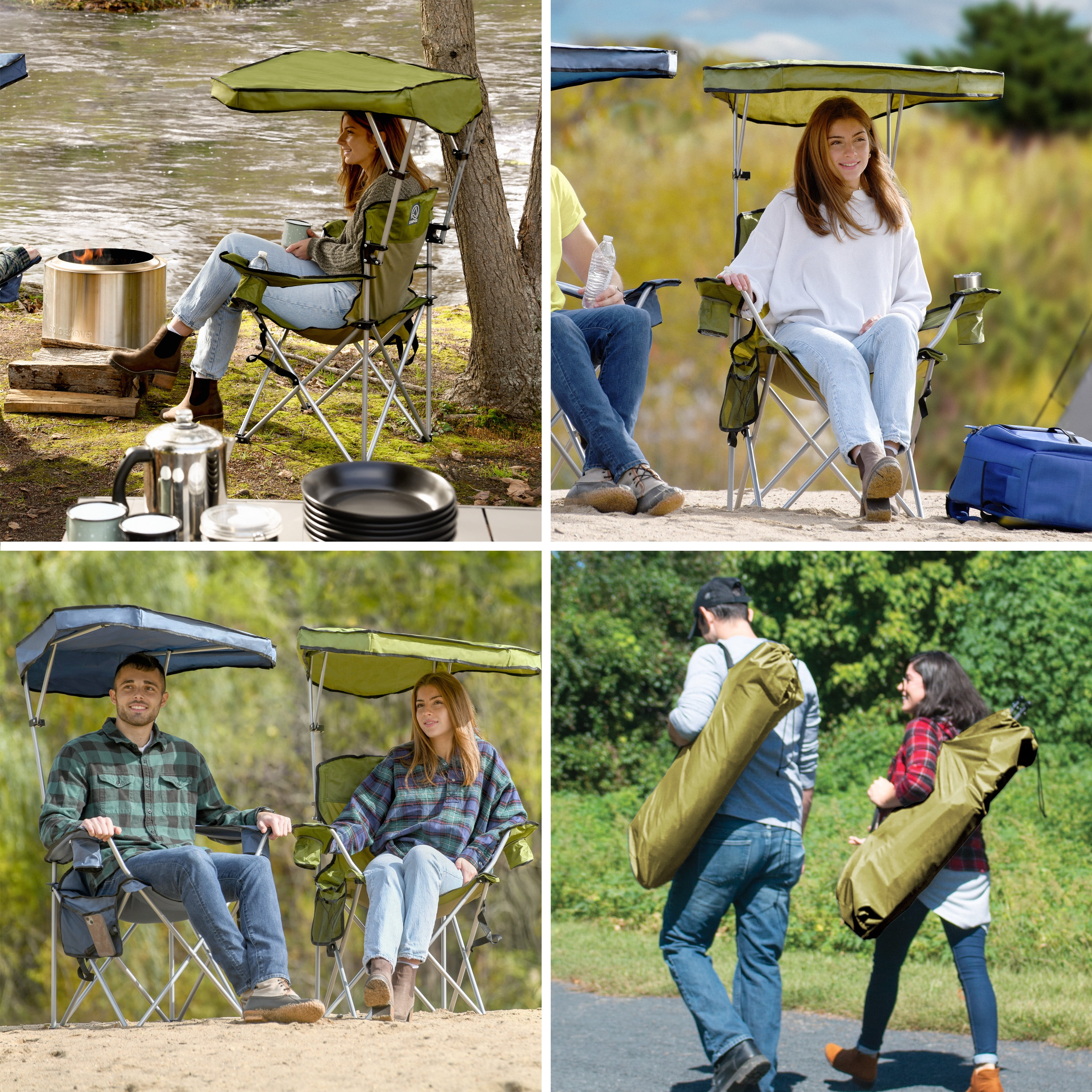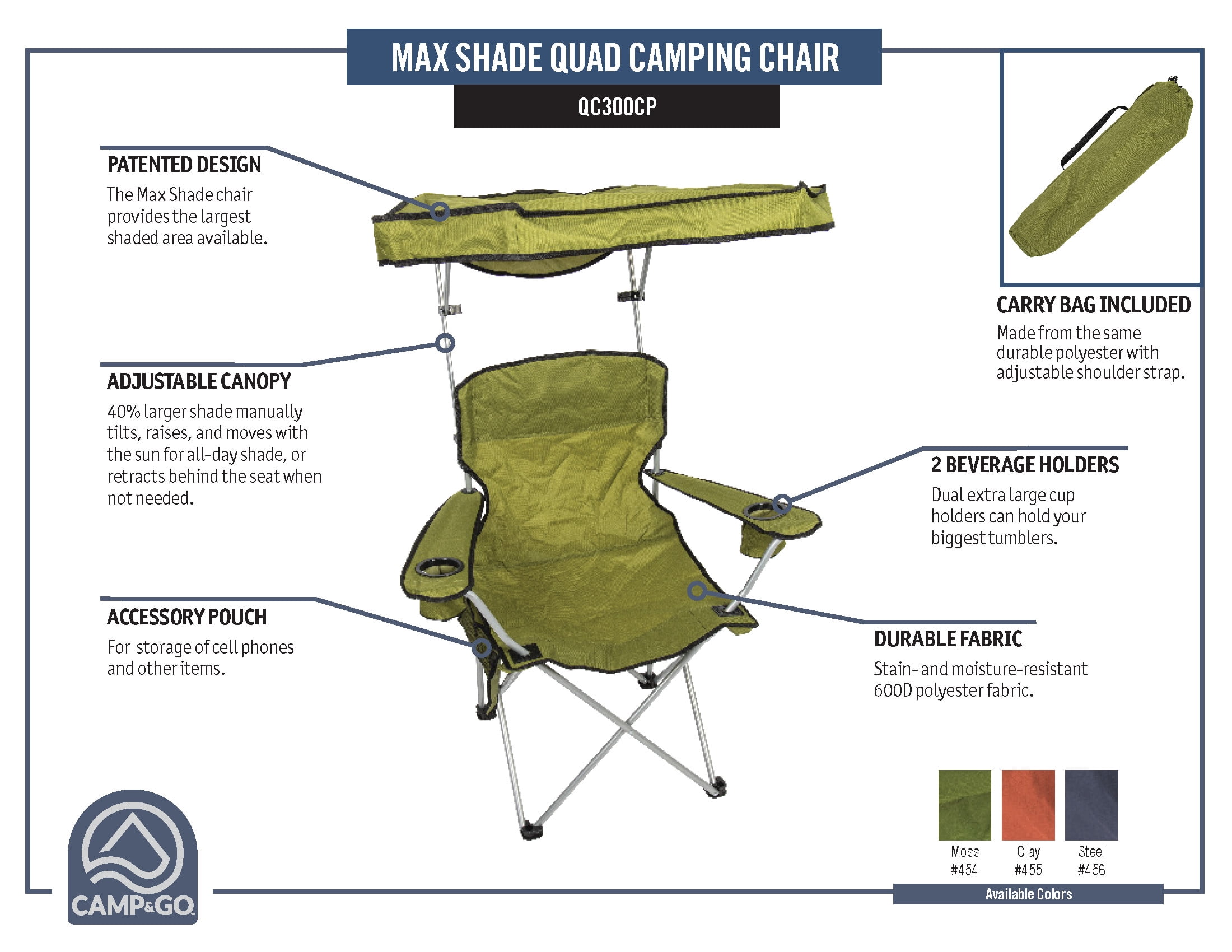 The Camp & Go Max Shade Quad Camping Chair Offers Compact, Portable, And Comfortable Outdoor Seating And Shade. You Can Manually Tilt, Raise, And Adjust The Max Shade To Block The Sun For All Day Shade. When It’S Not Needed, The Max Shade Can Retract To Fit Behind The Seat And Out Of The Way. It Includes An Oversized Cup Holder For Big Tumblers And A Built-In Cellphone Holder.