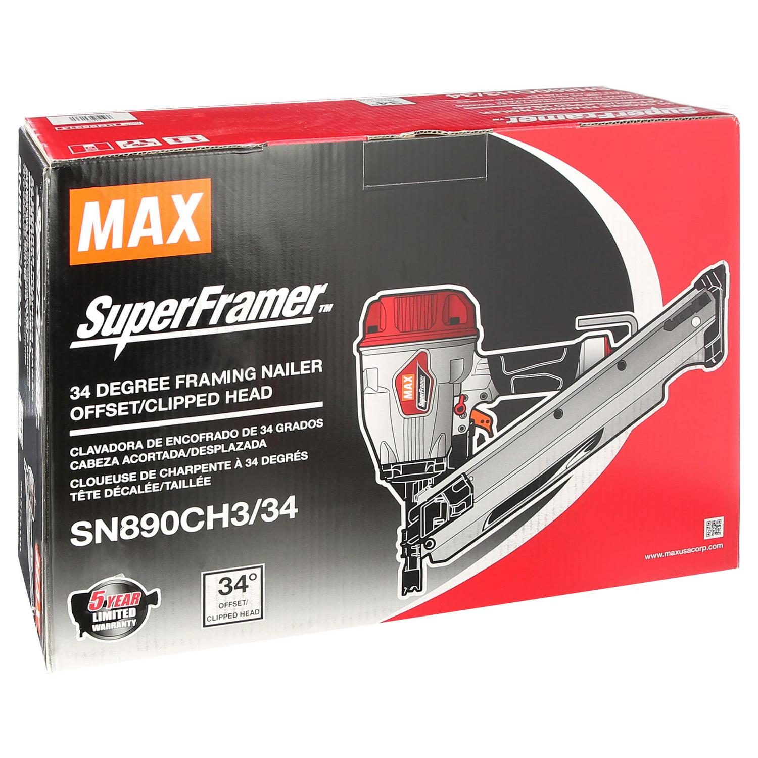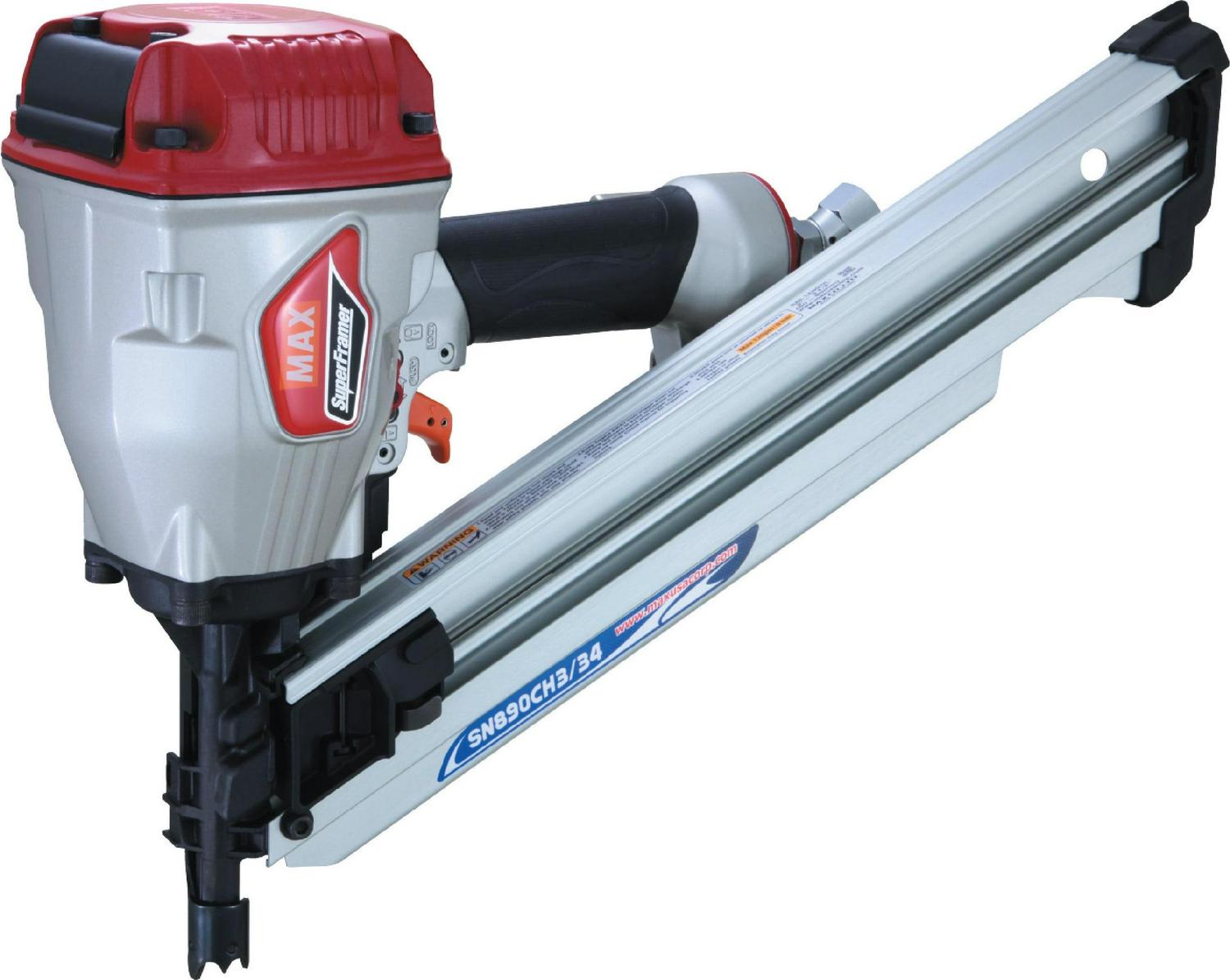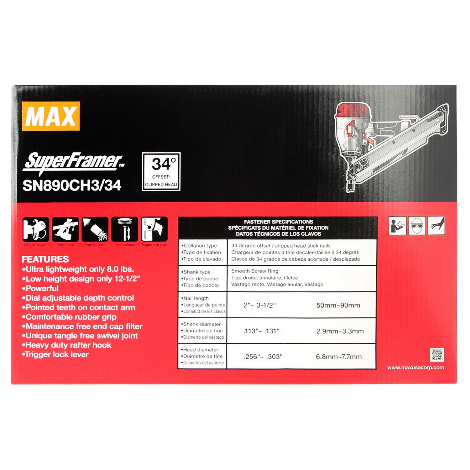 The Max USA Corp super framer SN890CH3 34 strip framing nailer shoots a wide range of fastener from 2 to 3 1 2 plastic or paper collated nails. The SN890CH3 34 features our patented maintenance free end cap filter weighs only 7Lbs has a comfortable rubber grip reduced recoil engineering system trigger lever lock and now comes with a rafter hook and a swivel plug