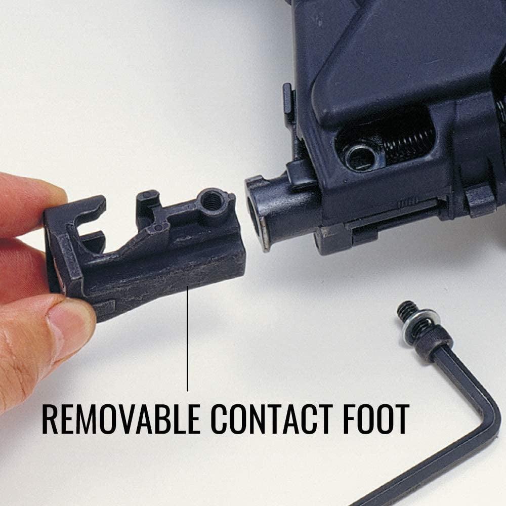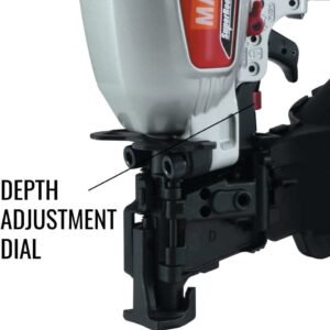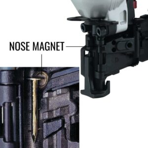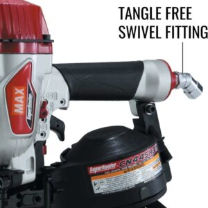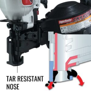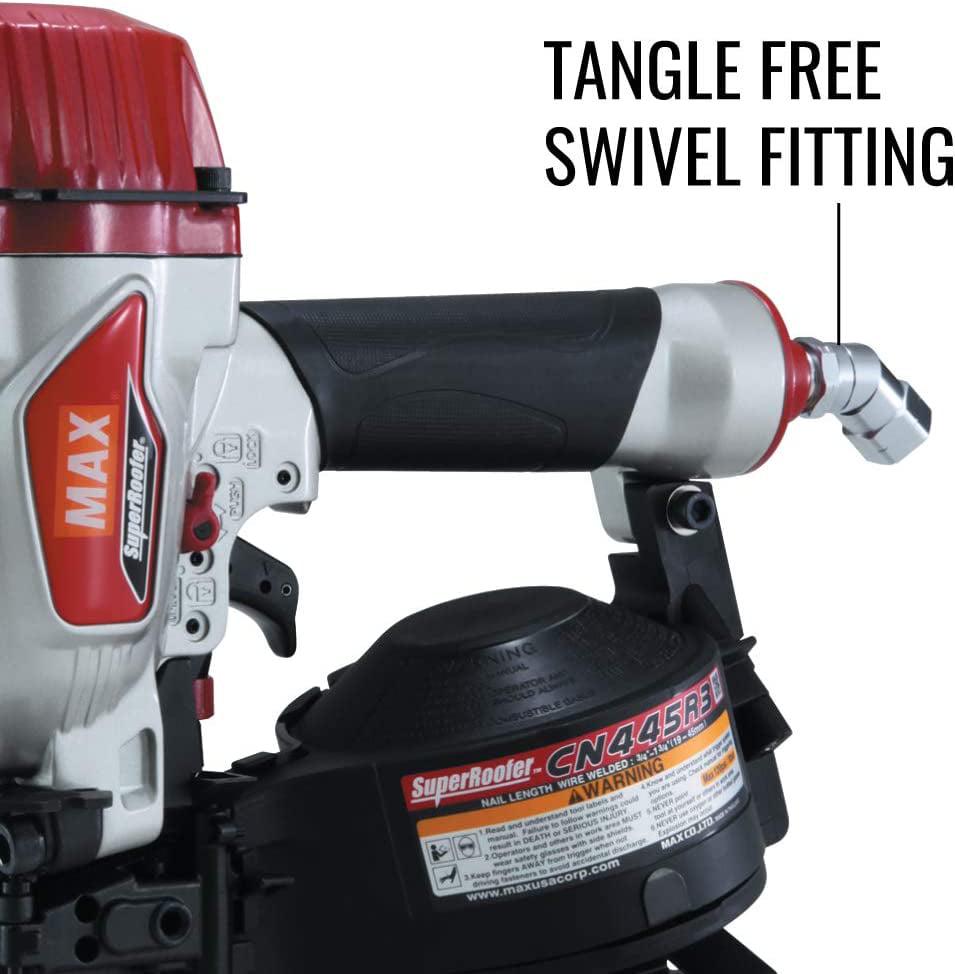 Engineered by the manufacturer of the world s first roofing nailer MAX combines durability and performance in the safety equipped SuperRooferCN445R3 Equipped with a full round head driver blade allows operators to drive nails in flush for dependable holding power To ensure the durability of the CN445R3 the tar resistant nose is designed to block tar build up up to 8x longer than conventional tools The patented self cleaning end cap filter traps foreign substances before they can enter the tool and safely ejects them when the air hose is disconnected.