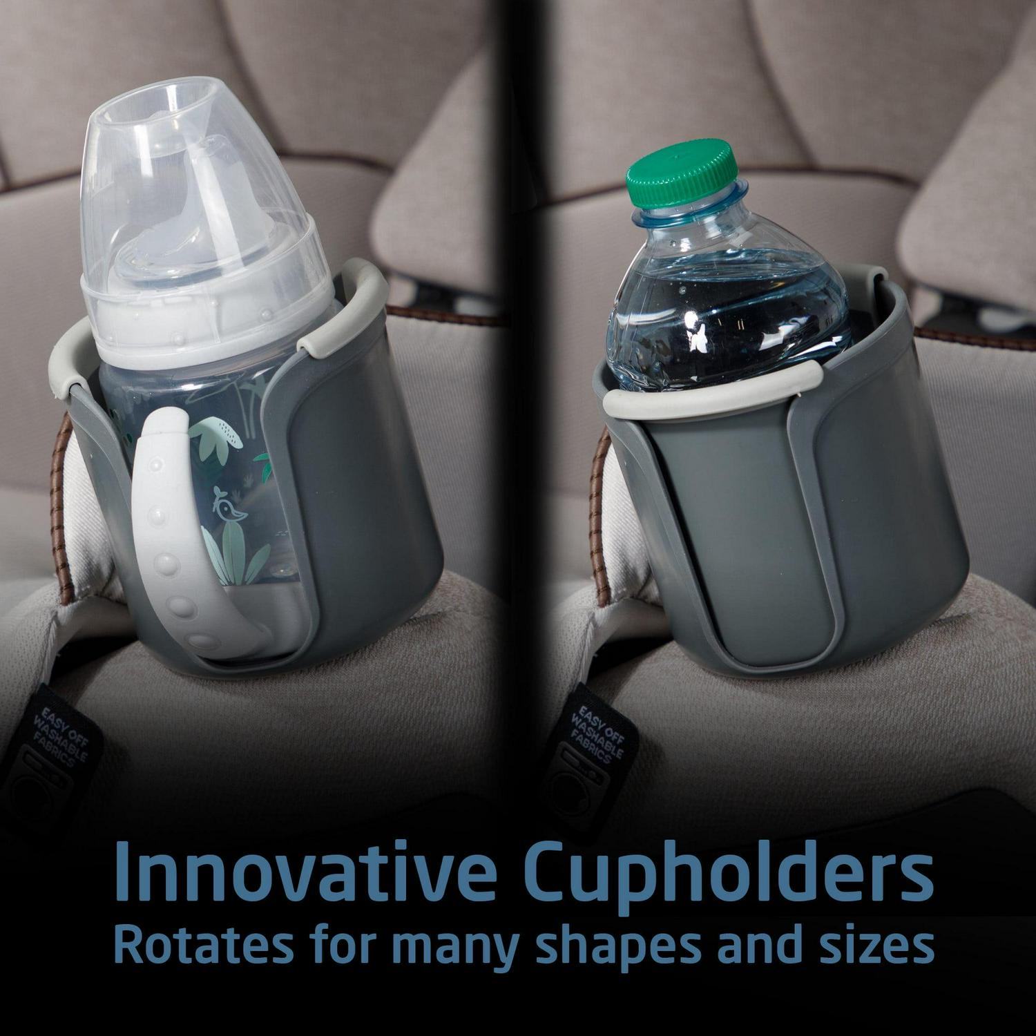 – Innovative cup holder design rotates to accommodate sippy cups of various shapes and styles. Both cup holders are removable and dishwasher-safe.
