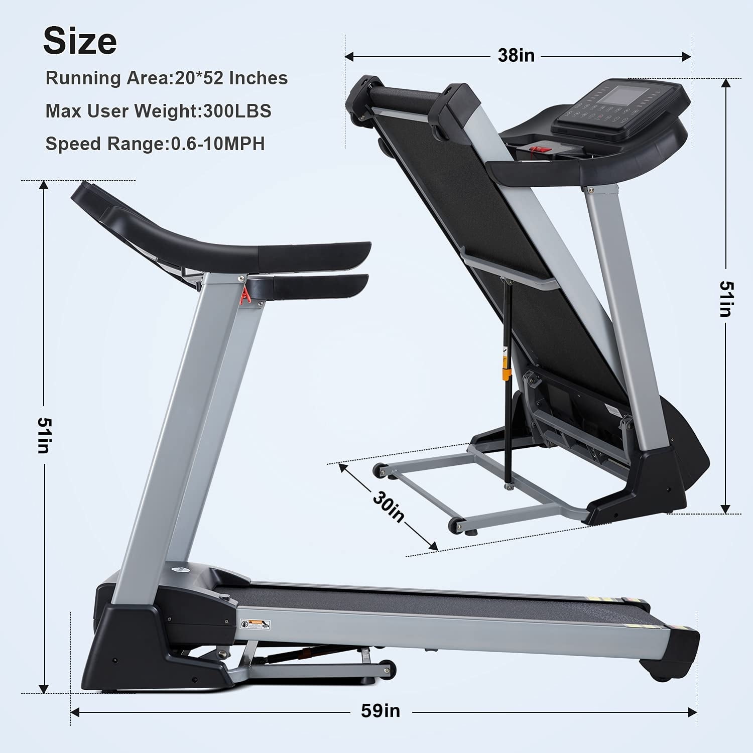 MaxKare 3HP Electric Folding Treadmill with 15 Levels Auto Incline ?15 Levels Automatic Incline & Soft Drop Platform ? Our treadmill is equipped with 15 levels auto incline which helps you personalize your workout for better results. Also, A soft drop system helps you fold and unfold the treadmill deck safely and hands-free. ?Powerful 3HP Quiet Motor & Adjustable Speed? With an upgraded smooth and strong 3HP treadmill motor supports speeds ranging from 0.6MPH – 10 MPH to help you meet a variety of fitness goals. Max user weight: 300 lbs. ?Widened Running Belt & Shock Reduction Deck? Upgraded 20-inch wide running surface provides you with a spacious area to run comfortably and freely. Multi-Layer shock absorption cushioned deck reduces the damage to knees and ankles. You can enjoy sports without disturbing neighbors or family members. ?Multi-Functional Display & Heart Rate Sensor? Large blue backlit LCD Display can track your Time, Speed, Distance, Calories, Incline, Heart Rate, Program and Modes. The handlebars also come with heart rate sensors, enabling you to monitor your heart rate during a workout. ?Easy Assemble & Space Saver Design? The treadmill arrives 95% assembled, you only need to tighten a few screws to install it. Storage with convenient transportation wheels makes it easy to move and store. Specification Brand: MaxKare Power: 3HP Incline: 15 Levels Auto Incline Speed Range: 0.6-10MPH Speed Rating: 10 miles_per_hour Deck Width: 20 Inches Rated Voltage: 110V Max Weight Capacity: 300 LBS Running Belt Size: 20*52 Inch Product Size: 61.3*30*52 Inch Folded Size: 38*30*52 Inch