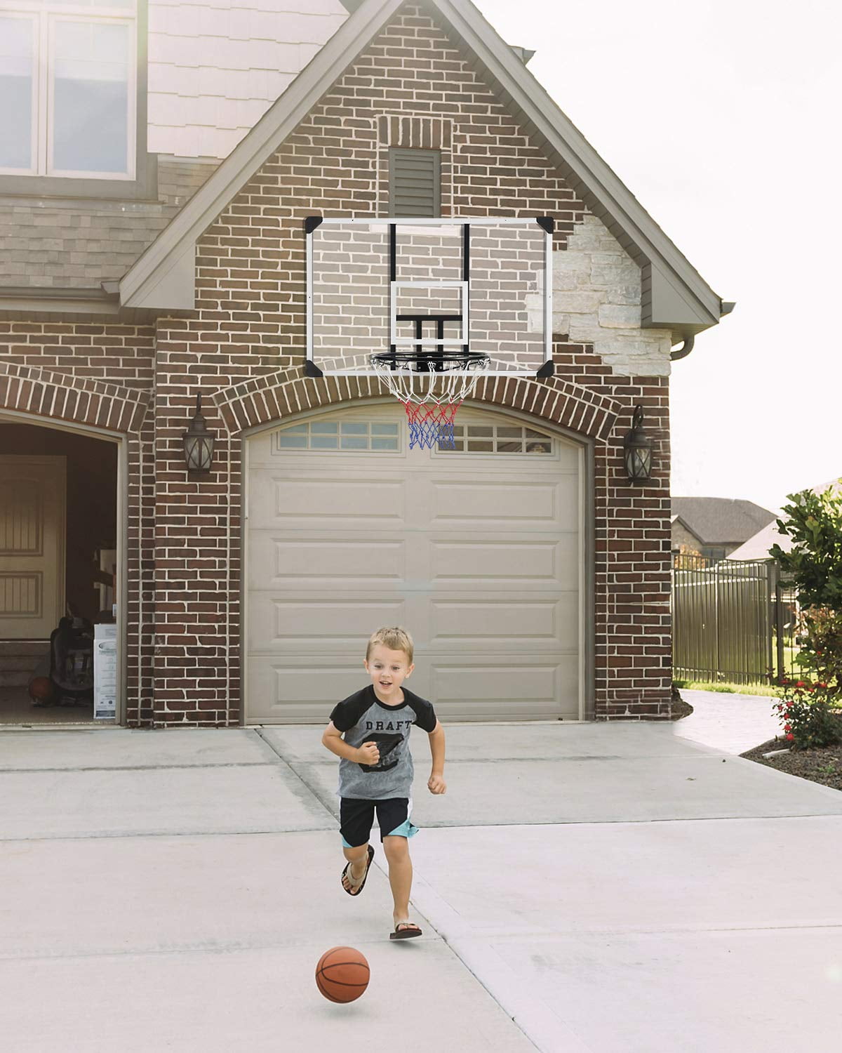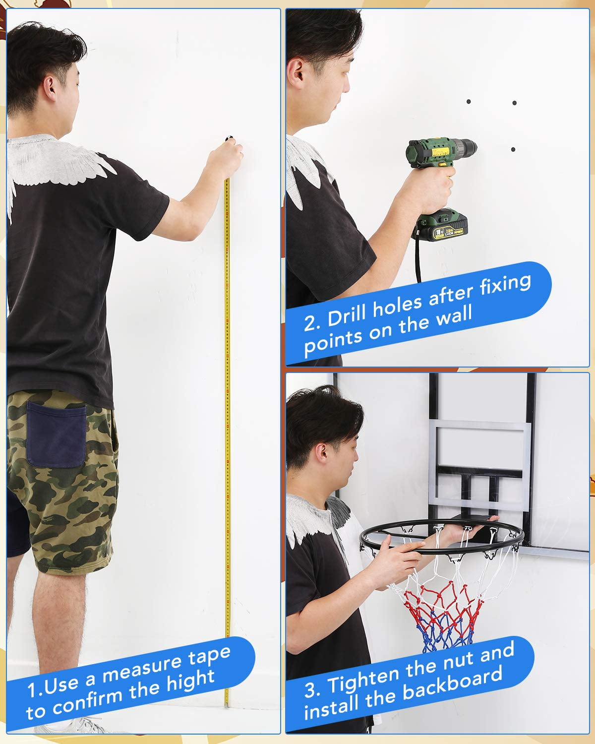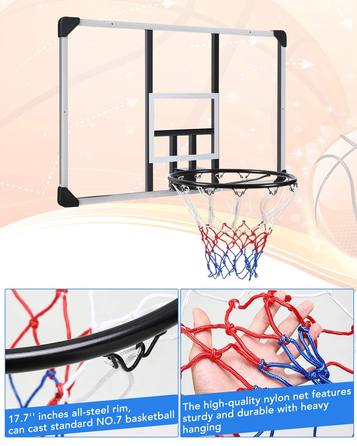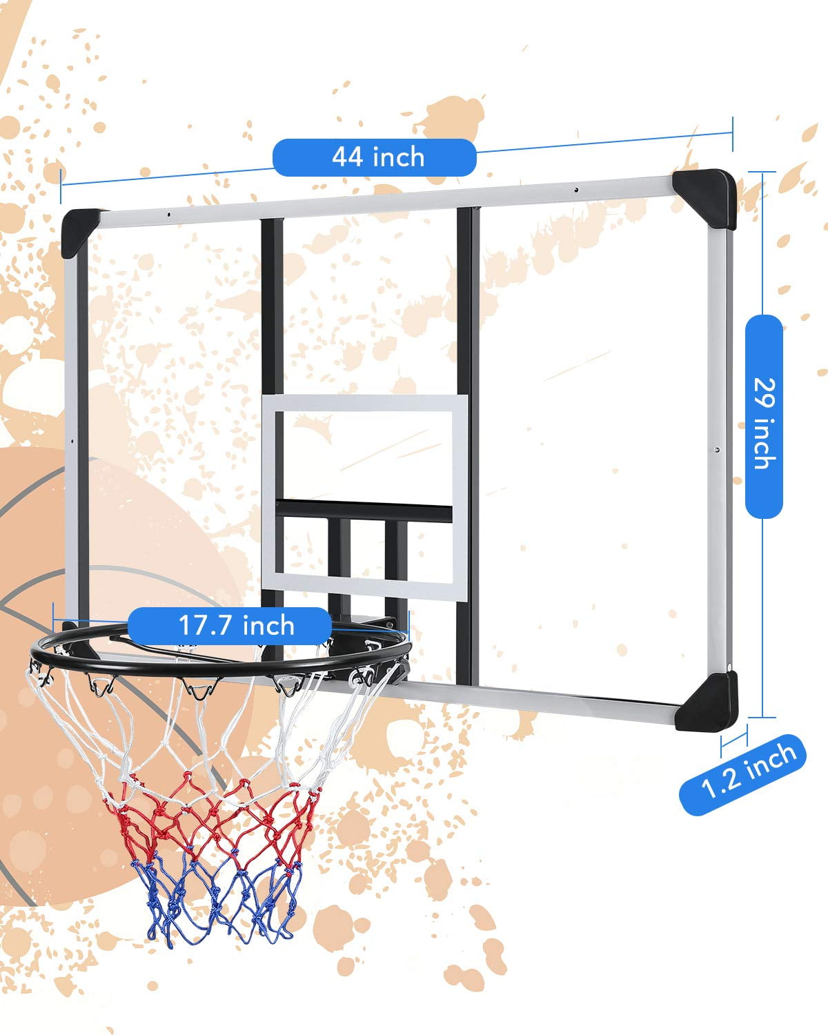 MaxKare 44″ Wall-Mount cc Backboard: 44″ L x 29″ W. Thickened 1.2″ backboard, more durable and not easy to break. High-density and high-quality PC material. Corrosion-resistant, crush-resistant and UV-resistant, all-weather fitting. The backboard frame is made of steel material sprayed with a rust-proof cover, enhancing the stability of the backboard Standard Hoop Set: 17.7″ inches all-steel rim, can cast standard basketball. Rim is high-temperature coated, odor-free and non-toxic. The net hook is high-class thickened steel, with reliable welding to keep sturdy and durable. High-quality, waterproof nylon net features sturdy and durable with heavy hanging for both indoor and outdoor fun Complete Kit, Space Saving: The set comes with all-steel hardware and tools. (wall plug, bolts, washer, backboard, net, rim ). Simply mount the basketball hoop to any vertical wall and start playing. The kit also supports door mounts for more convenient indoor play. Convenient and space-saving Easy Assembly and Set-Up: Use a measuring tape to mark the desired height and horizontal line. Mark the drilling holes by placing the stand on the wall. Drill the wall according to previous marks and fill them with expansion screws. Assemble the basketball hoop Authentic Wall-mount Portable Hoop: The polycarbonate backboard is impact-resistant, wall-mounted, and can be set up to any vertical wall. Can be mounted on flat walls and solid wood panels, Enjoy an authentic sports game at any location you desire