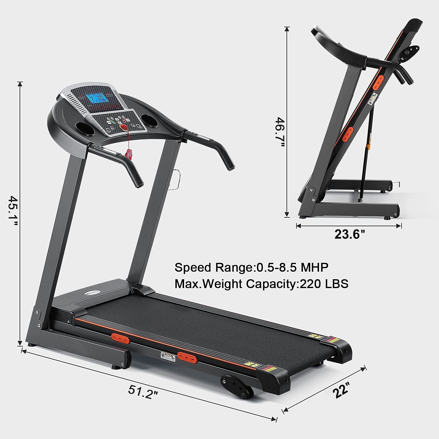 Specification Brand: MaxKare Main material: Steel Power: 2.5HP Rated Voltage: 110V Speed Range: 0.6-8 Mph Weight Capacity: 220 lbs Size: 17 x 43″ (Width x Length) Folded Size: 27.3 x 2.4 x 46.7 Power Source: Corded electric Speed Rating: 8.5 miles per hour Package Includes: 1 x Treadmill (accessories and tools) 1 x instruction