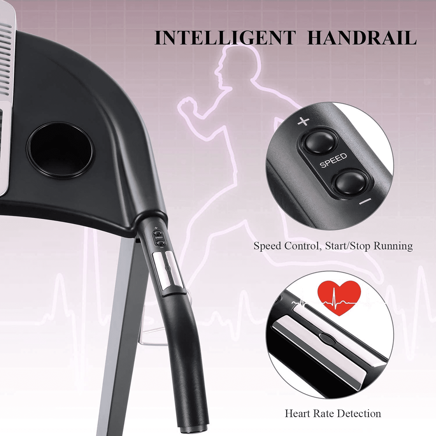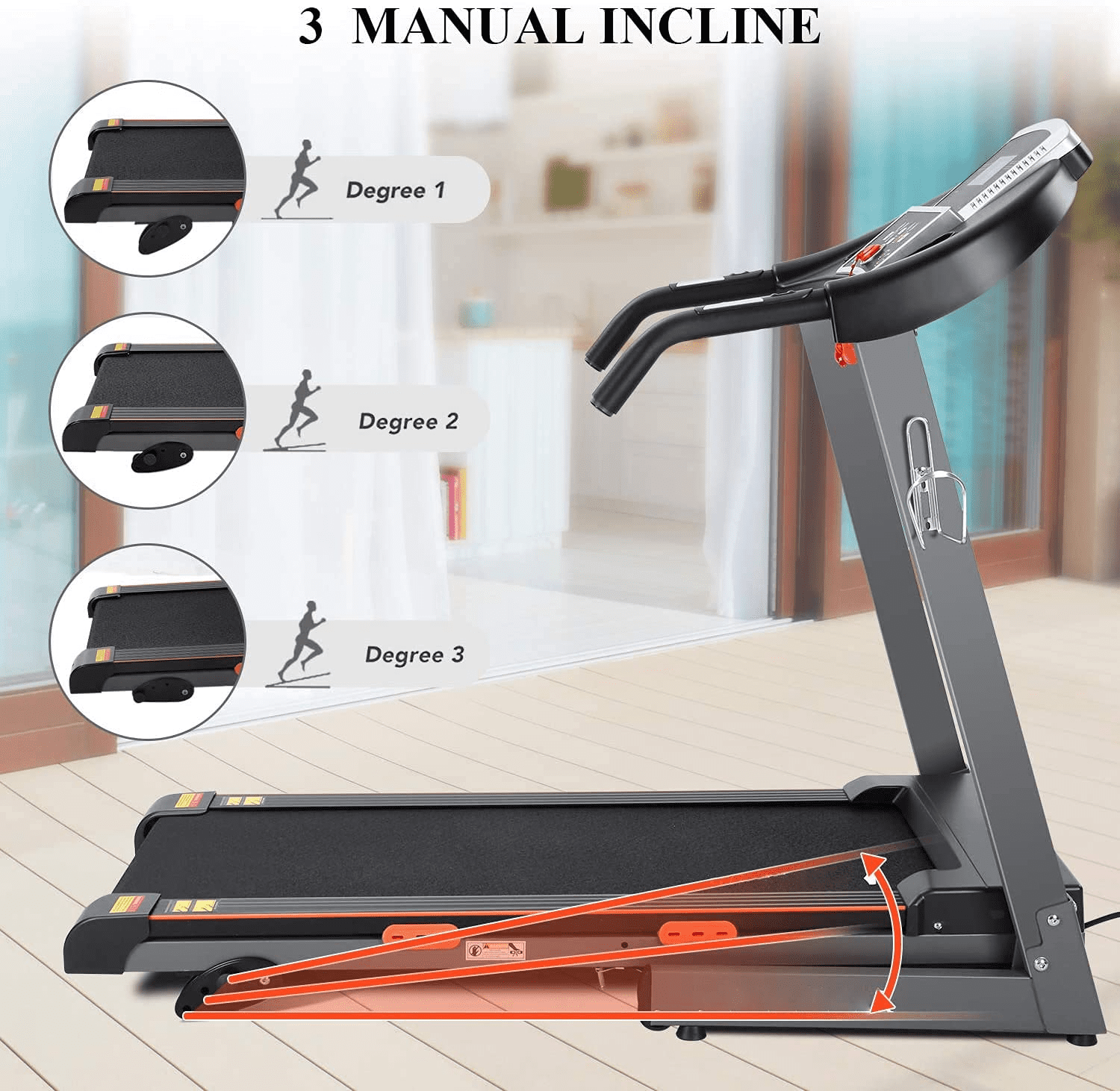 MaxKare Electric Treadmill with 3 Levels Manual Incline Wide running belt—double-deck platform wide running belt of the treadmill machine, comfortable safety belts on both sides, along with a non-slip diamond-patterned running belt, and the double-layered treadmill design greatly cushions the impact of running and effectively protects your knees and ankles. The upper layer consists of a high-elastic rubber running belt, and the bottom layer is a silicone antilock braking system, which effectively absorbs shock 15 training modes and 3 manual inclines the electric treadmill is equipped with 15 preset training modes. Choose the most suitable program for the running machine according to the amount of exercise needed, and the intensity is fully customizable by adjusting the treadmill speed. What’s more, the incline treadmill is equipped with adjustable slope angles, and you can easily switch between them by adjusting the base. Ideal for you to run, walk and do aerobic exercises at home. Heavy duty frame & quiet treadmill —the heavy duty treadmill is constructed of premium stainless steel, which makes the treadmill machine body durable and capable of heavy load-bearing. So, the electric motorized running machine is stutter-free and provides smooth running with minimum noise. Enjoy your run with peace and never worry about disturbing your family space saving & holders the hydraulic lever allows fold the folding treadmill in a breeze folding size: 27.3 x 2.4 x 46.7 in.). Which is convenient to store and space-saving. The space-saver treadmill is equipped with transport wheels, so you can move it to any place you want to exercise easily. The portable treadmill machine is also equipped with a cup holder to help you stay hydrated during exercising. Also, the pad and mobile phone holder provide entertainment at your command. Heart rate detection & LCD monitor—The handle of running machine is a heart rate detector. Automatic read of your heart rates by touching the handrail to accurately sense and monitor your health in real-time. You can control the speed and star or stop running through the armrest conveniently. The LCD monitor of the treadmills will also display data about your exercise, including speed, distance, calories burned, time, heart rate, and more. Work out more efficiently and scientifically.