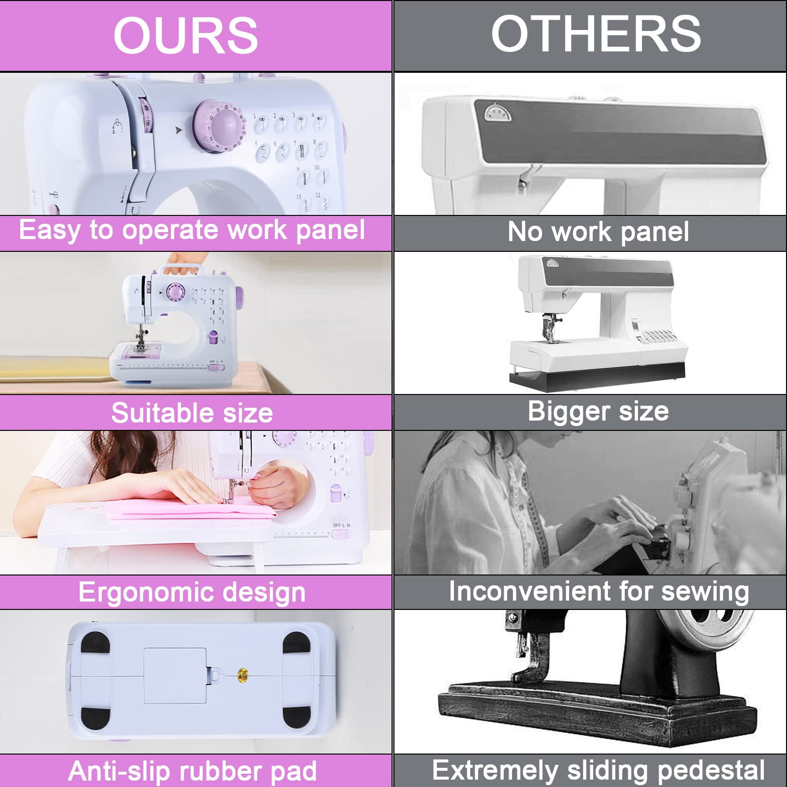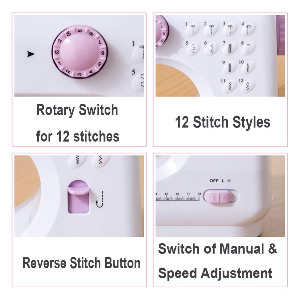🌸【Mini Size & Multifunction】:The size of this portable sewing machine is 10.8”x4.7”10.2”, exceptionally small, light weight and compact, easy to handle and use. Realize your creative dreams including basic, stretch and decorative stitches for fashion sewing, quilting, home decor and crafting.12 kinds of stitch line types are built in the device, multi-function integrated into one.Automatic winding design, simple production of winding bottom line 🌸【Full Accessories】:The mini sewing machine with a large extension table, provides extra support for your sewing and quilting projects. With lighting lamp, thread cutter, foot pedal, all the control switch have been designed in one button(light, speed, power), let you more convenient and stable while sewing. 🌸【Suitable for Daily Use】:Eat 4-6 layers of ordinary denim fabric, can sew a variety of clothes.Suitable for cotton fabric, linen, silk, ployester, thin demin and thin jeans, like t-shirt, toys and apron etc. due to this sewing machine is relatively small and compact, please make sure the fabric is not too thick or hard. 🌸【Easy to Use】:Dual power options powered by 4 AA batteries (not included in the package) or power adapter but please don’t use these 2 power supply modes at the same time. Double thread stitching make it easy to finish sewing without knotting. Low/high speed button is equipped for selection to keep safe and powerful. Ideal for beginners to make craft.The equipment adopts metal hook tip design, which is durable and does not jumper.Replaceable presser foot design, by changing different presser feet, to achieve more special functions for sewing.Horizontal rotary shuttle structure design, makes the equipment operation quieter, reduce the difficulty of bottom thread installation 🌸【Great Gift】:Made of upgraded eco-friendly material, You can DIY your handbags, clothes, curtains, sheets, tablecloths, shopping bags, lunch bags, pillow dolls and other fabrics. Cute and sleek look makes it an ideal gift for your daughter, sister, mother, on Children’s Day,Birthday, Mother’s Day, Valentine’s Day, Thanksgiving Day, Christmas.