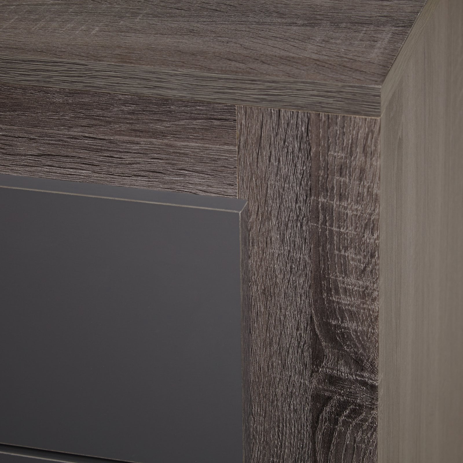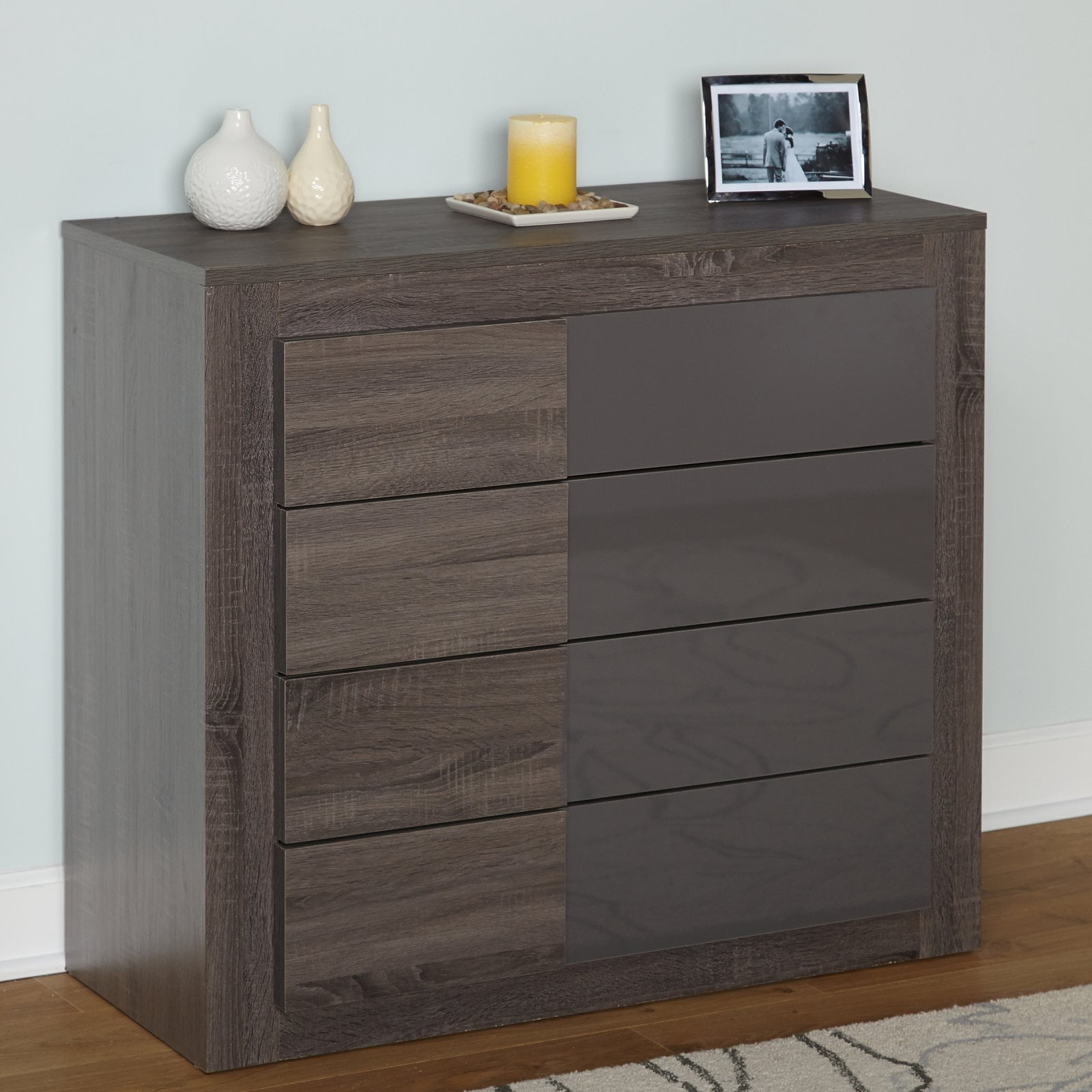 Sleek and versatile, the Maya four drawer chest features Stark asymmetrical lines and a sleek grey finish. Fashionably crafted with laminated particle board in a Dark Sonoma Oak finish. The Maya Four Drawer Chest is a throwback to the bold designs. Four large spacious drawers offer ample wardrobe space. Perfect to store in your clothes or accessories. Blends in well with any home décor or with any of your existing bed accessories