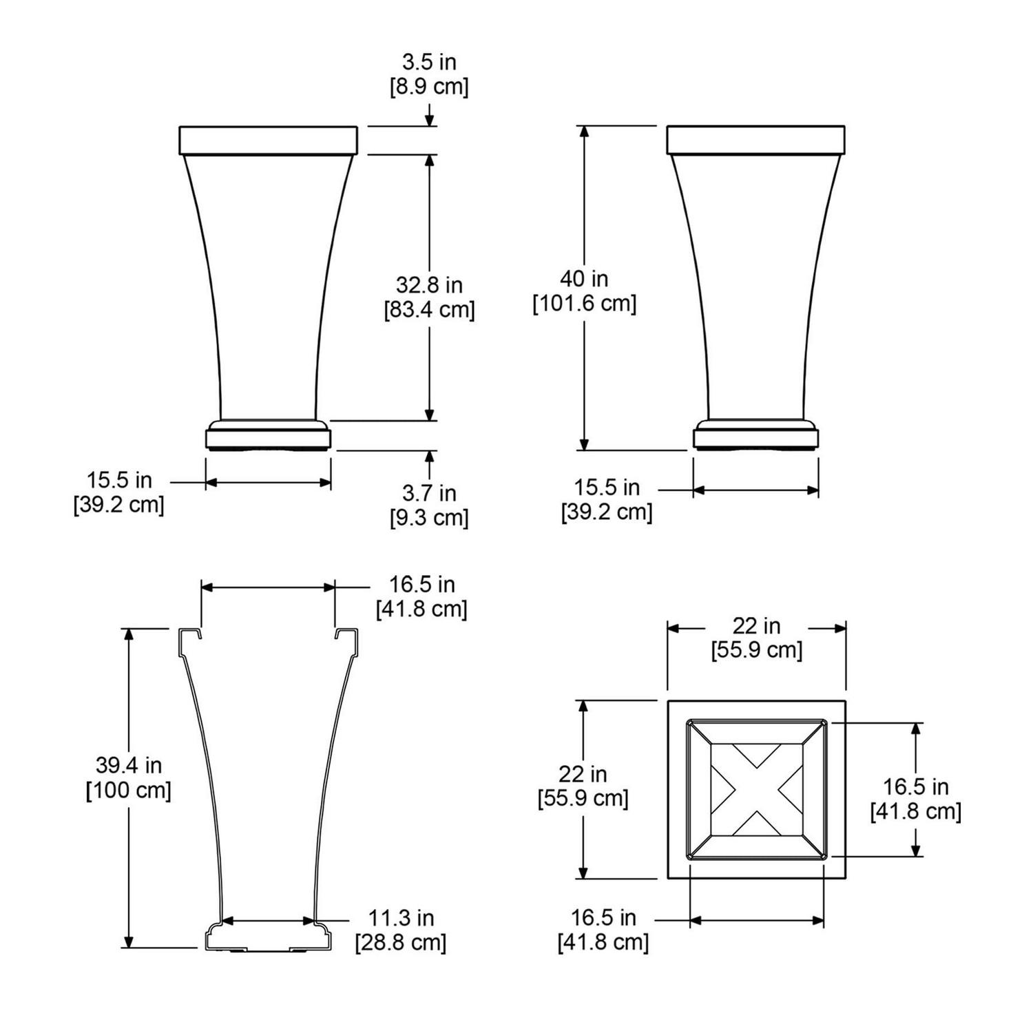 – Weight: 30lbs; Outside Dimensions: 22in L x 22in W x 40in H; Opening Dimensions: 16.5 in L x 16.5in W; Footprint: 15.5in x 15.5in; Soil Capacity: 38 gallons (143 liters)