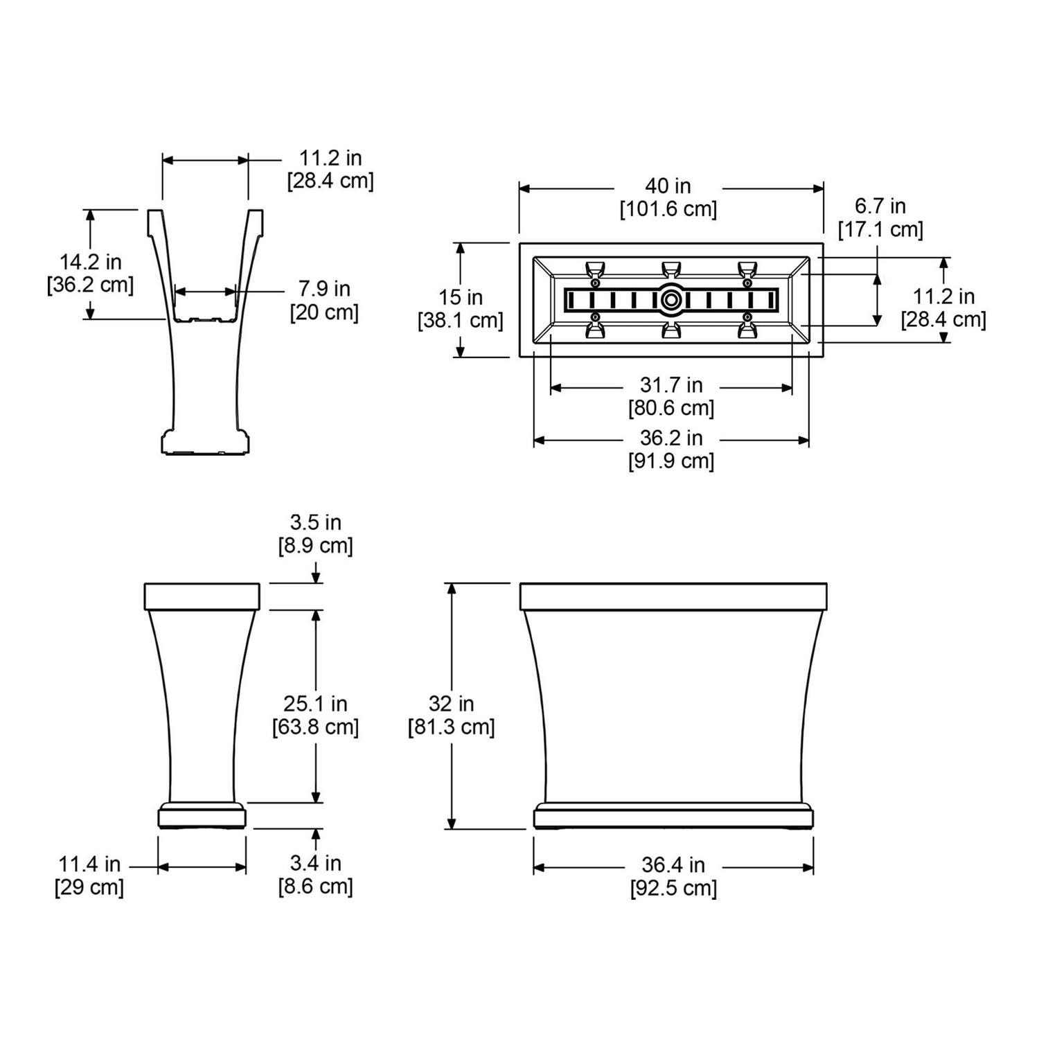 – Weight: 35lbs; Outside Dimensions: 40in L x 15in W x 32in H; Inside Dimensions (w/Tray insert): 36.2in L x 11.2in W x 14.2in H; Footprint: 36.4in x 11.4in; Soil Capacity: 17.5 gallons (66 liters)