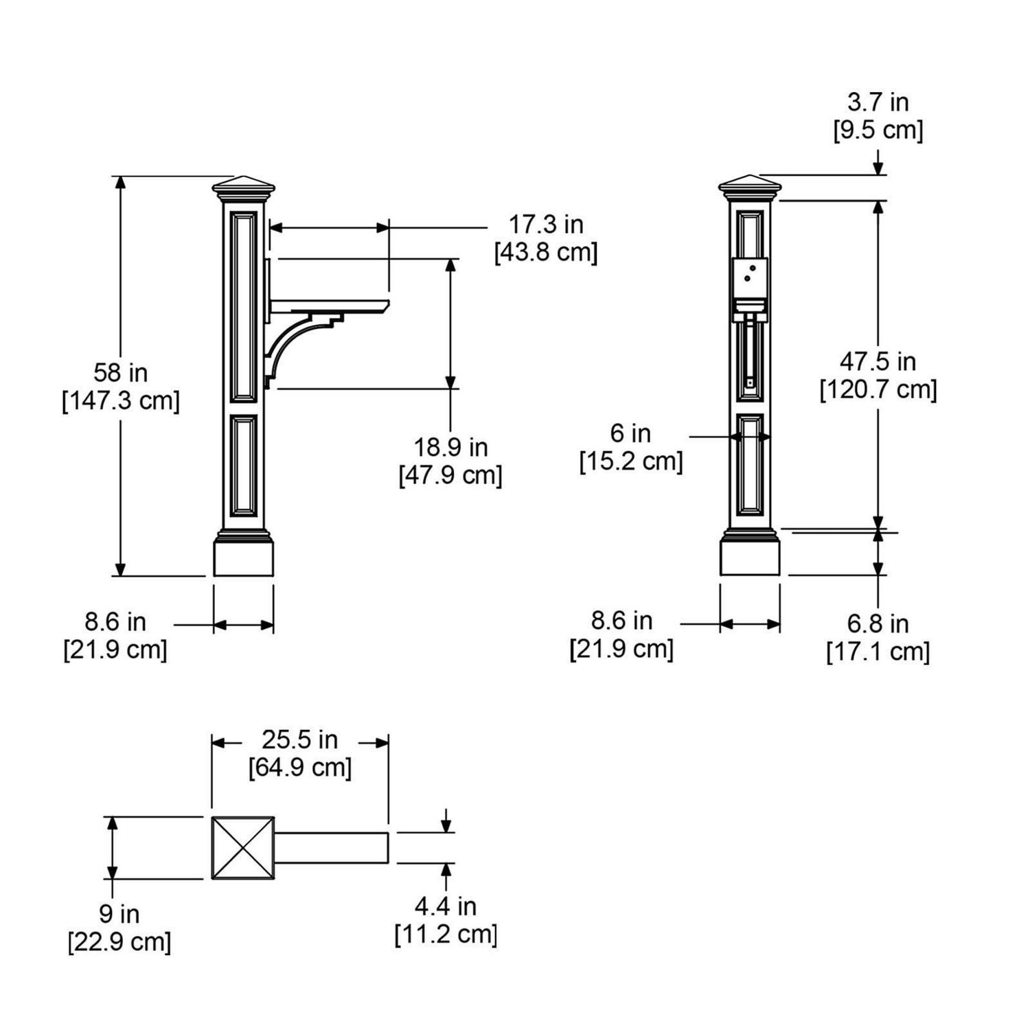 With its inset panels and classic design, the traditional Charleston Mail Post is a timeless choice that is a surefire way to add curb appeal to your home. The Charleston Mail Post in Black ships in 2 boxes – it includes a decorative post, mailbox support arm, hardware kit, and instructions. Best suited for mailboxes weighing less than 8lbs.