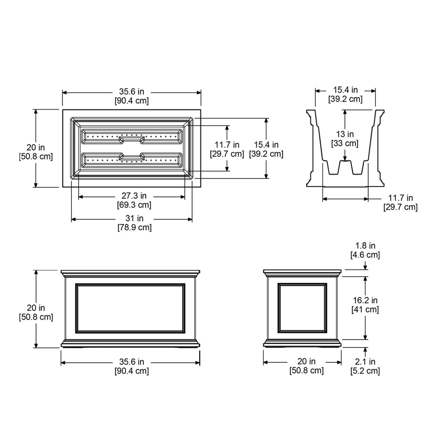 – Weight: 22lbs; Outside Dimensions: 35.6in L x 20in W x 20in H; Inside Dimensions: 31in L x 15.4in W x 13in D; Capacity: Approximately 22 gallons (83.3 liters) soil capacity and 16 gallons (60.6 liters) water capacity