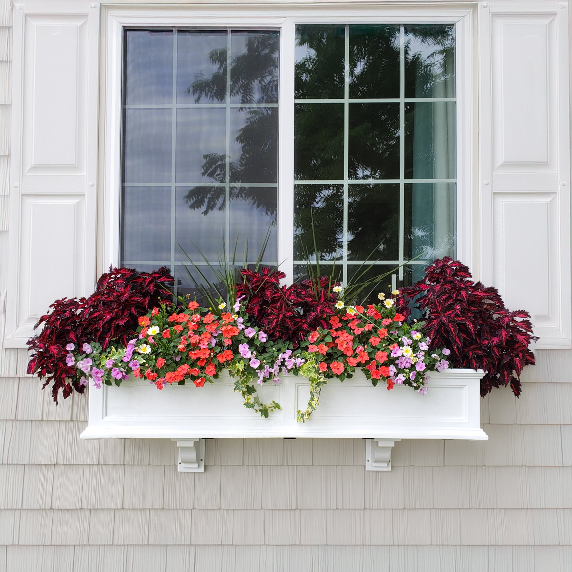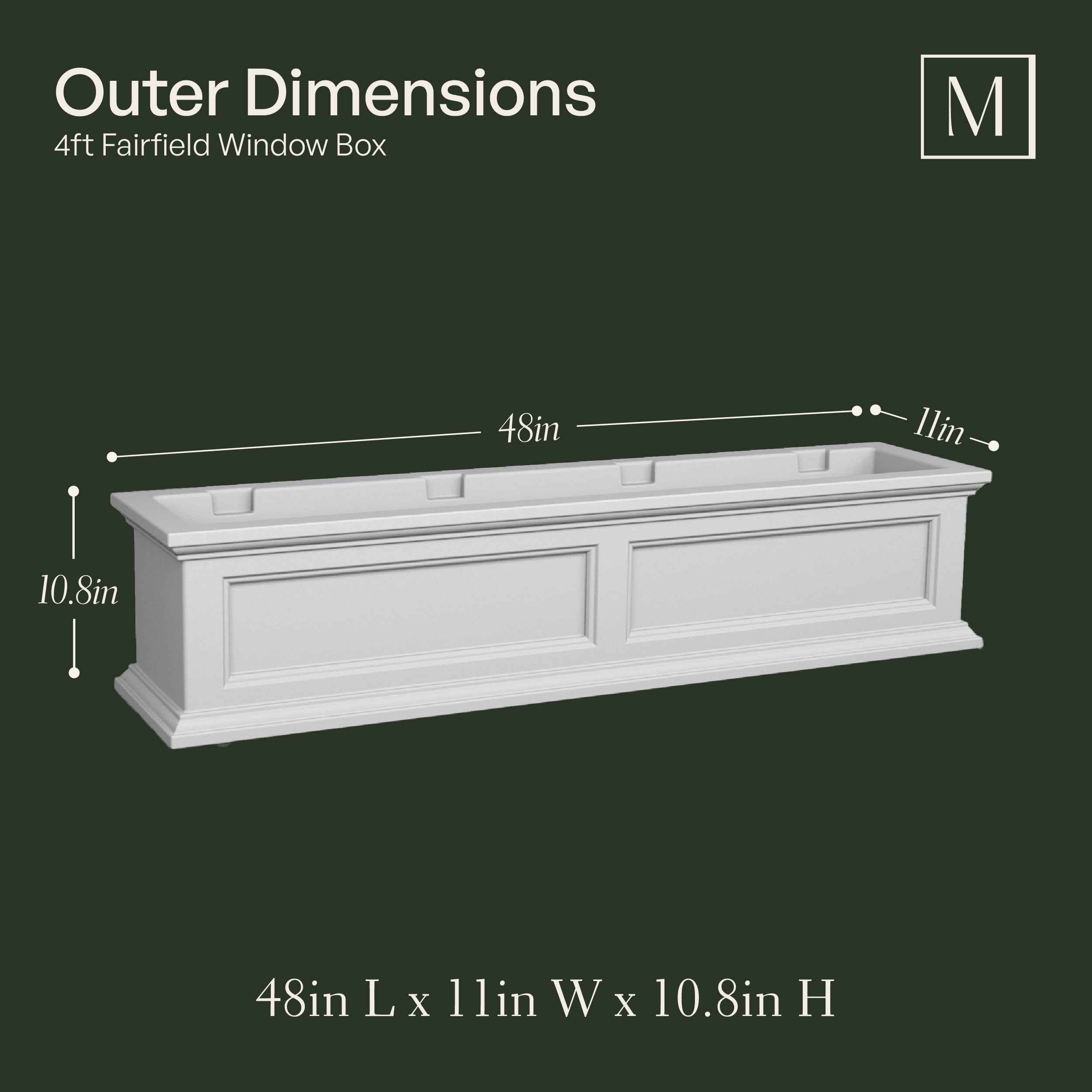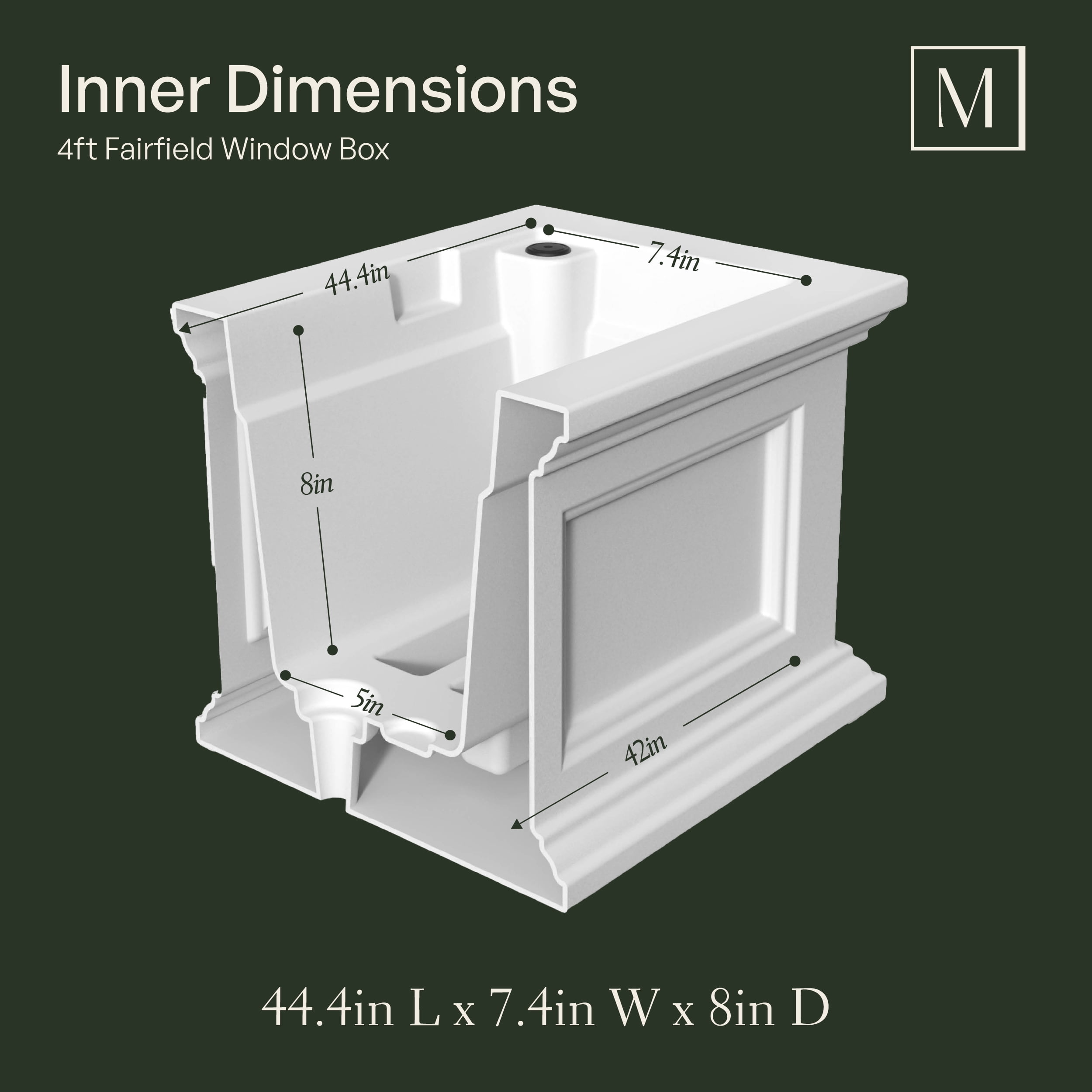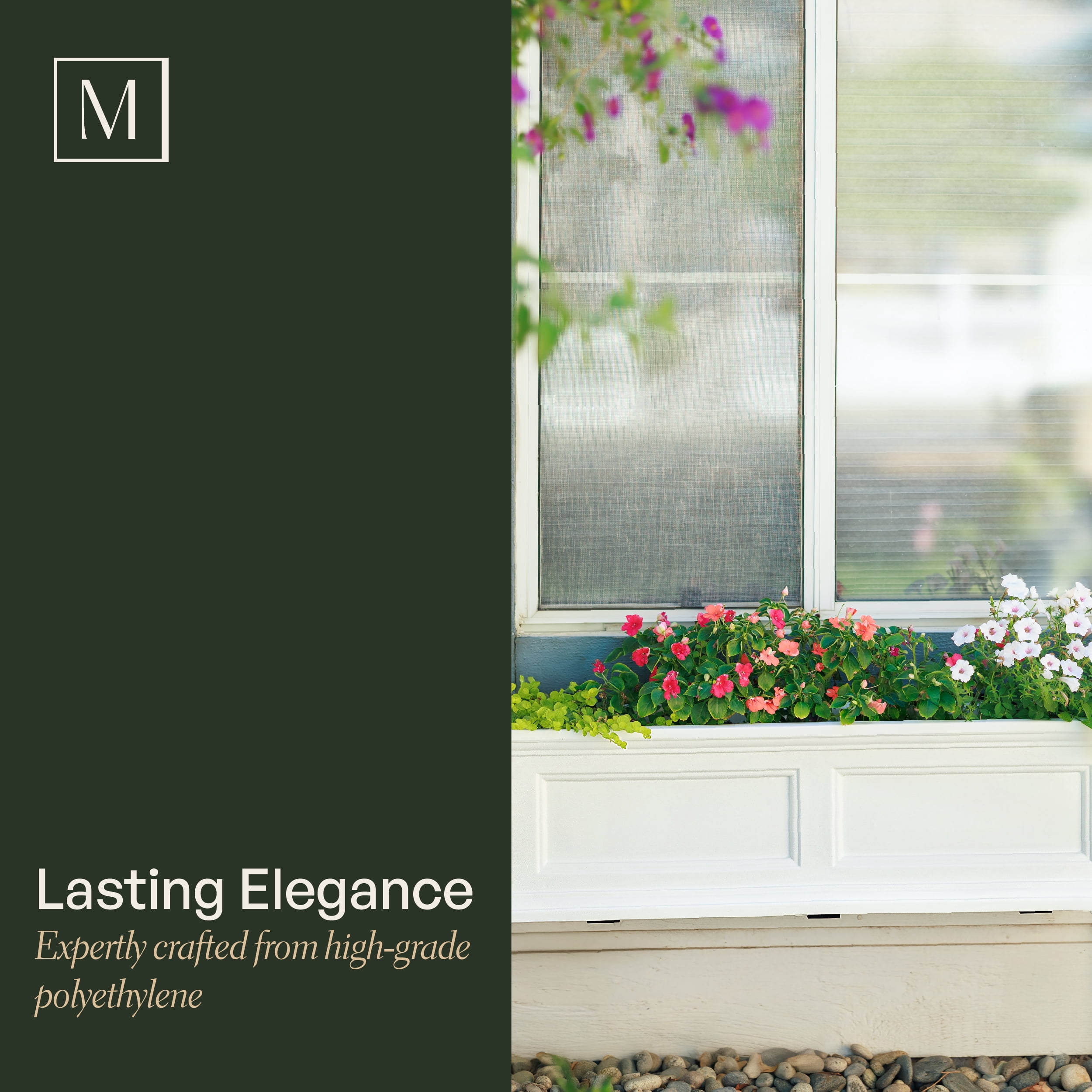 Self watering feature keeps plants consistently hydrated and healthy, reducing maintenance while ensuring lush, thriving displays that enhance any indoor or outdoor space UV fade resistant polyethylene maintains its rich color while providing durable protection against sun exposure and harsh weather for lasting outdoor performance Includes durable steel wall mount brackets for secure installation, with complementary accessories sold separately to customize and complete your setup with ease Engineered for reliable all season performance with integrated overflow drainage that protects roots, prevents overwatering, and promotes strong, healthy growth Outer Dimensions: 48in L x 11in W x 11in H Inner Dimensions: 45in L x 7.5in W x 8in H Weight: 20lb Soil Capacity: 9.5 Gal Water Reservoir Capacity: 4 Gal Clean with mild soap, water, and a soft cloth; rinse with a hose or gently power wash surfaces to maintain a fresh, clean appearance and keep your product looking new