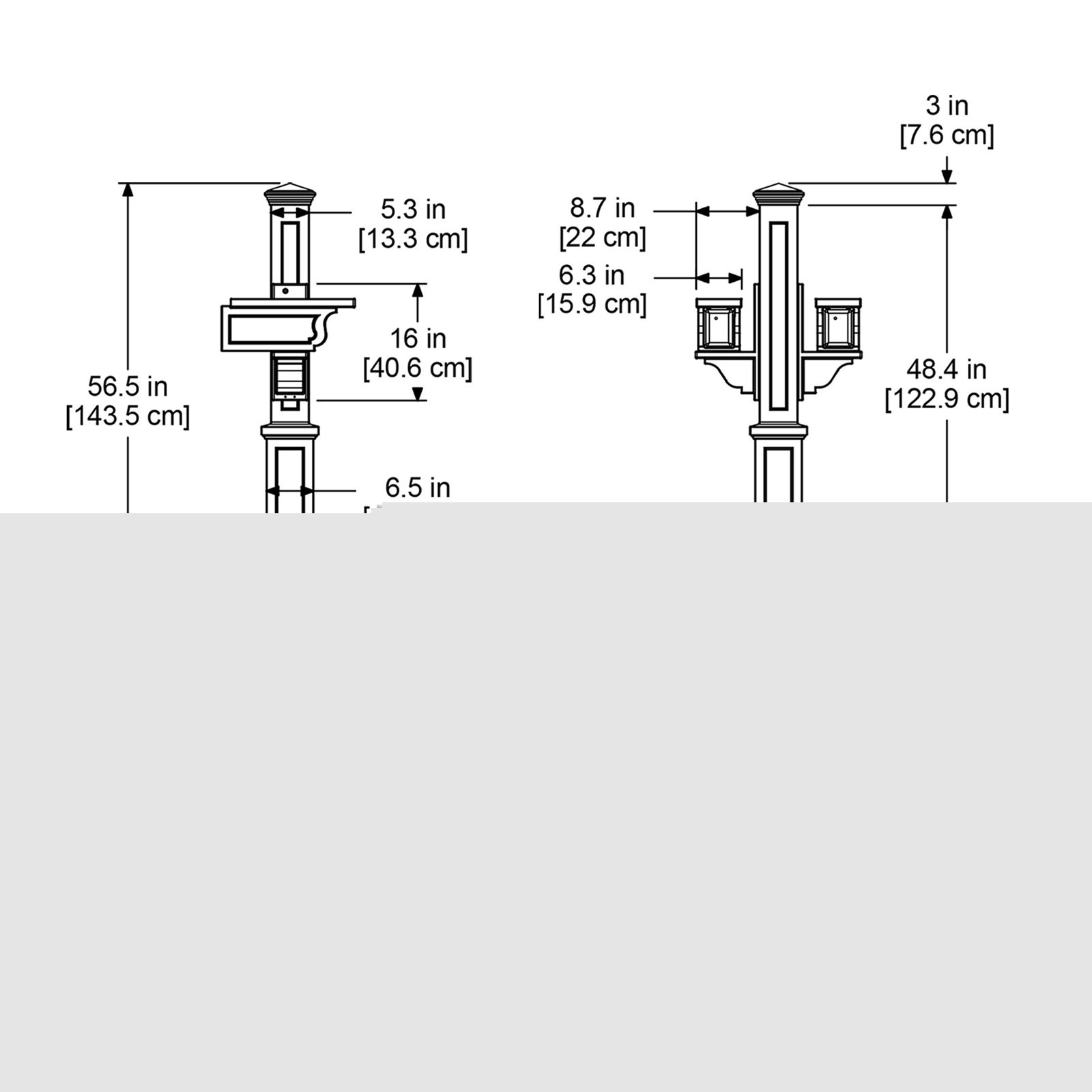– Mayne offers a 15-year residential warranty or a 5-year commercial warranty on this mail post. Outside Dimensions: 18.3in L x 22.8in W x 56.5in H (46.4cm x 57.8cm x 143.5cm)