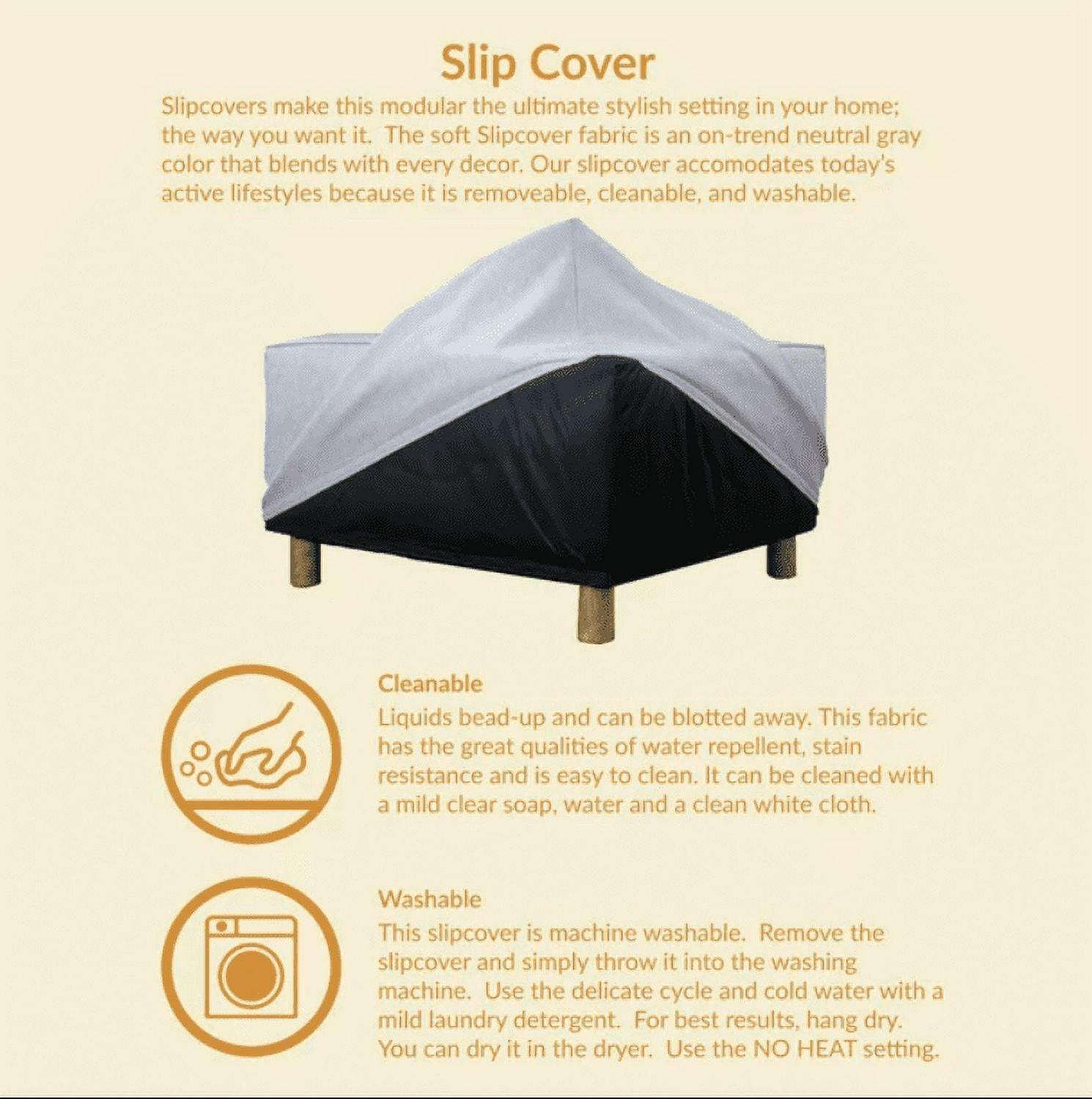 – Machine washable and easy to clean Slipcover in a soft textured neutral gray fabric makes this Modular a breeze to maintain Velcro managed Slipcover for ease of taking the cover off and putting it back on and creating a nice tailored look
