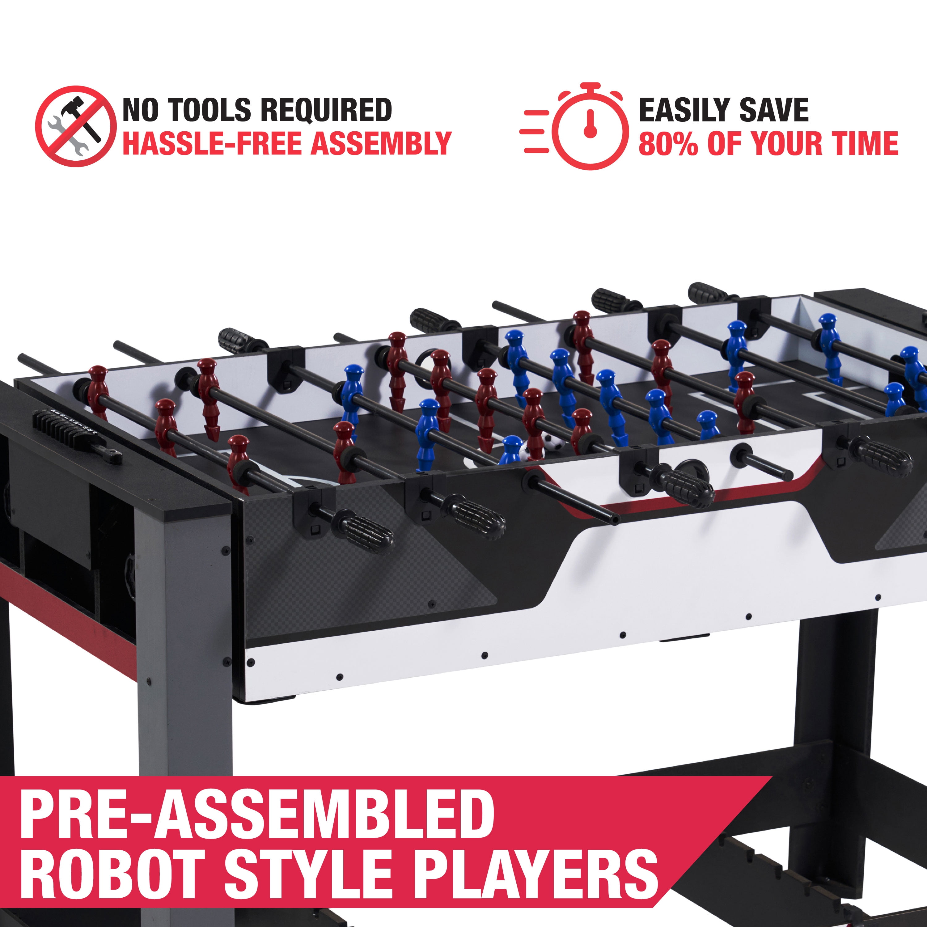 MD Sports 48-inch 2 in 1 Combo Game Table includes a foosball game and a pool game in one great game table. Playing accessories are included for both games with this combo game table. Playing with your friends and family is a lot of fun. Switching between games takes only a few seconds; just use the adjustable knobs to change between games easily. The foosball robot-style players are pre-assembled, saving you about 80% of your time when putting together this table. This game table is ideal for any size game room at 48″ L x 23″ W x 31″ H. All accessories needed to play billiards and foosball are included, and storage in each apron makes it easy to store accessories when not in use. Don’t miss out on this combo game table for your game room or basement.