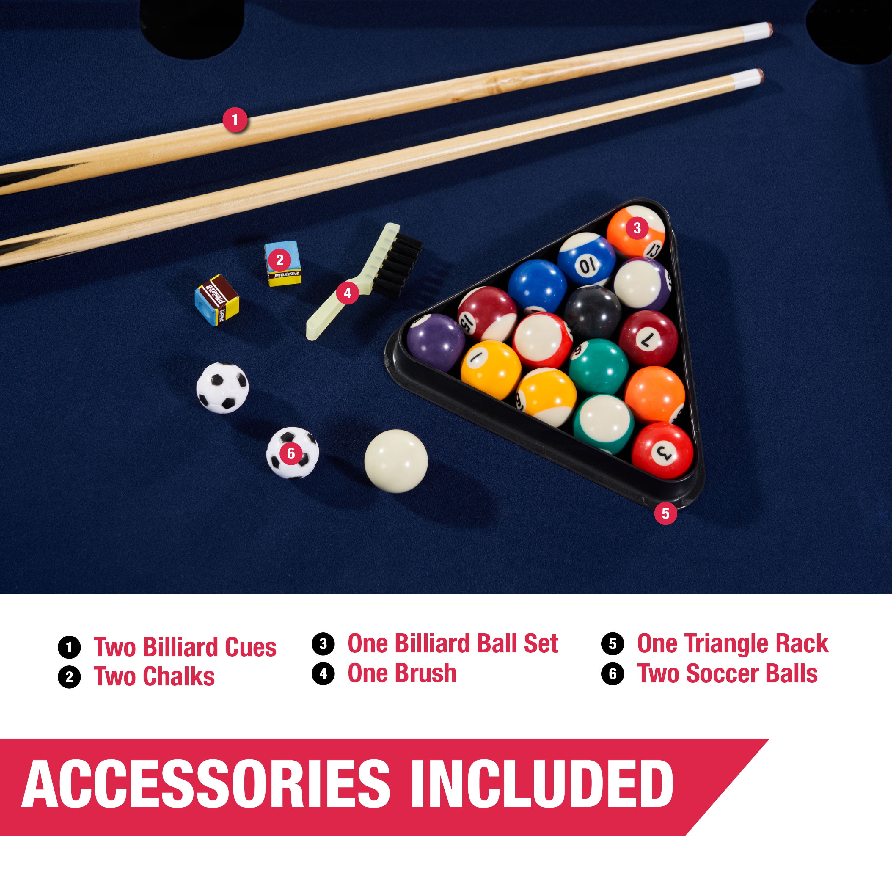MD Sports 2-in-1 Combo Game Table 48”, Foosball and Billiards Combo Table, Swivel Multi Game Table Perfect for Family Game Rooms, All-In-One Arcade Table DOUBLE THE FUN: The 48” compact multi-game table offers foosball and billiards in one! Flip between games for competitive fun with family and friends. The combo table is cost-effective and includes accessories. It keeps the family entertained for hours. BILLIARDS – The pool table features drop pockets, a blue velvet surface, a 38” x 20.5” playfield, and quality rubber bumpers for a consistent ball bounce. Loosen the adjustable knobs and turn the table over to switch to a fun game of foosball. FOOSBALL: Enjoy hassle-free setup with pre-assembled foosball players on .5” steel rods. Install players easily with patented plug-in bearings. The playfield size is 40.3” x 22.6”. Store the players and pool cue sticks under the table for easy access. CRAFTMANSHIP: The gray and white table .5” apron, made of robust PVC-laminated engineered wood, endures rigorous use. Reinforced L-style legs ensure stability during intense play, while 1.5” leg levelers maintain an even playing surface. SIZE AND SPACE: This compact table (48″L x 23.88″W x 31.75″H) is a space-saver. The suggested room size is 11’ x 9’. Effortlessly switch between games on this dynamic 2-in-1 table. The combo table makes a great gift and an absolute blast at parties. GEAR UP FOR GAME TIME: Your swivel table comes complete with accessories – (2) 36” Billiard Cue Sticks, (2) Chalks, Billiard 1.5” Ball Set, Brush, Triangle Rack, and (2) Soccer Balls, ensuring you’re all set to dive into the gaming excitement!