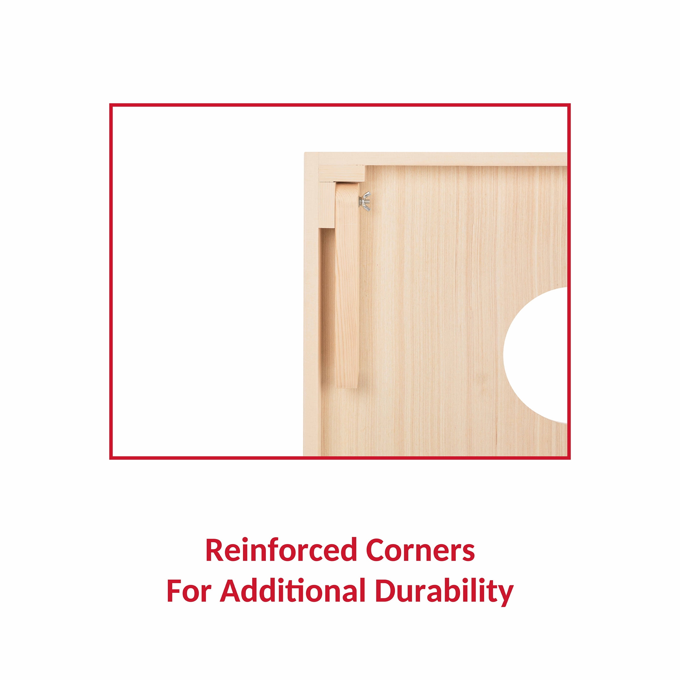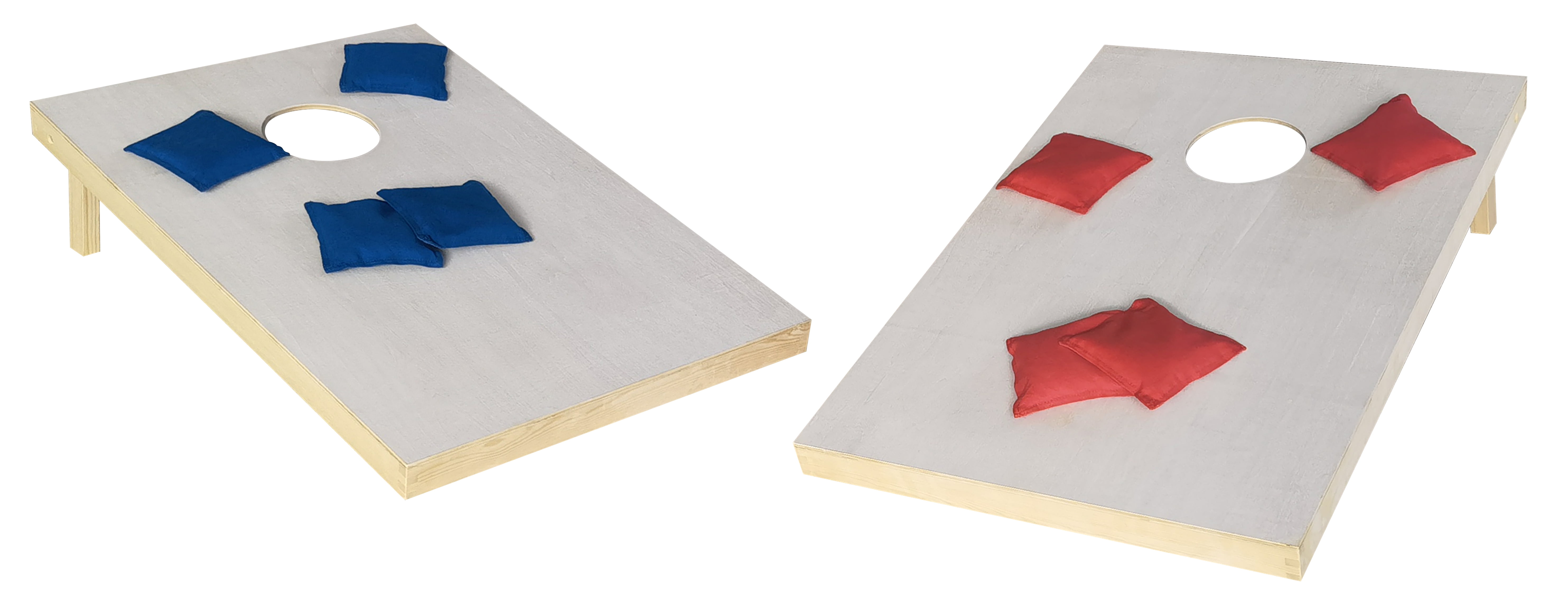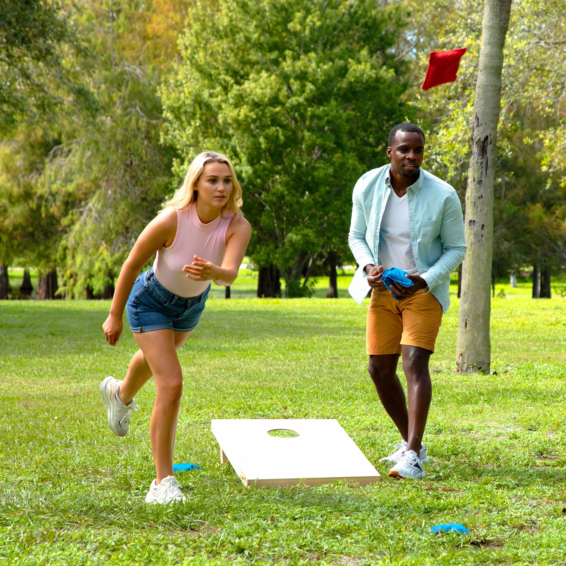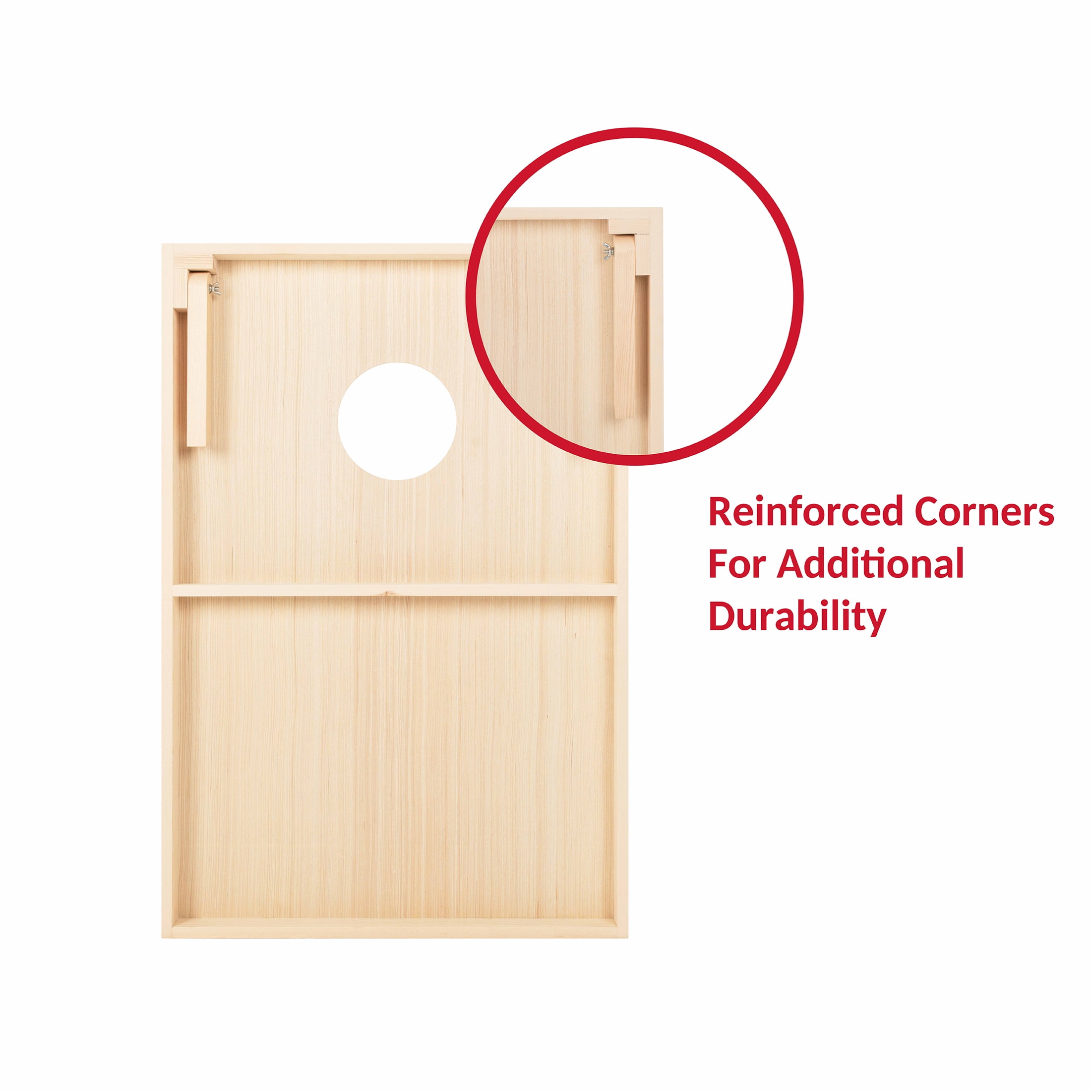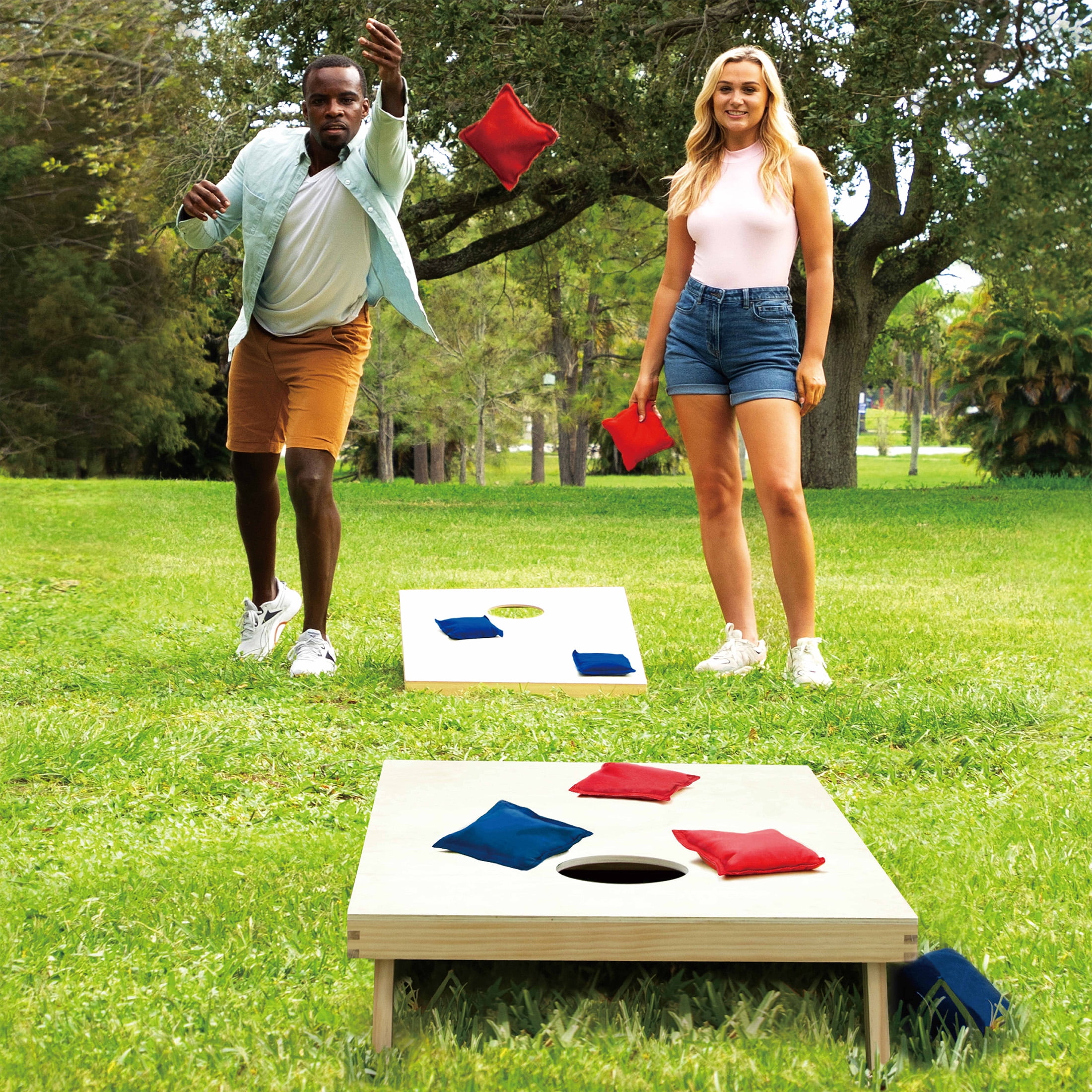 MD Sports 36 inch Solid Wood Cornhole Set with All-Weather Bean Bags Great outdoor group game Premium pine wood is used in the frame and legs for extra strength and durability Solid wood frame and legs Plywood playfield with a protective finish Official size bean bags measure 6 inch x 6 inch Bags filled with recycled plastic pellets Eight official-size dual-sided slide-and-stick bags No assembly required Included: 2-boards, 8-bags in 2 color sets