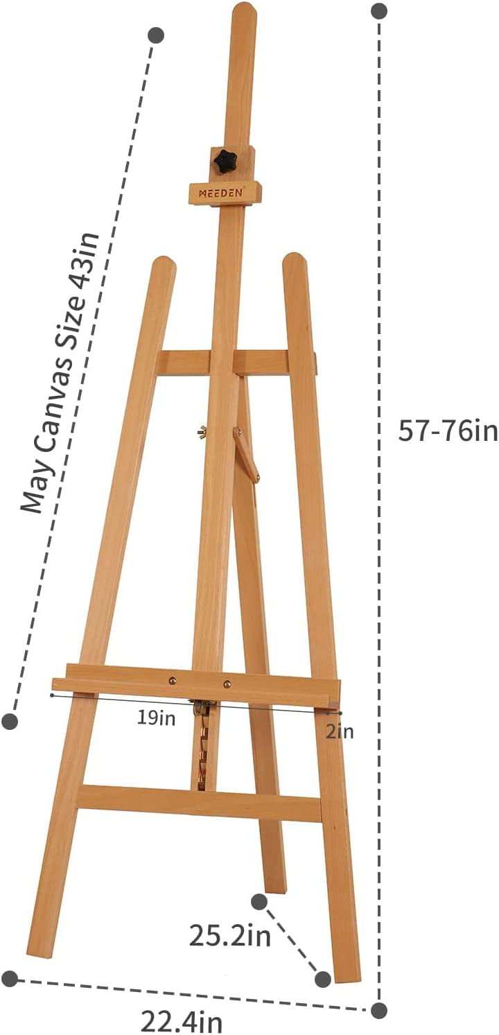 PAINT FROM ANY PERSPECTIVE: This art display easel is height adjustable,you can use the slider to make different position for displaying or painting,the height can be adjusted from 57-76inches.Meanwhile djusting the rear leg to meet 0-45°angles needs. KEEPS YOUR INSPIRATION FLOWING: This artist adjustable easel makes a perfect studio easel for your larger pieces of work,holding canvas size max in 43inches.European solid beech wood with delicate polished effet bring your inspiration for higher quality work and improved artistic level. HIGH QUALITY AND STABILITY: This floor easel has sturdy A frame construction, eco-friendly, giving it longevity and stability.Overall length in 22.4 inches and Depth in 25 inches.It has a pencile ledge 19 inches in length and 2 inches in width,enough space for large canvas and painting accessories. EASY ASSEMBLY: MEEDEN A frame display easel comes with a detailed instruction brochure and assembling video attched in our listing for how to easily assemble your new easel. All assembly tools are packed well in the package. MEEDEN for ULTIMATE SATISFACTION: MEEDEN is more like a family with hundreds of members wholly dedicated to helping you succeed in your artistic endeavors through high-quality, unique art supplies. And like a family, we stick together, and if anything goes south, you can always rely on MEEDEN, through thick and thin – give us a little sign – a mail, a call, or a message.