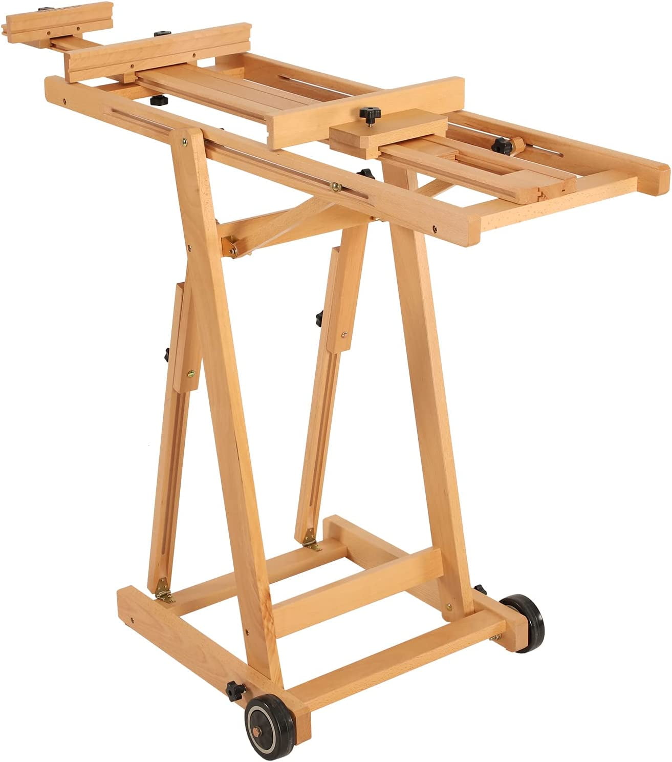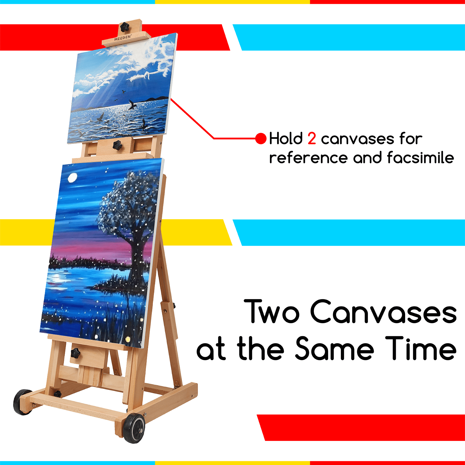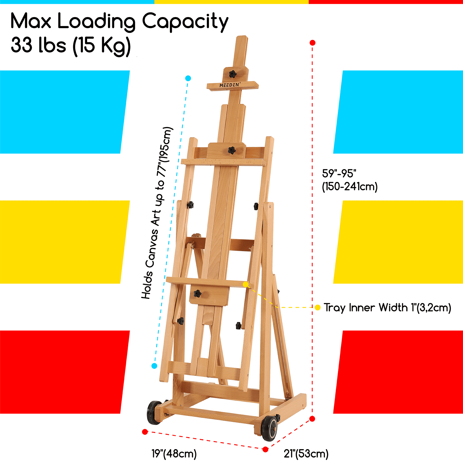 This is a versatile solid beech Studio h-frame easel, total height adjustable from 59″ (150cm) to 95″ (240cm) while tilting in vertical, holding canvas Wooden art up to 77″ (196cm).The maximum loading capacity is 33 lbs (15kg). Versatile h-frame easel is made of finely handcrafted of smooth, sanded beechwood, Made for artists who think and work big Studio easel has two front large rolling wheels so that moving the easel and locking it into place is effortless. Adjustable-height & angle mast contains three sliders that freely adjust to the size of the canvas to meet your painting needs Its wide stance and broad foundation make it the easel of choice for the serious artist who works on a giant scale. Go Deluxe if your canvases are wide as well as tall Hand crafted in a light clear coat, deluxe yet functional the large artist studio easel, pictorial instruction and tools included to assemble, satisfaction guarantee, no doubt trying this versatile easel by MEEDEN. Assembling Video included.
