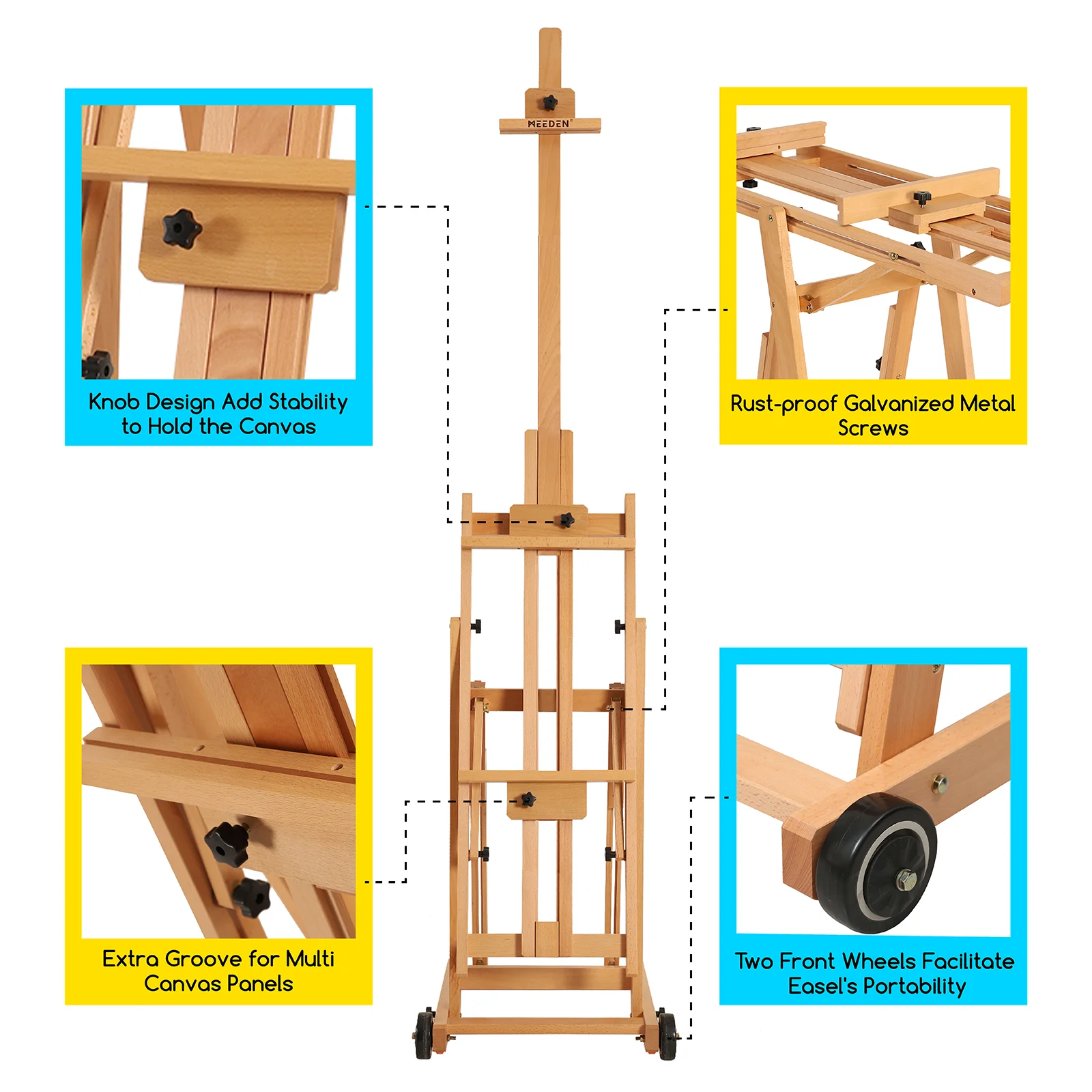 MEEDEN Large H-Frame Studio Easel, Wooden Art Easel with Wheels, Studio Artist Easel for Painting, Movable and Tilting Flat Available, Holds Canvas up to 77″