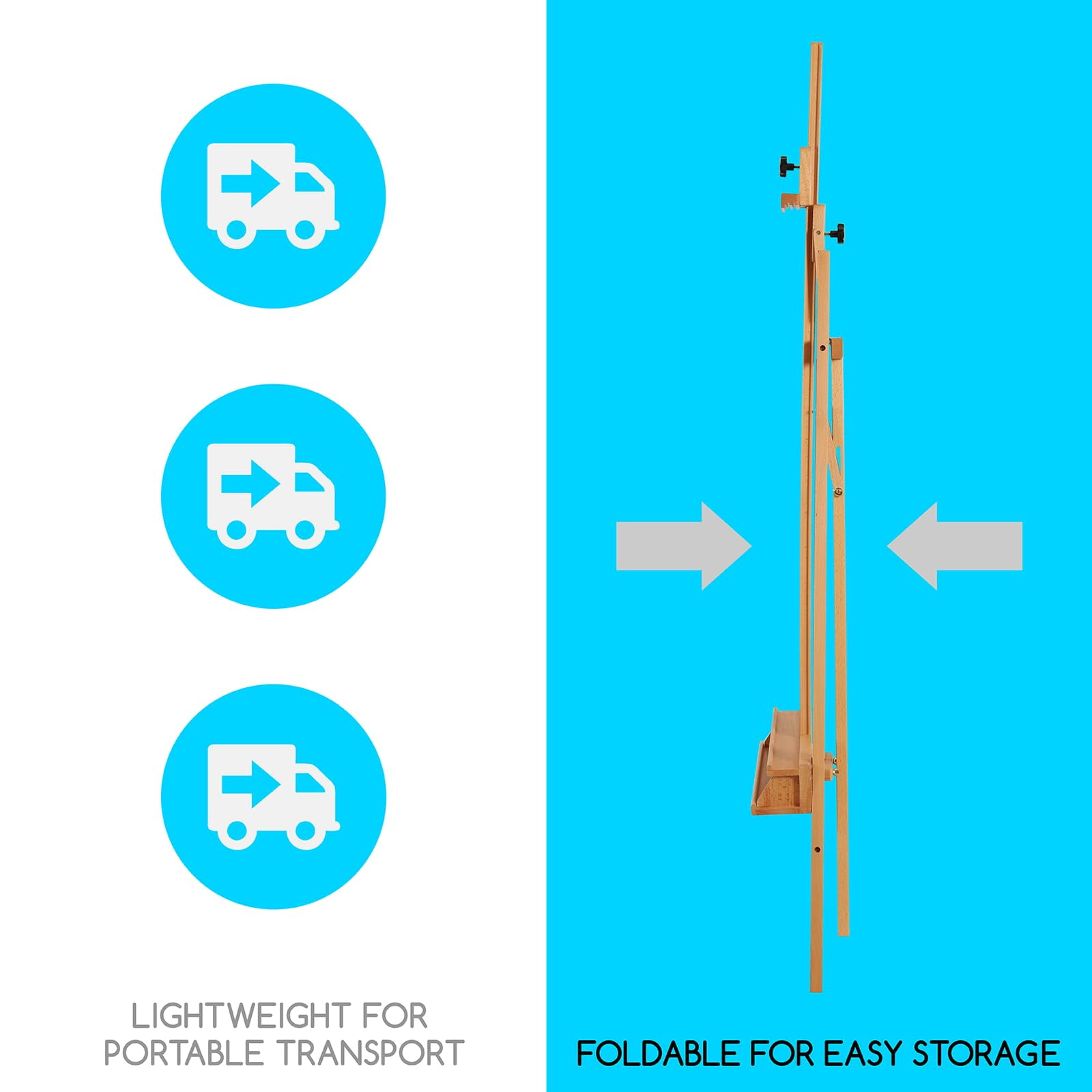 Lyre style studio easel which could be adjusted from 63″ to 89″ in height, holds canvas up to 48″ and the maximum loading capacity is 19.8 lbs (9kg). Very easy to assemble, instructions sent to you in the package. Solid beech wood made with refined handcraft, quality steel fittings ensure the wooden art easel stability and durability. A large ledge for brushes and paints, focus more on creating your masterpiece and saving space. 3 ways to adjust. The center mast of the large easel can be tilted forward up to 10° for pastel work. The ratchet height mechanism is quick and easy to adjust. 3-point stability, the rear leg folds in for easy storage. This artist studio easel tilts vertically, a feature that artists who paint on tall canvases find attractive because it brings the top of the canvas within closer reach. Pastel artists also appreciate this feature because it allows pastel dust to fall naturally away from the surface Foldable for easy transport and storage, whether indoors or field sketch paintings, this artist easel is reliable to take that responsibility, 100% satisfaction guarantee and three years warranty of this large beechwood easel, enjoy your time painting with it.