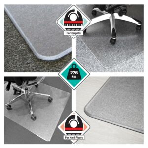 Cleartex Megamat extra heavy duty polycarbonate chair mats designed for users up to 500 lbs. Perfect for use with Big & Tall / 24 hour chairs. The ultimate in quality and durability in floor protection and ergonomics. These high clarity chairmats are made from Floortex Original polycarbonate which has double the impact strength of PVC and will not crack, curl, discolor or smell. High gauge ideally suited for use on home or office hard floors or any pile of carpeted flooring. The perfectly flat and hard surface provides easy glide movement of caster based chairs which can reduce leg fatigue and lower back strain. Megamat is environmentally safe, free from Phthalates, PVC and toxic chemicals. An ideal choice for people with allergies. Eco-friendly manufacturing with 50% of our manufacturing site s energy coming from on-site and external renewable sources. 100% recyclable. Our polycarbonate mats are delivered flat for immediate use.