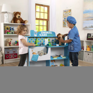 This is the perfect space for caring for furry friends! With a veterinarian side and a groomer side, plush pets (not included) can be examined, treated, and pampered for endless hours of imaginative fun. The sturdy wooden play center features an x-ray lens with two removable x-rays, pet scale, blood pressure monitor, sink, treat chute, pump bottle dispenser, and lots of storage. There are hooks and holders for lots of accessories. Detailed assembly instructions are included (assembles with just a Phillips head screwdriver, not included). Kids three and older will love having their very own space to nurture and care for their plush pals!