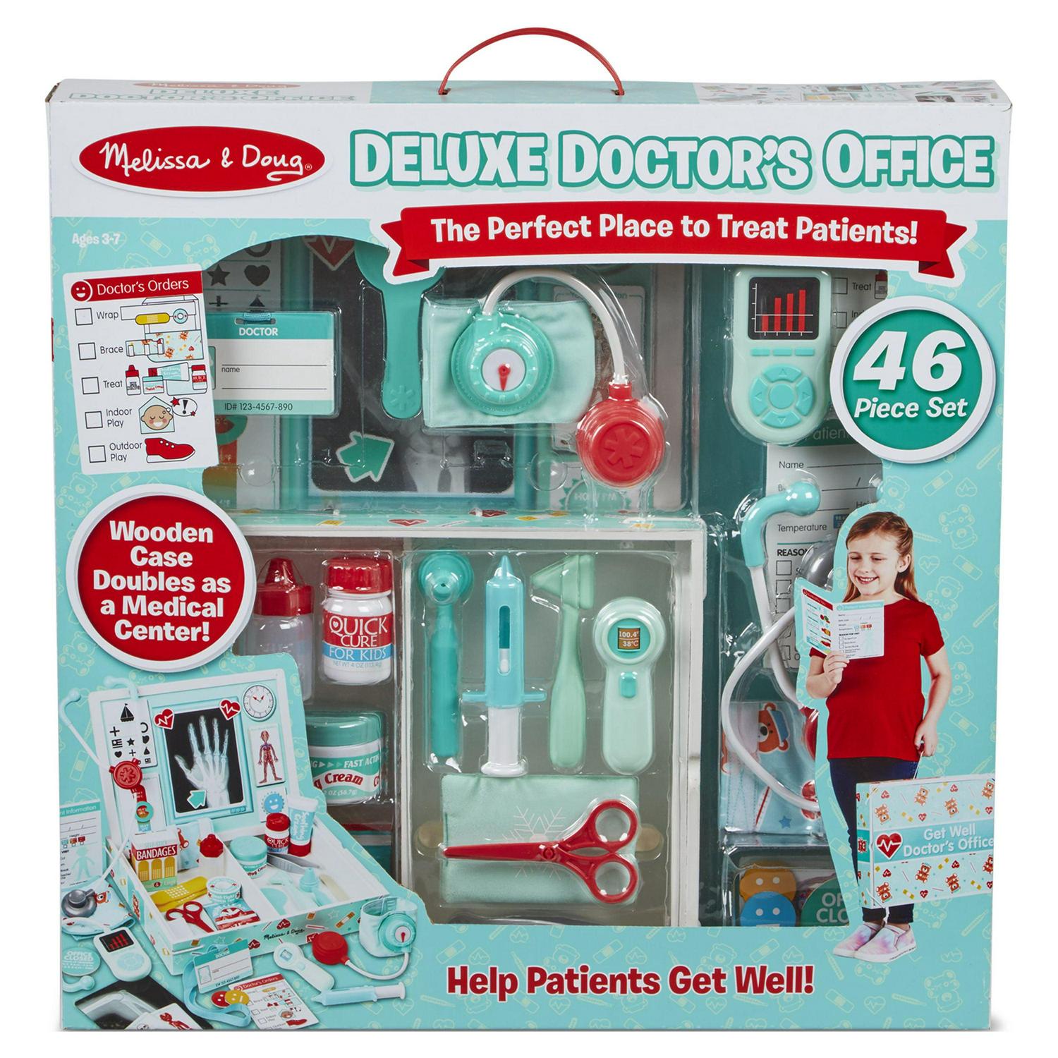 – 46-piece Melissa & Doug doctor s play set with wooden case that converts to a doctor s office; magnetic play board, and loads of realistic accessories for little doctors and nurses to examine and treat patients