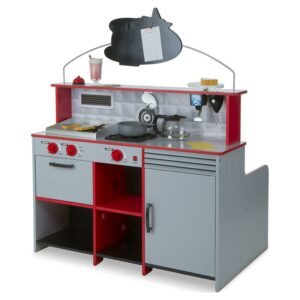 Its twice the fun at the Star Diner! This sturdy, double-sided wooden play space lets kids cook and serve from the kitchen side, and order and enjoy a meal on the booth side. The kitchen, with an extra-large oven, realistic burners and dials, a two-shelf refrigerator, and plenty of counter space has fun details like a drink dispenser and milkshake maker with mixing rod that can be pushed up and down. At the two-seat booth, customers three and older can spin the jukebox dial to choose their favorite type of music, then drop the included coin in the slotand the coin lands in a collection tray on the other side!